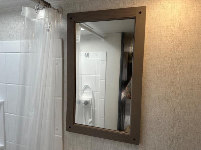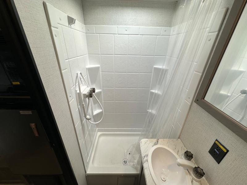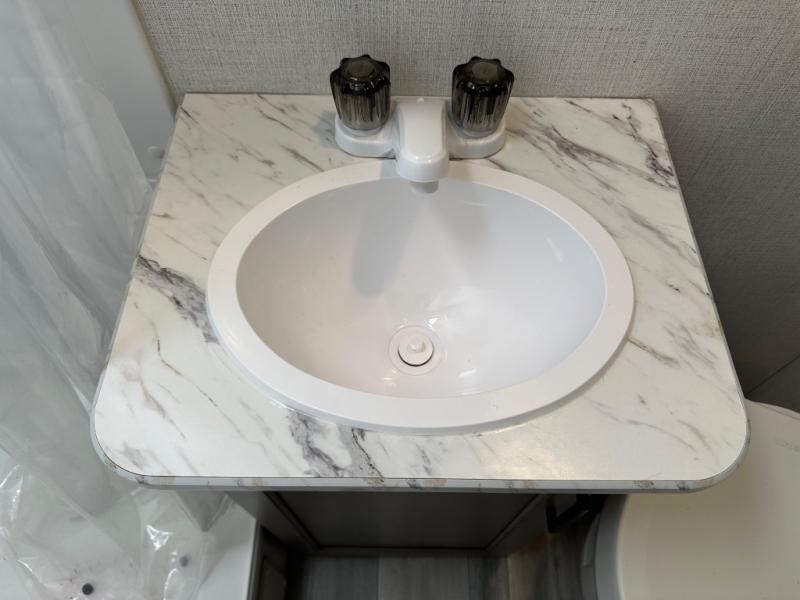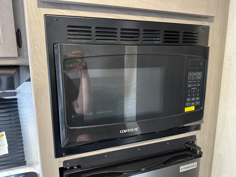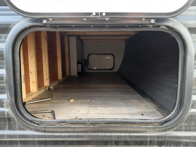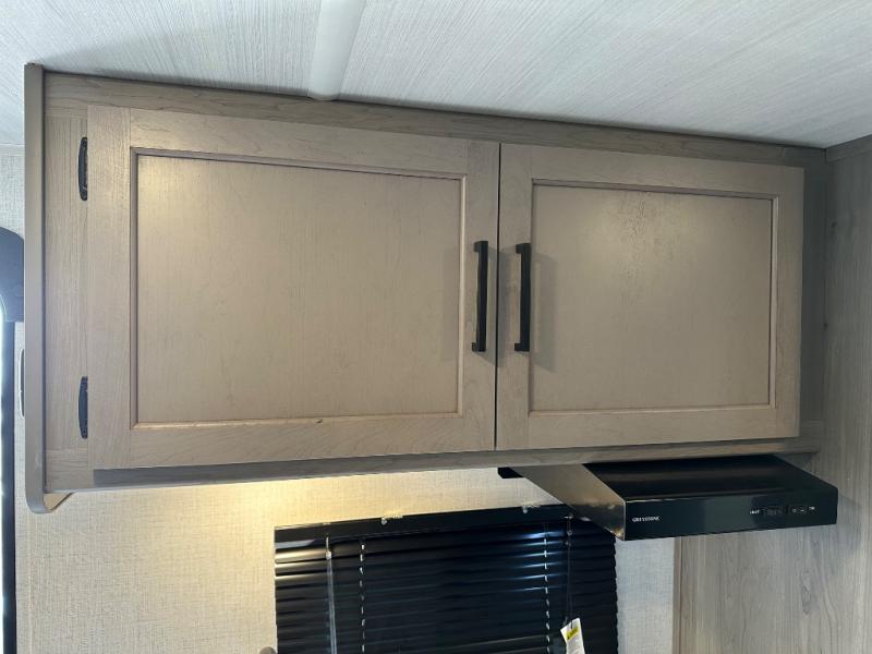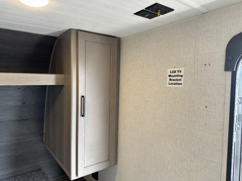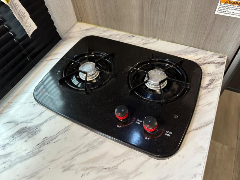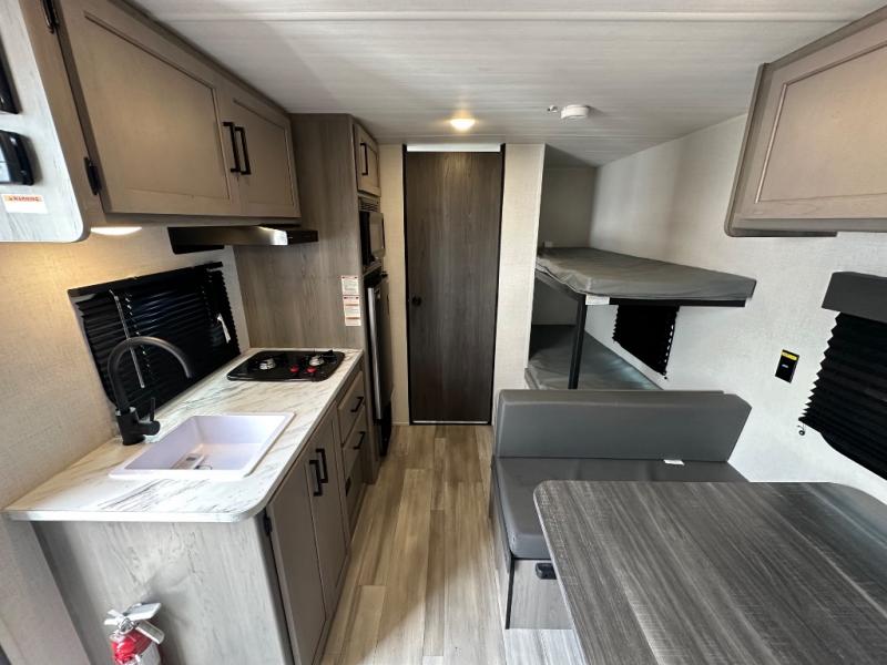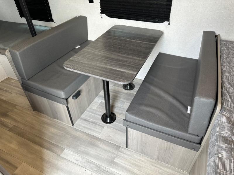 This trailer will fit perfectly for a group of five or less thanks to all the sleeping space! The owners will have a queen-size bed, and others can choose between the rear corner bunk beds or the booth dinette once set up for bedtime. There is a full bathroom for convenience when changing and getting cleaned up, a galley kitchen with a two burner cooktop plus a 3.3 cu. ft. refrigerator for the cold items. And you can stow your larger camping items in the exterior pass-through compartment.