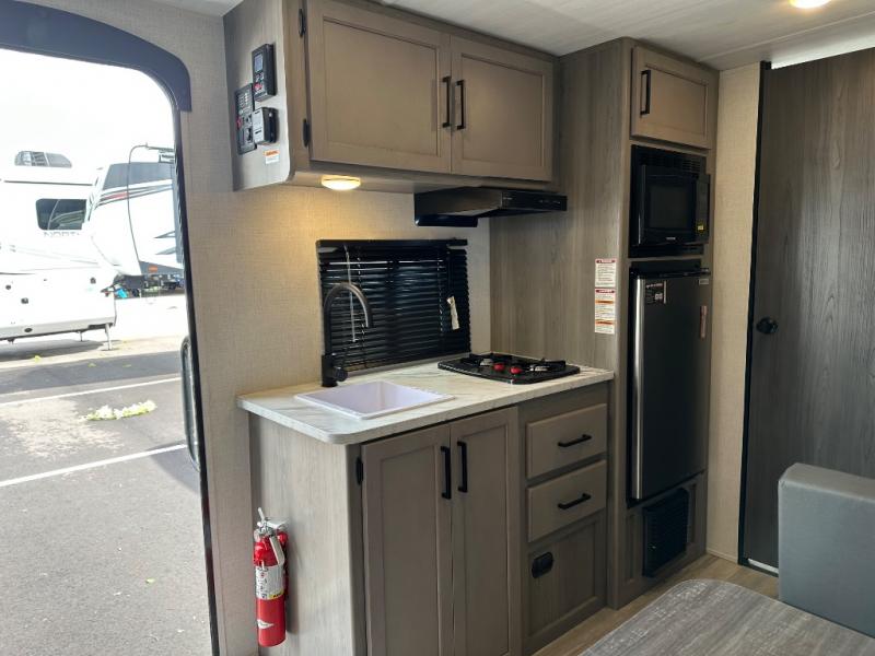 Open your horizons with the Hideout Sport Single Axle travel trailers by Keystone. They are compact, convenient, and lightweight; everything you're looking for in an RV! Each model features an aluminum exterior, tinted safety glass windows, and an I-beam frame with stamped steel cross-members and outriggers for added support. The interior includes blackout night shades for added privacy and real wood doors and drawers that will give a more at-home touch. The Girard tankless water heater is a feature you won't want to camp without, and the LED lighting will keep your space bright and open!