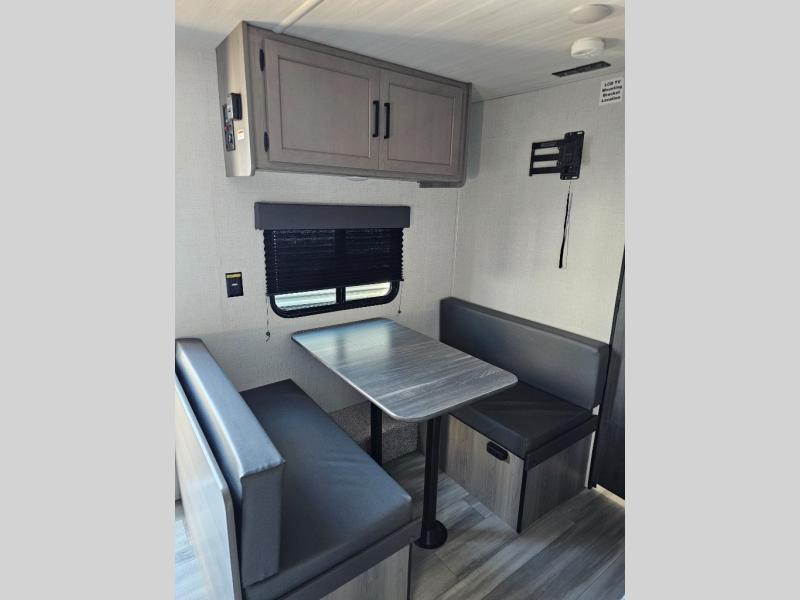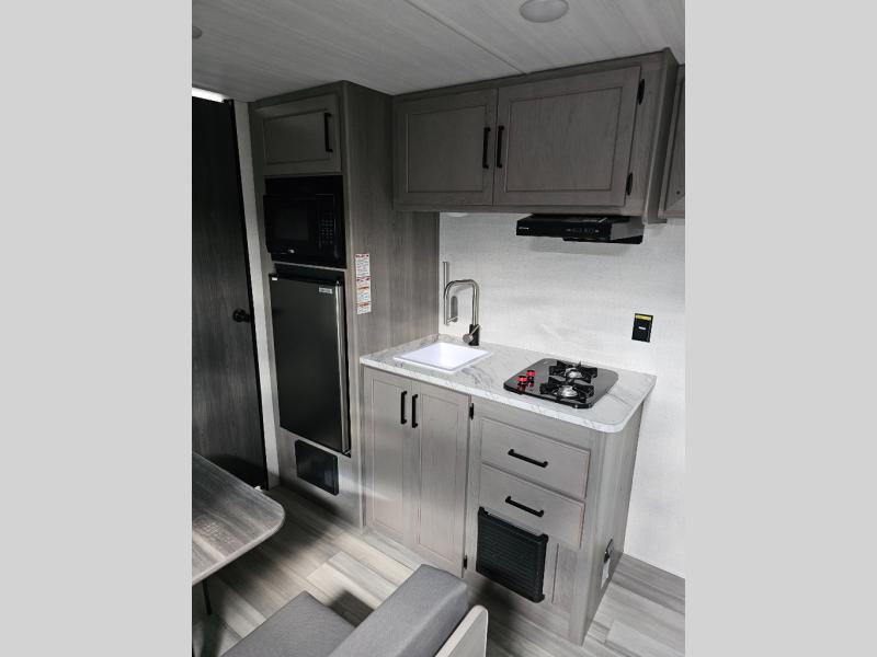 It's time to enjoy the great outdoors with family and friends at the campgrounds you like to meet everyone at! This trailer will allow three to four to camp comfortability with amenities such as a two burner cooktop, a 3.3 cu. ft. refrigerator, and a spacious rear full bathroom. The booth dinette offers a place to dine, read a book and even house an overnight guest. This model also includes a walk-around queen bed that will make your space feel a little more like home!