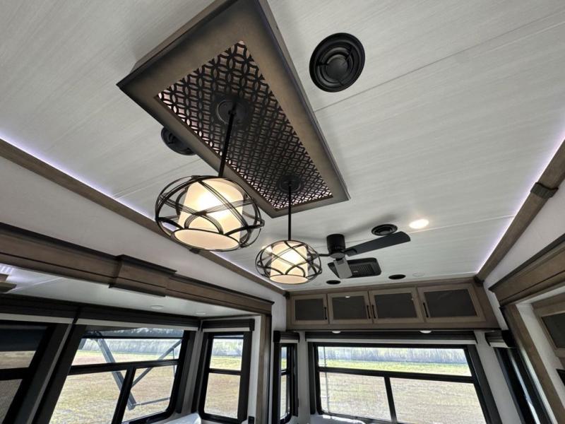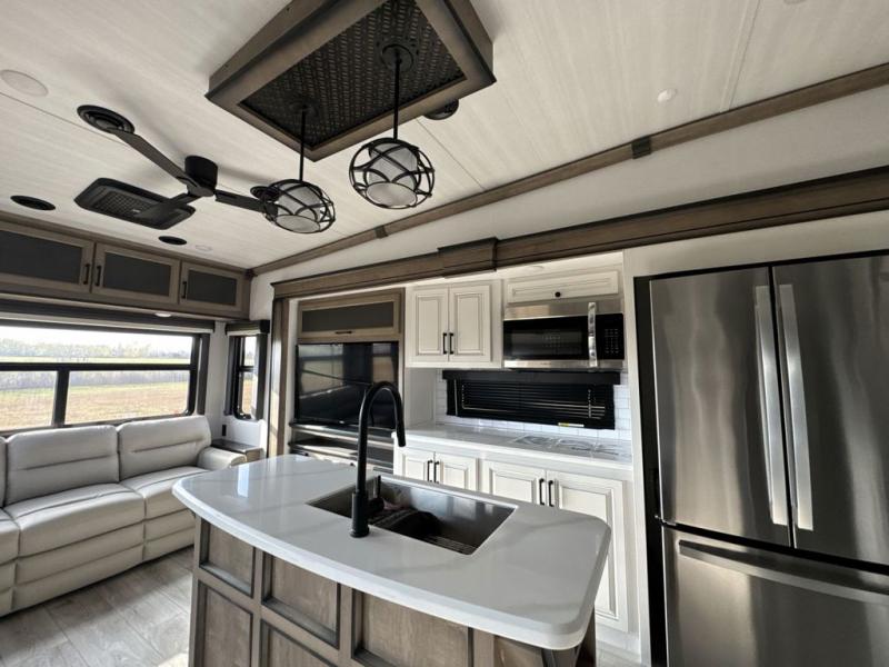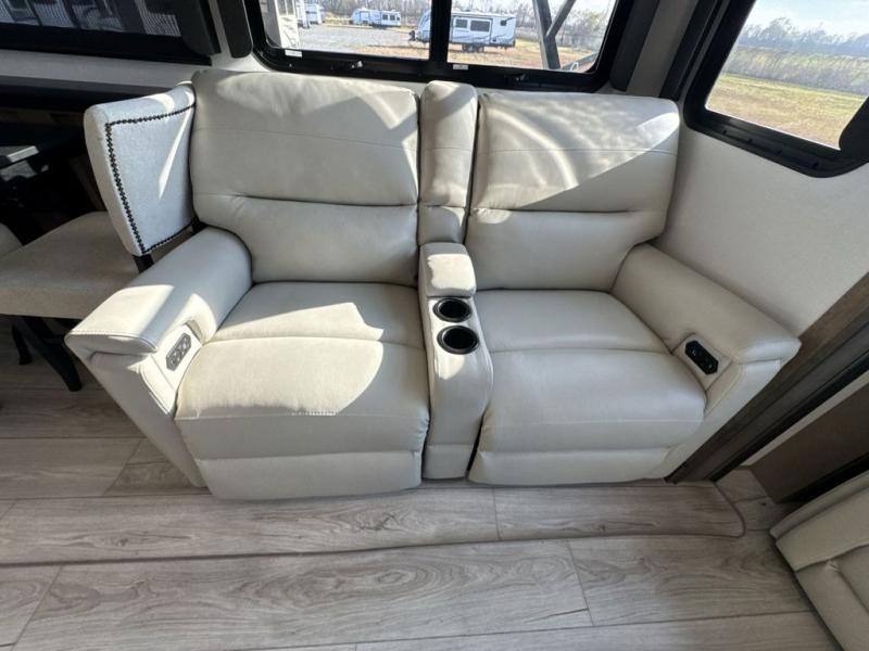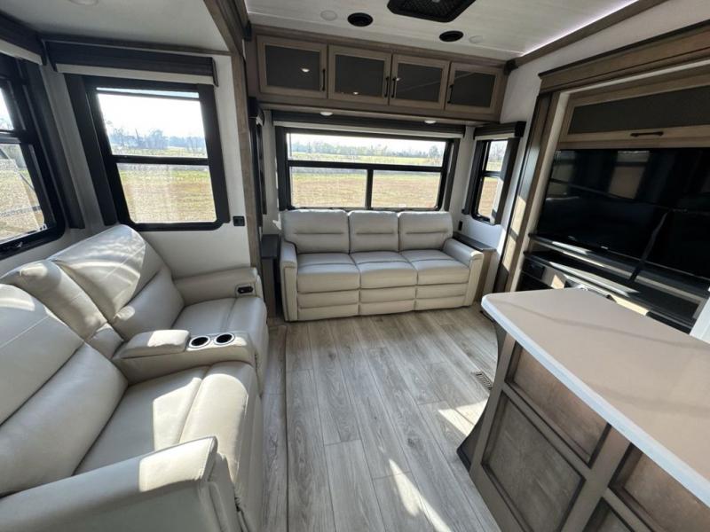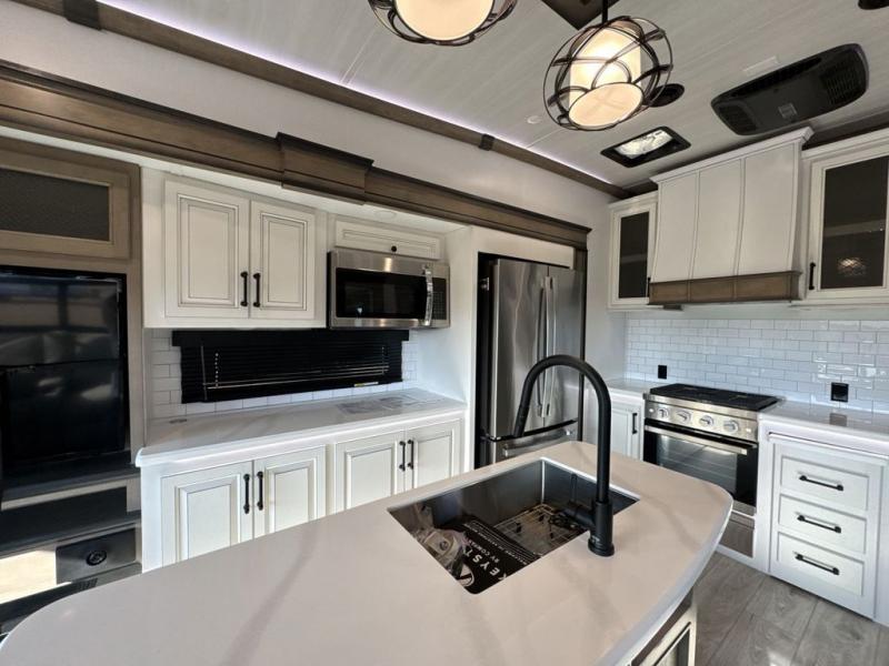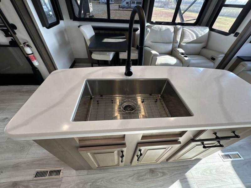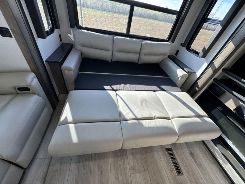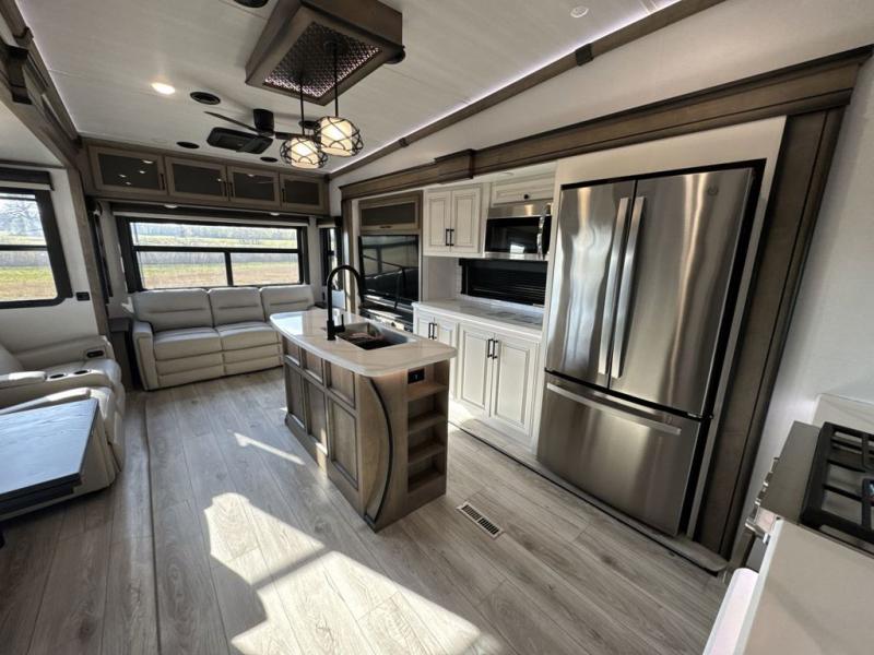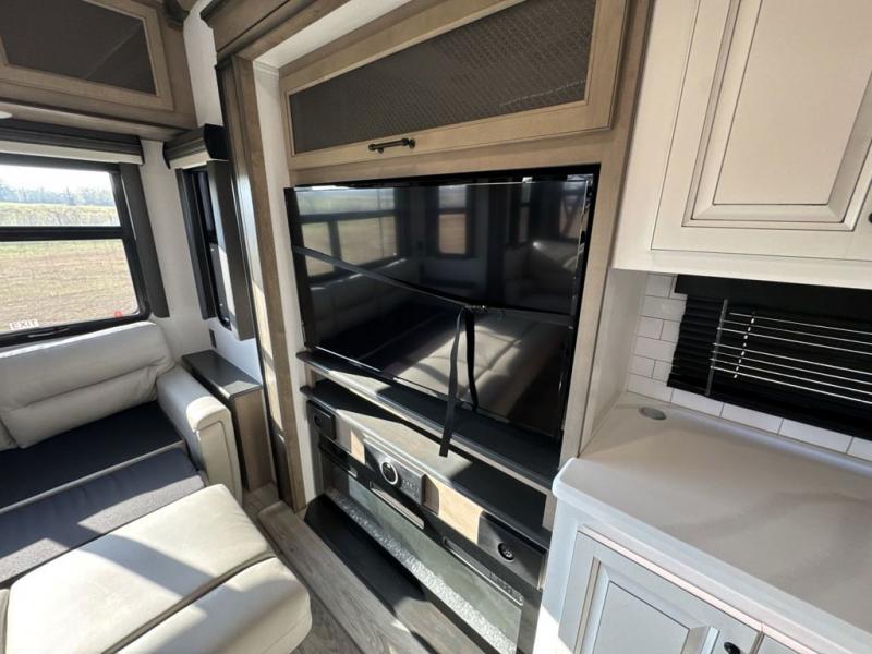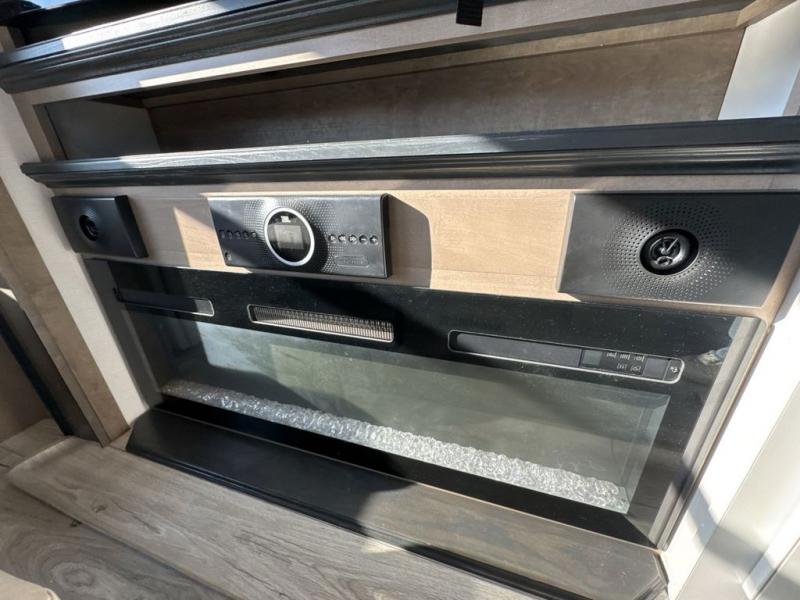 Luxury abounds throughout this fifth wheel! Starting in the kitchen with the island, two pull out pantries with extra countertop space above it, a residential range with hidden storage, and a pull out countertop for more prepping space. The full bathroom has a 48" x 30" fiberglass shower with a seat, decorative glass enclosure, and skylight above it for more natural lighting as two get ready at once with the dual sink vanity. Sleep like a baby in the front private bedroom on the king bed slide with storage underneath and keep your clothes looking their best with the front closet that has a clothing hamper and stackable washer and dryer prep. The rear living area offers true relaxation with a hide-a-bed sofa and power theater seating across from the entertainment center with a 5,000 BTU decorative fireplace heater and 50" Smart TV to watch your favorite movies!