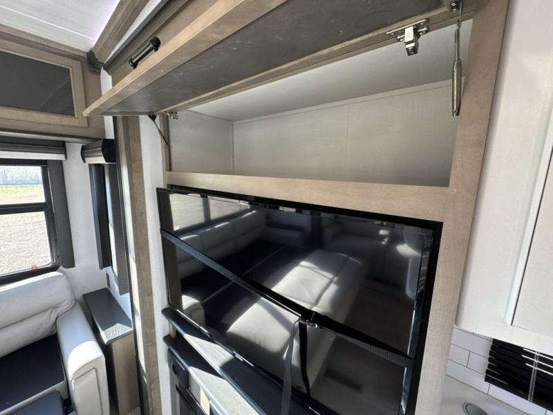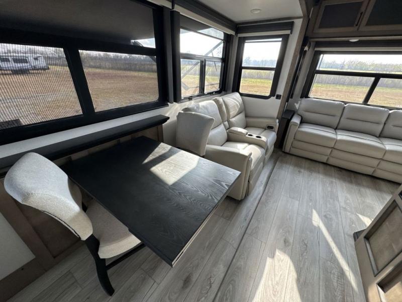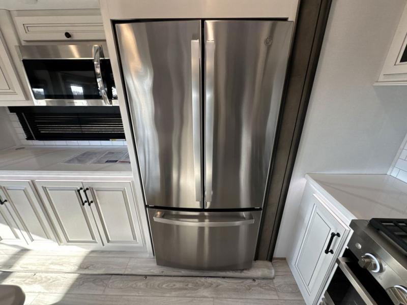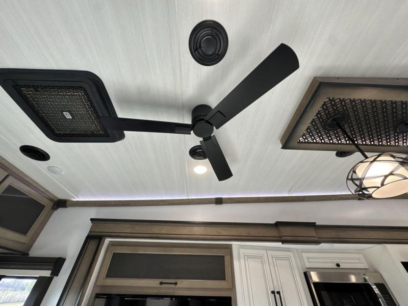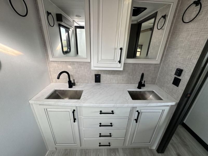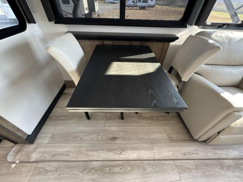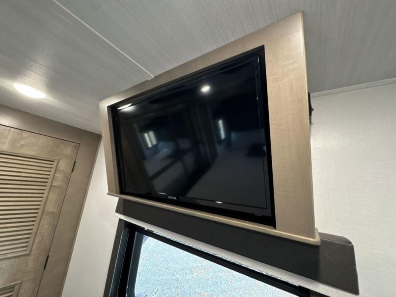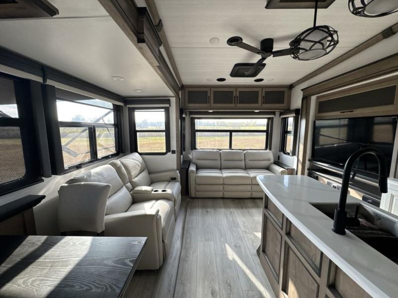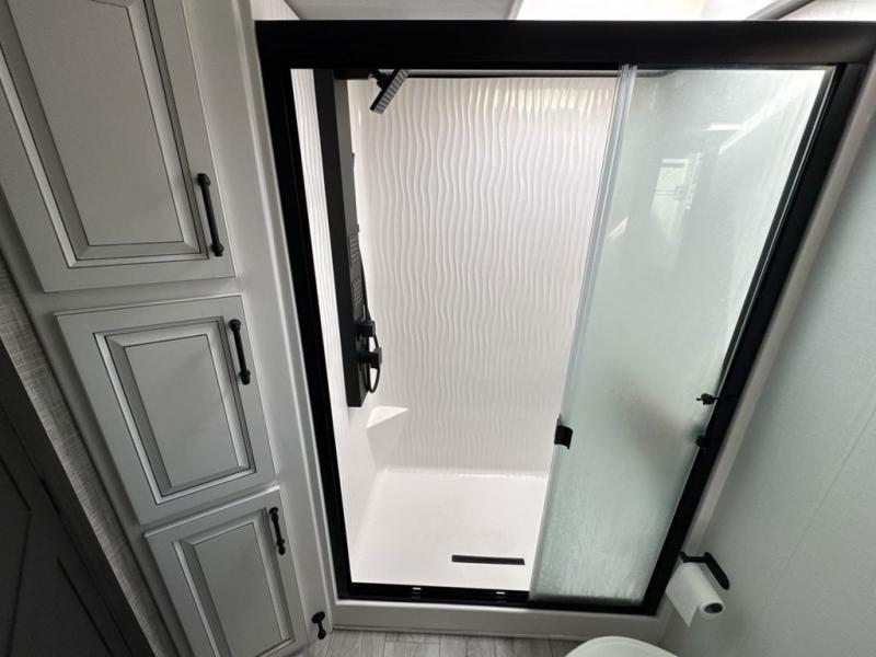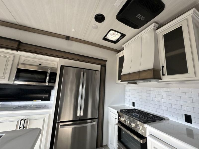 Luxury abounds throughout this fifth wheel! Starting in the kitchen with the island, two pull out pantries with extra countertop space above it, a residential range with hidden storage, and a pull out countertop for more prepping space. The full bathroom has a 48" x 30" fiberglass shower with a seat, decorative glass enclosure, and skylight above it for more natural lighting as two get ready at once with the dual sink vanity. Sleep like a baby in the front private bedroom on the king bed slide with storage underneath and keep your clothes looking their best with the front closet that has a clothing hamper and stackable washer and dryer prep. The rear living area offers true relaxation with a hide-a-bed sofa and power theater seating across from the entertainment center with a 5,000 BTU decorative fireplace heater and 50" Smart TV to watch your favorite movies!