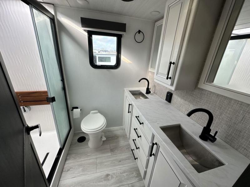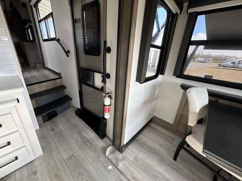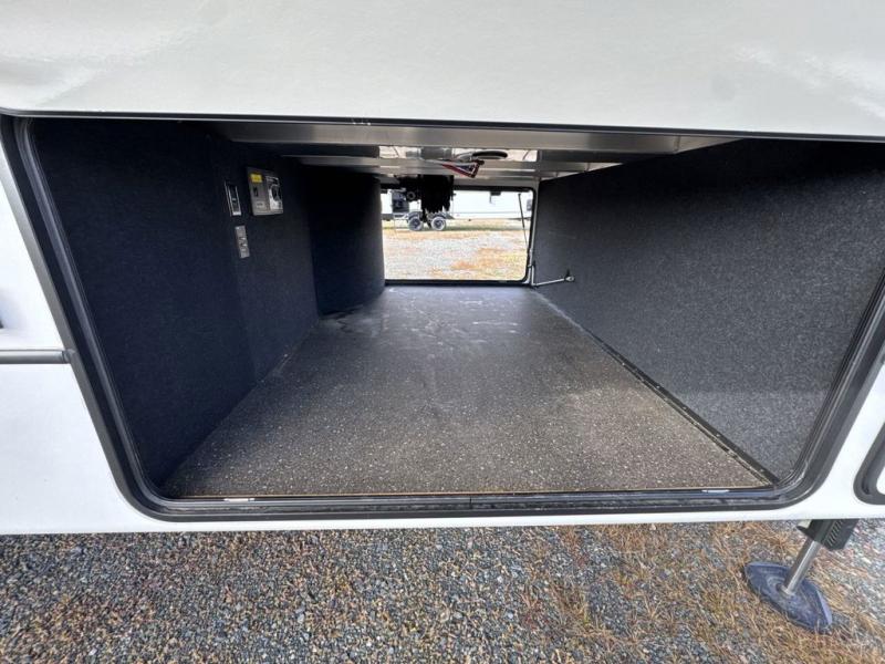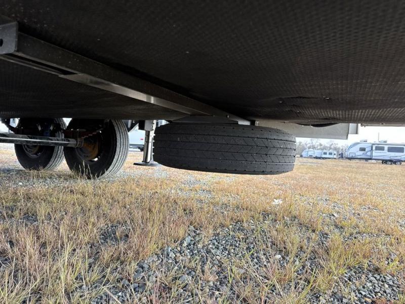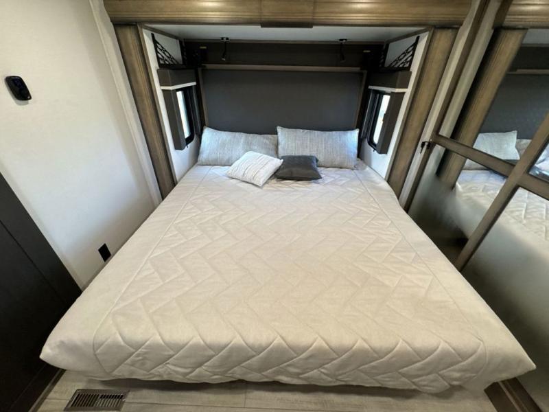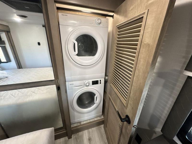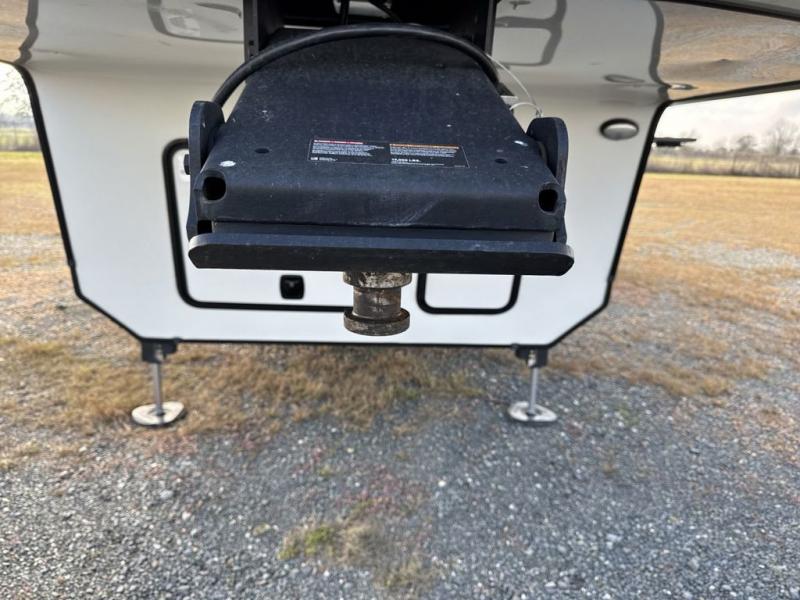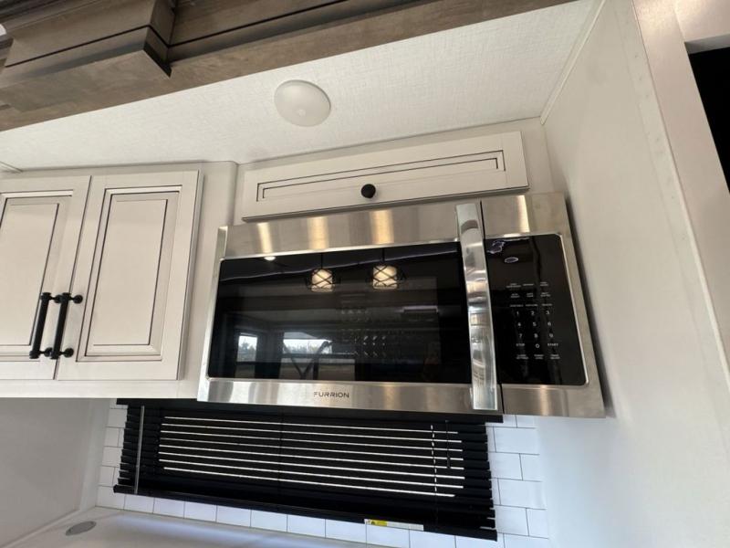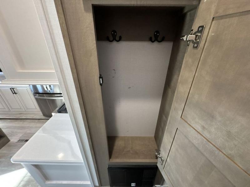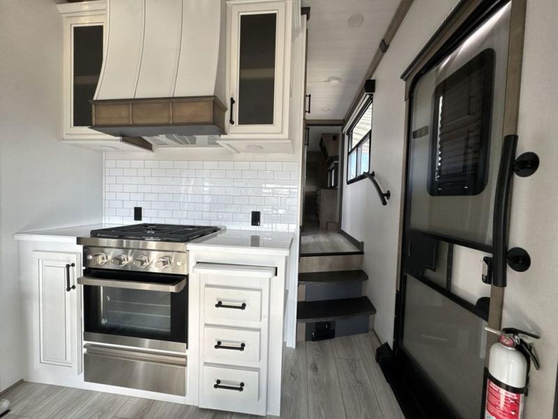 Luxury abounds throughout this fifth wheel! Starting in the kitchen with the island, two pull out pantries with extra countertop space above it, a residential range with hidden storage, and a pull out countertop for more prepping space. The full bathroom has a 48" x 30" fiberglass shower with a seat, decorative glass enclosure, and skylight above it for more natural lighting as two get ready at once with the dual sink vanity. Sleep like a baby in the front private bedroom on the king bed slide with storage underneath and keep your clothes looking their best with the front closet that has a clothing hamper and stackable washer and dryer prep. The rear living area offers true relaxation with a hide-a-bed sofa and power theater seating across from the entertainment center with a 5,000 BTU decorative fireplace heater and 50" Smart TV to watch your favorite movies!