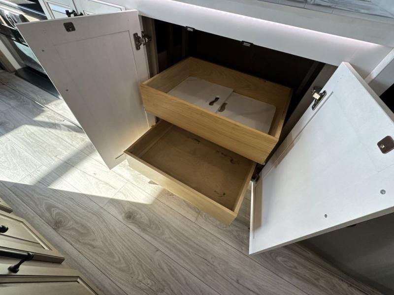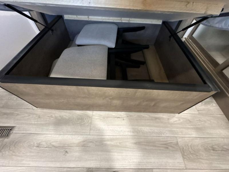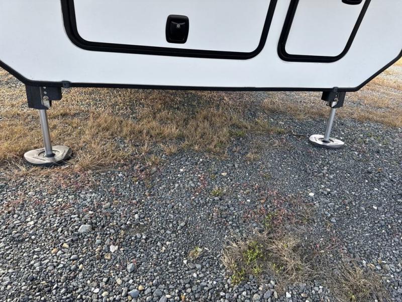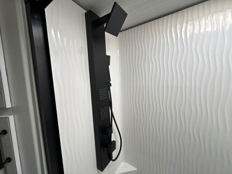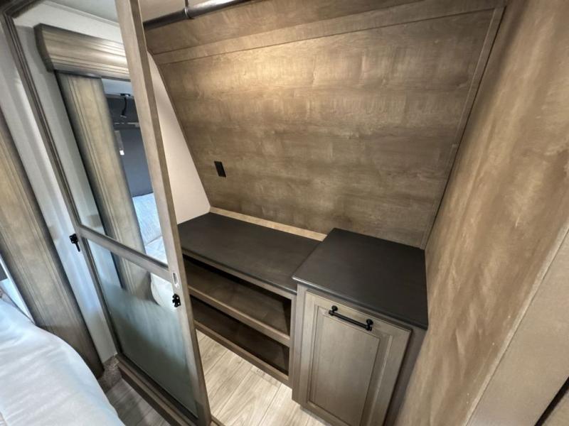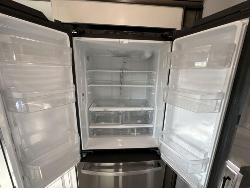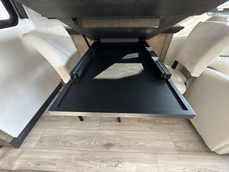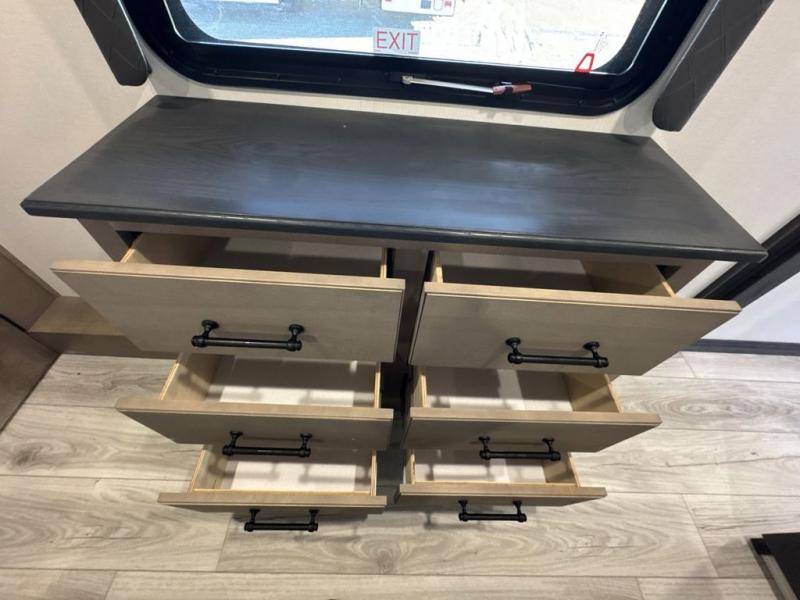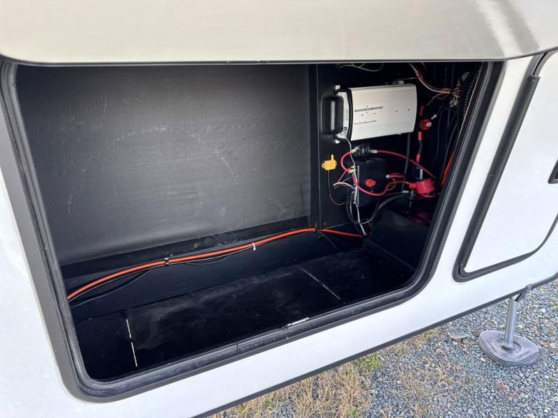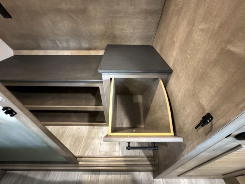 Luxury abounds throughout this fifth wheel! Starting in the kitchen with the island, two pull out pantries with extra countertop space above it, a residential range with hidden storage, and a pull out countertop for more prepping space. The full bathroom has a 48" x 30" fiberglass shower with a seat, decorative glass enclosure, and skylight above it for more natural lighting as two get ready at once with the dual sink vanity. Sleep like a baby in the front private bedroom on the king bed slide with storage underneath and keep your clothes looking their best with the front closet that has a clothing hamper and stackable washer and dryer prep. The rear living area offers true relaxation with a hide-a-bed sofa and power theater seating across from the entertainment center with a 5,000 BTU decorative fireplace heater and 50" Smart TV to watch your favorite movies!