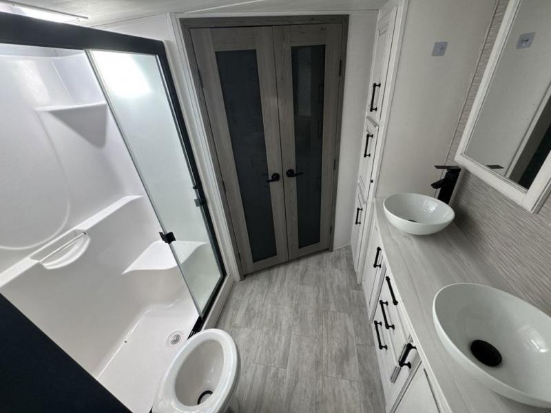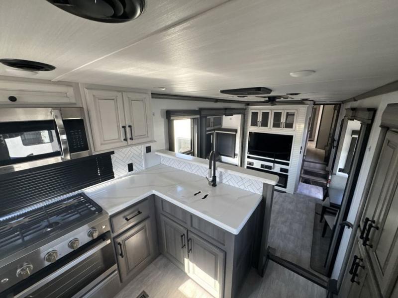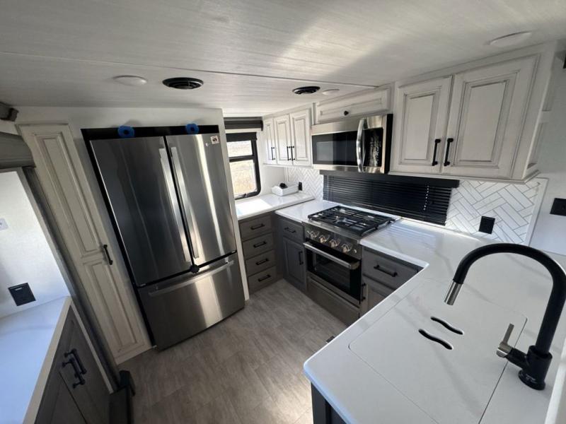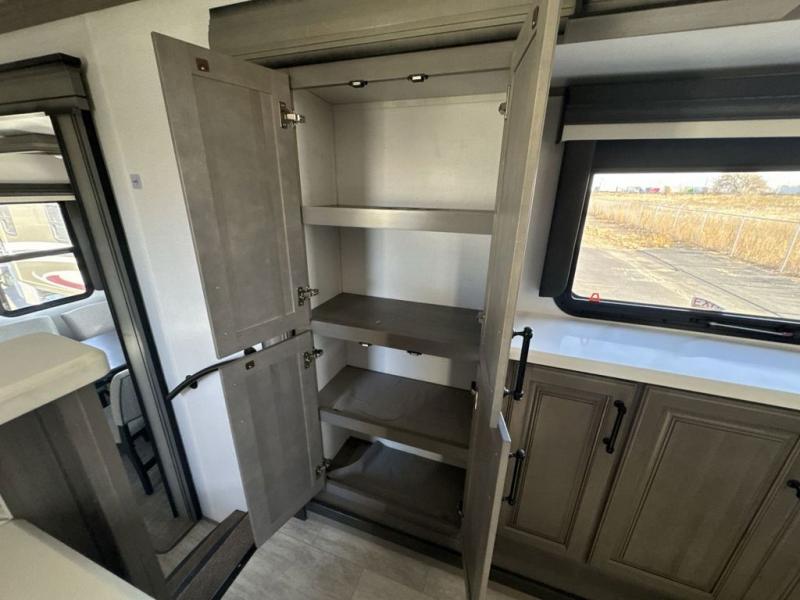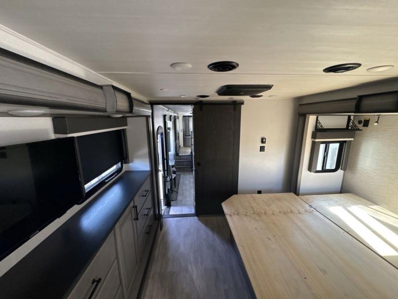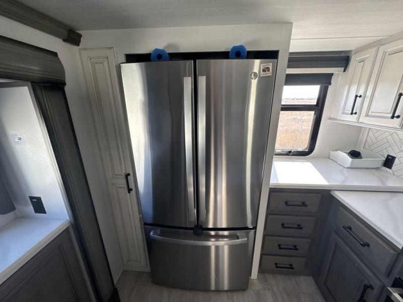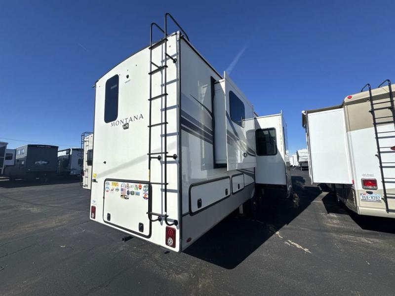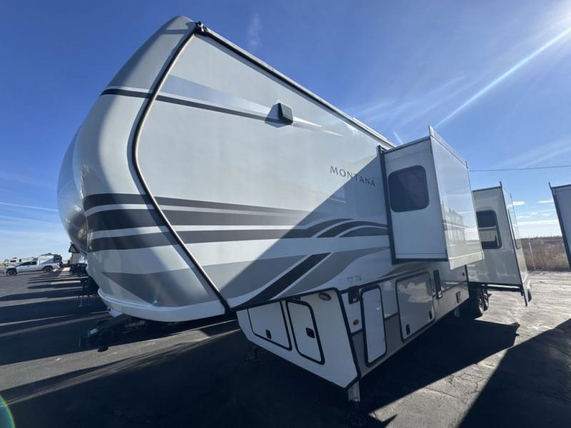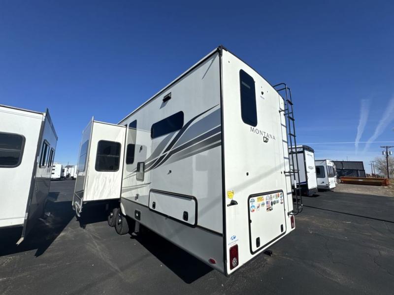 The perfect RV when you like to take "home"' with you when you travel! This Montana fifth wheel gives you the space you want and it feels like home with plenty of features to love and keep you comfortable when you are out enjoying your adventures. Five slides in total give each space plenty of room, the raised rear kitchen has everything you need to cook up meals and snacks just like at home. An 18 cu. ft. residential refrigerator with an ice maker, convection microwave oven and large sink, plus pantry space will make any chef happy. The mid-coach space just inside the door features a living room and half bath for convenience. There is also a dining table and four chairs within the roadside slide. Step up in front through a sliding barn door to a double slide space with a king bed and dresser. A second sliding barn door leads into the front spacious master bath featuring dual sinks, a 48" x 30" shower, and a large walk-in wardrobe with washer and dryer prep!