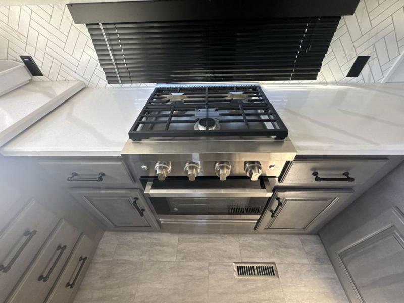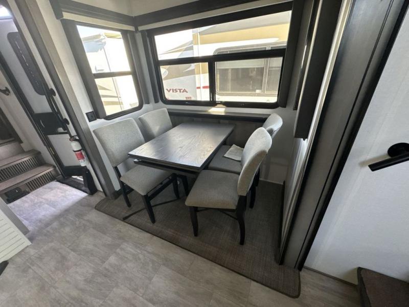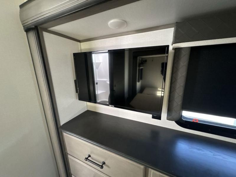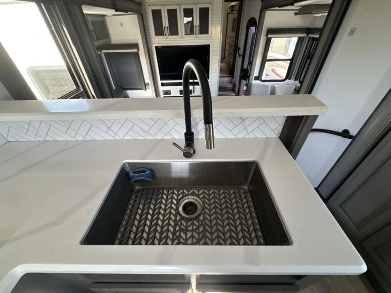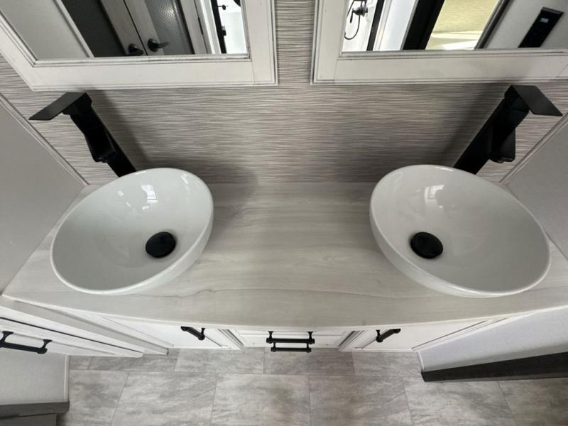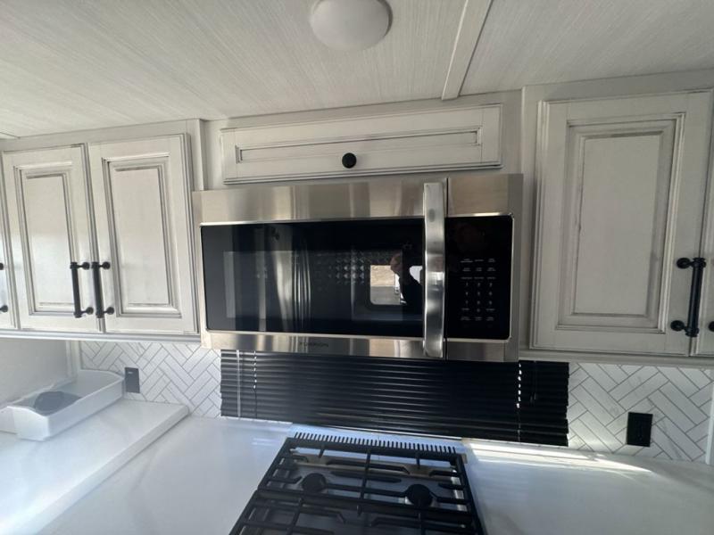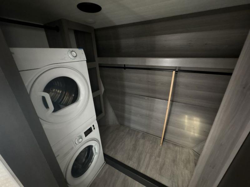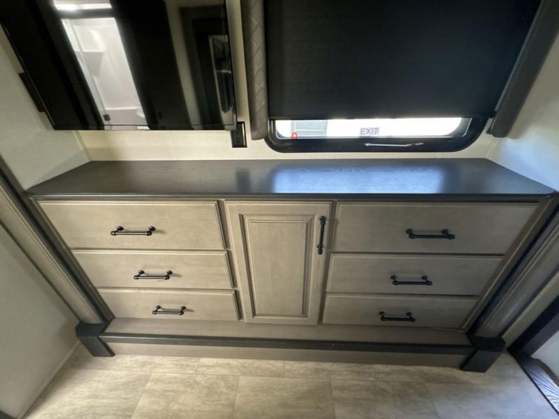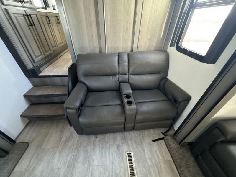 The perfect RV when you like to take "home"' with you when you travel! This Montana fifth wheel gives you the space you want and it feels like home with plenty of features to love and keep you comfortable when you are out enjoying your adventures. Five slides in total give each space plenty of room, the raised rear kitchen has everything you need to cook up meals and snacks just like at home. An 18 cu. ft. residential refrigerator with an ice maker, convection microwave oven and large sink, plus pantry space will make any chef happy. The mid-coach space just inside the door features a living room and half bath for convenience. There is also a dining table and four chairs within the roadside slide. Step up in front through a sliding barn door to a double slide space with a king bed and dresser. A second sliding barn door leads into the front spacious master bath featuring dual sinks, a 48" x 30" shower, and a large walk-in wardrobe with washer and dryer prep!