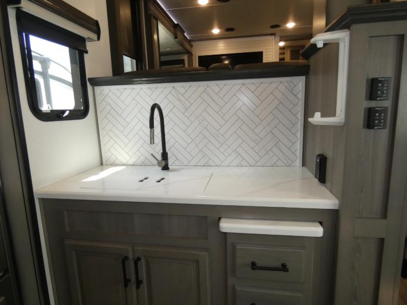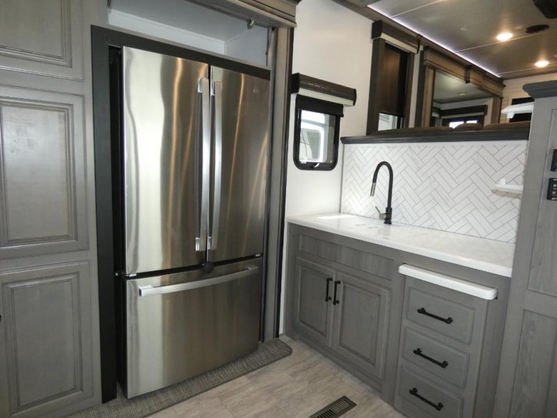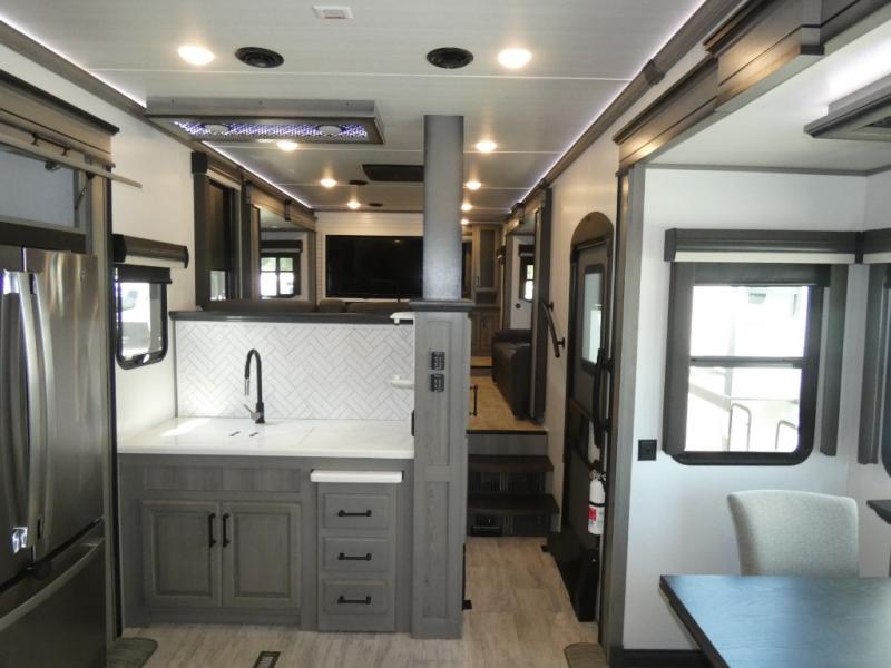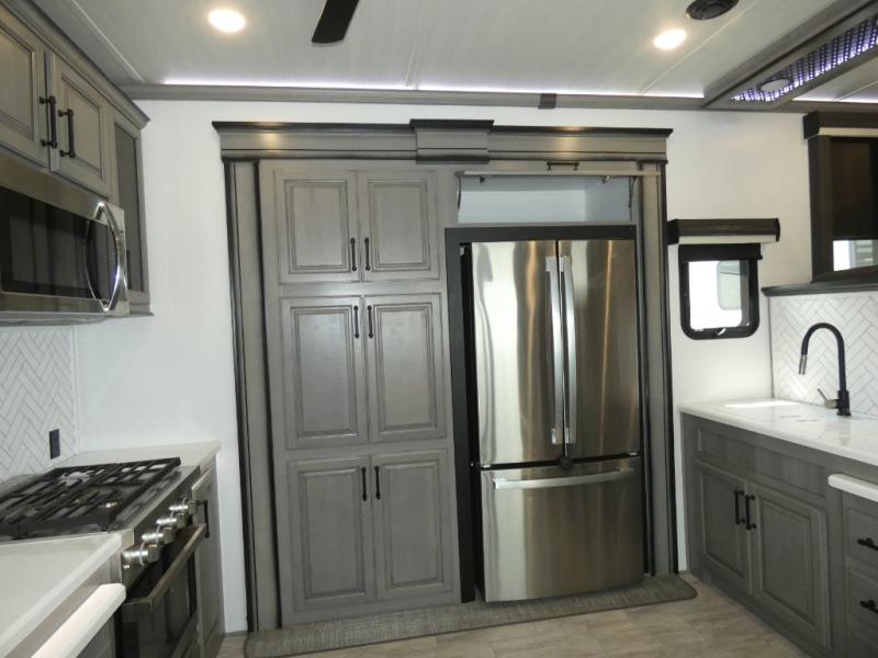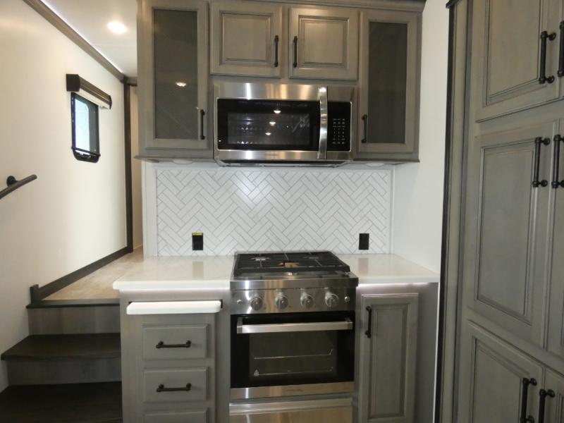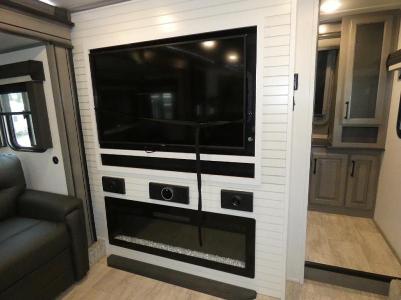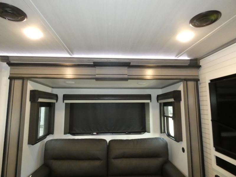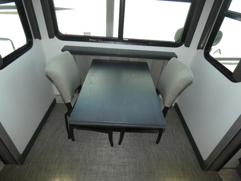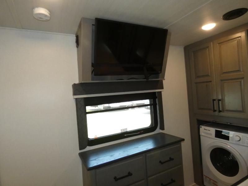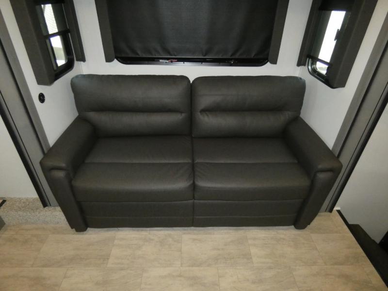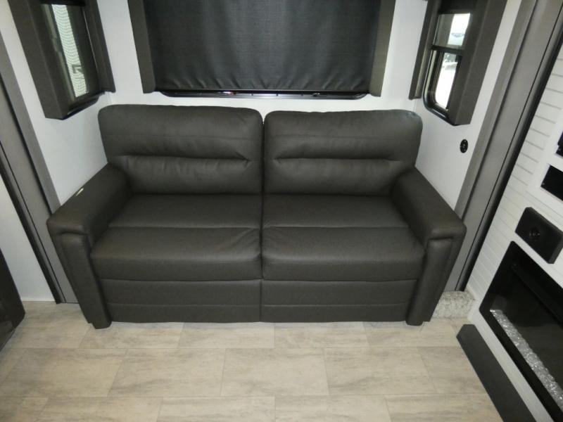 Life will be easier at the campground in this fifth wheel with five slides and an outdoor kitchen! The spacious full bathroom has a 48" x 30" fiberglass shower with a seat and skylight above, a linen closet to keep your towels close, and a stylish barn door. The bedroom has a king bed slide with storage underneath across from a dresser with a 32" HDTV, as well as a large closet and an additional closet with stackable washer and dryer prep. The chef can prepare their best meals with extra counter space provided by the roll-out counters and the glass top range with a convection microwave, plus there is a pantry and a free standing dinette with storage to enjoy your meals at. The front of this fifth wheel is where it stands out above the rest; there is a spacious living area with two hide-a-bed sofas, power theater seating, and a private front office, complete with a desk, storage, and counter space!