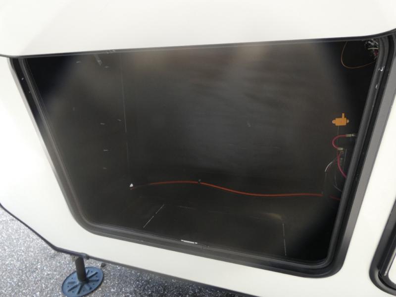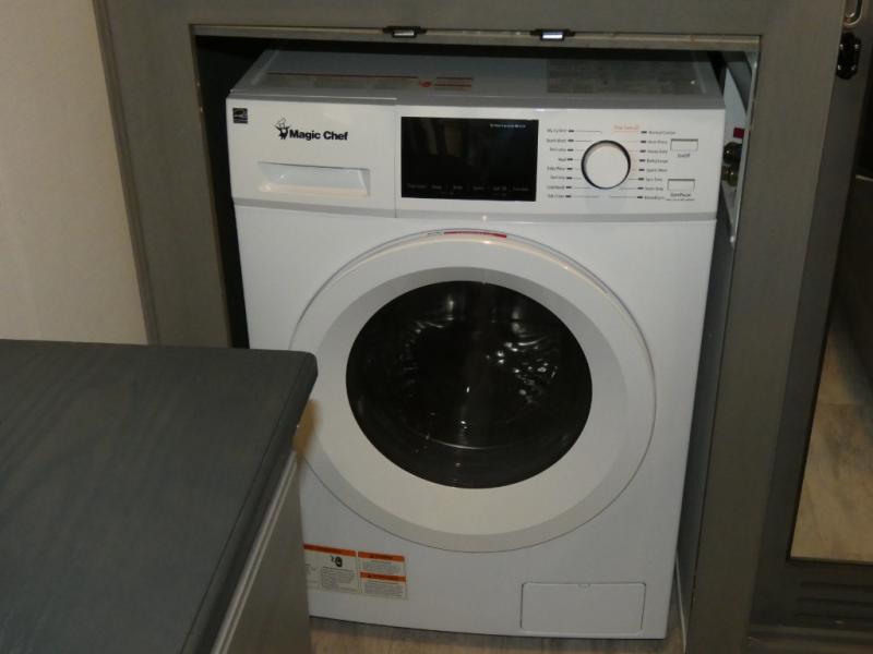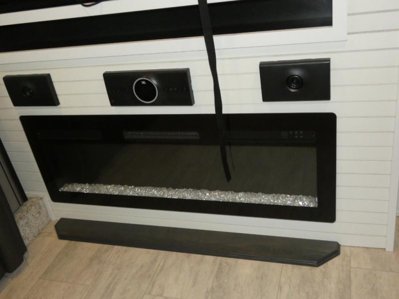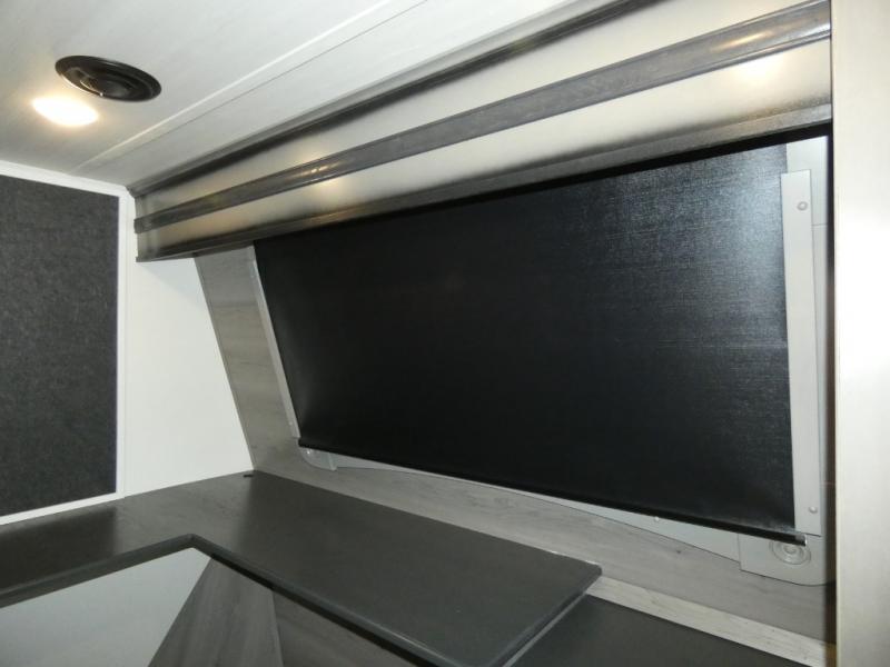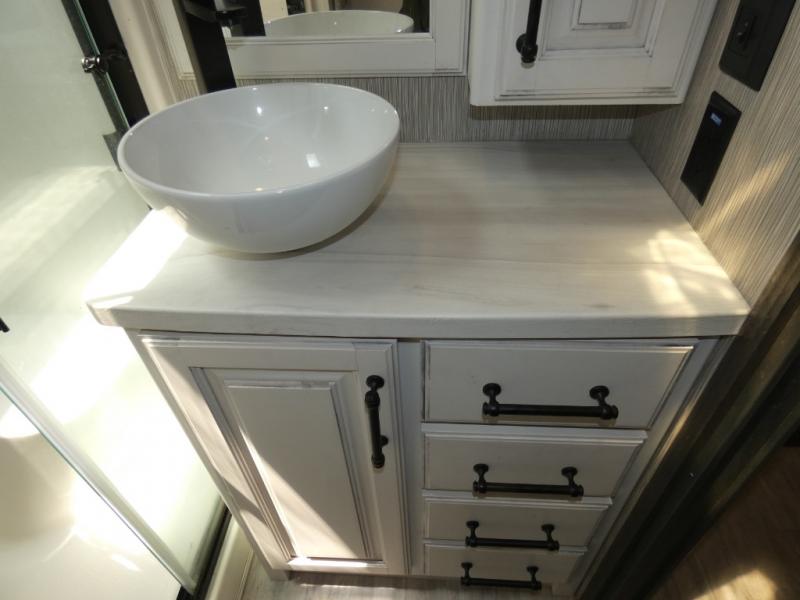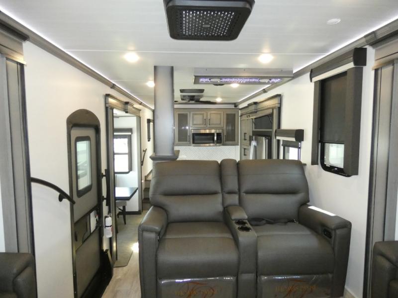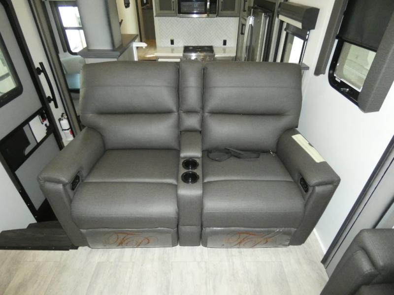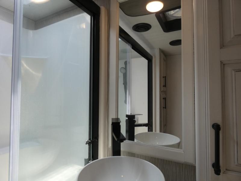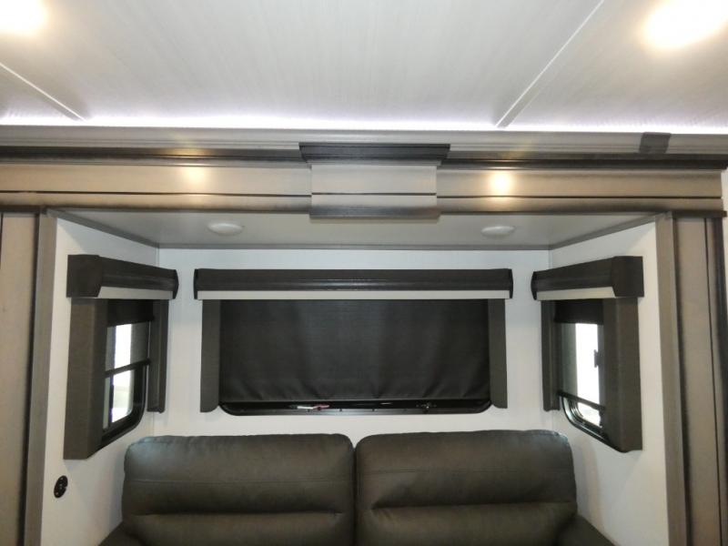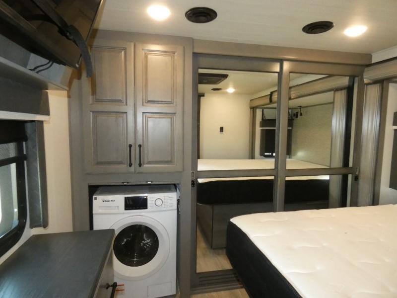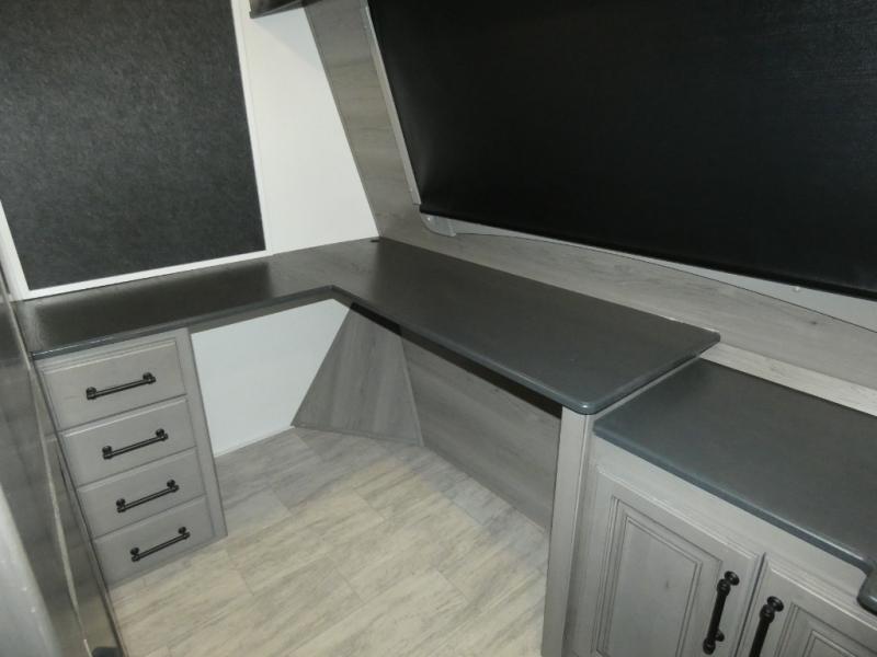 Life will be easier at the campground in this fifth wheel with five slides and an outdoor kitchen! The spacious full bathroom has a 48" x 30" fiberglass shower with a seat and skylight above, a linen closet to keep your towels close, and a stylish barn door. The bedroom has a king bed slide with storage underneath across from a dresser with a 32" HDTV, as well as a large closet and an additional closet with stackable washer and dryer prep. The chef can prepare their best meals with extra counter space provided by the roll-out counters and the glass top range with a convection microwave, plus there is a pantry and a free standing dinette with storage to enjoy your meals at. The front of this fifth wheel is where it stands out above the rest; there is a spacious living area with two hide-a-bed sofas, power theater seating, and a private front office, complete with a desk, storage, and counter space!