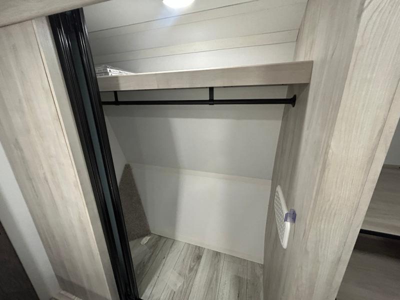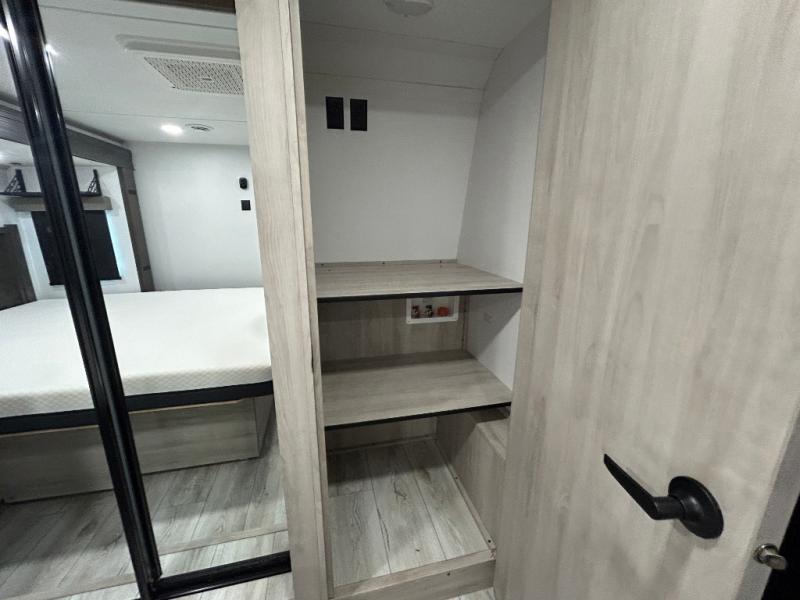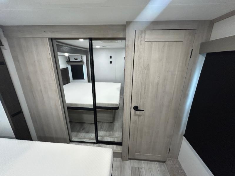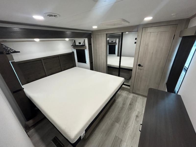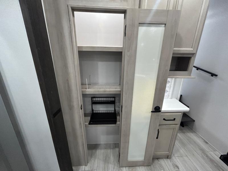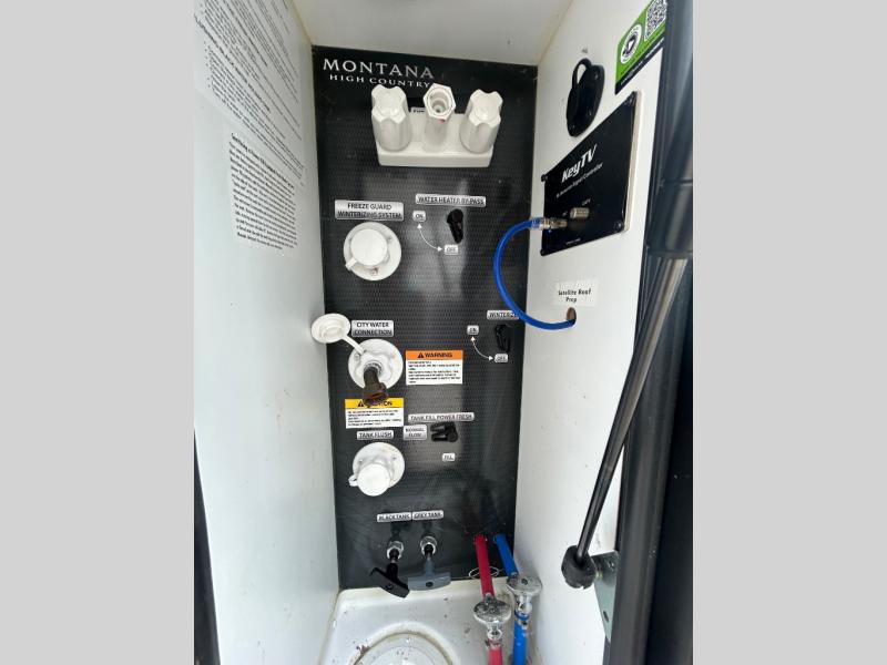 You'll be able to love this Montana High Country fifth wheel for years and years and years! The separated living room in the back feels just like your living room at home with its power theater seating, two hide-a-bed sofas, fireplace, and 50" LCD TV. The kitchen is also very residential with its three-burner range with glass top, residential microwave, residential refrigerator, pantry, and coffee station. When you enter this unit, there is a coat closet for you to place your boots and hats in, and for more clothing storage, just use the under-bed storage up in the private bedroom.