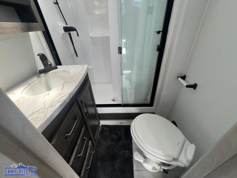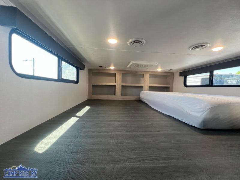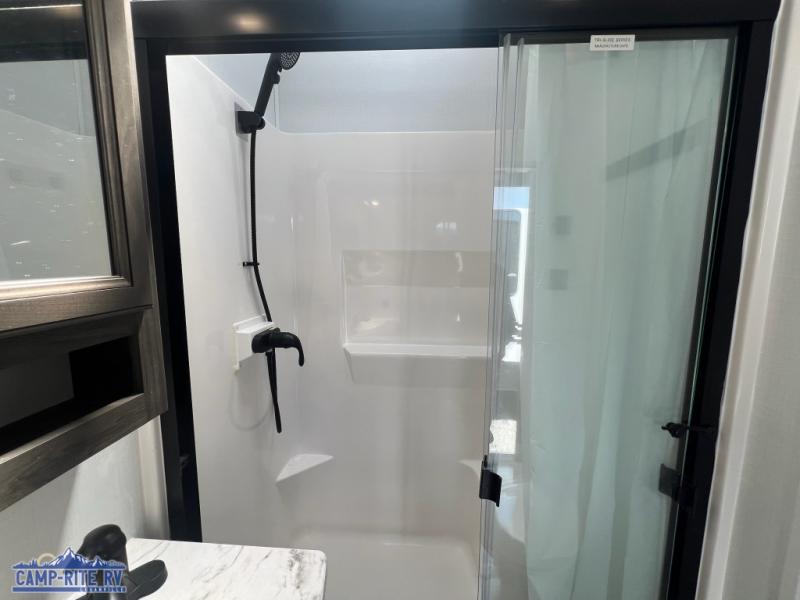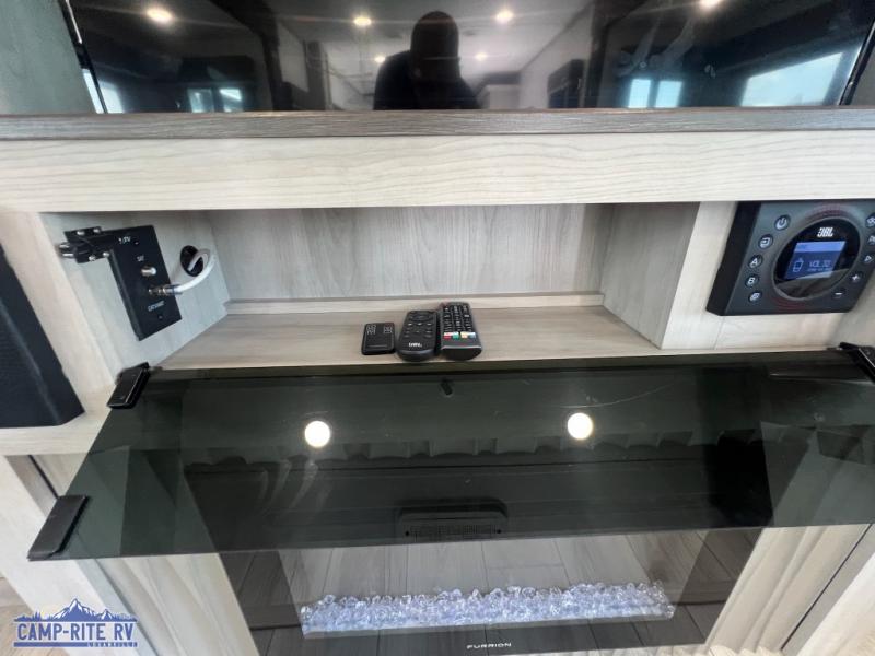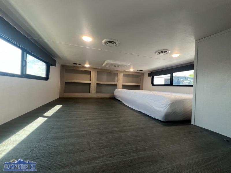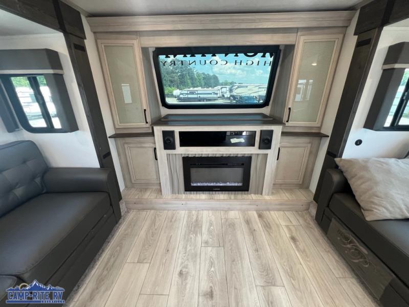 Include all of your favorite people on your next adventure in this Montana High Country fifth wheel! Not only is there a rear private bedroom with a king-size bed for you, but there is also a loft above with stairs that take you to the bunk mats. Now your kids will have their own space too. You can even host a few other travelers up front in the separate living room on the two hide-a-bed sofas. This area will be perfect for cozy sleeping because of the fireplace, and you can even watch a movie as you drift off to sleep because of the 50" LCD TV too. The full bathroom has a pivot-hinge door and a 48" x 30" shower with seat, and the kitchen has a breakfast bar that you can sit at to eat your cereal each morning