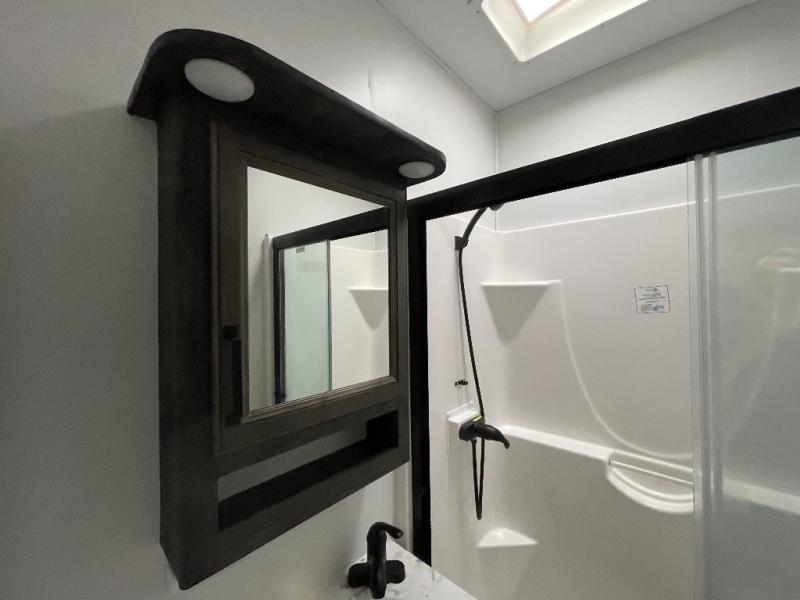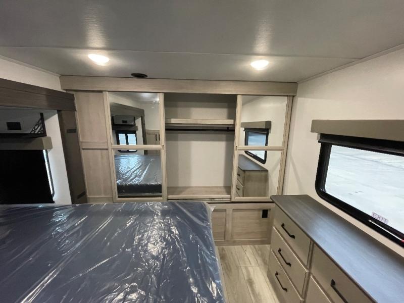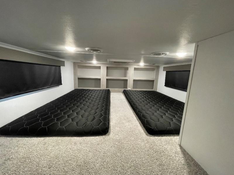 Include all of your favorite people on your next adventure in this Montana High Country fifth wheel! Not only is there a rear private bedroom with a king-size bed for you, but there is also a loft above with stairs that take you to the bunk mats. Now your kids will have their own space too. You can even host a few other travelers up front in the separate living room on the two hide-a-bed sofas. This area will be perfect for cozy sleeping because of the fireplace, and you can even watch a movie as you drift off to sleep because of the 50" LCD TV too. The full bathroom has a pivot-hinge door and a 48" x 30" shower with seat, and the kitchen has a breakfast bar that you can sit at to eat your cereal each morning