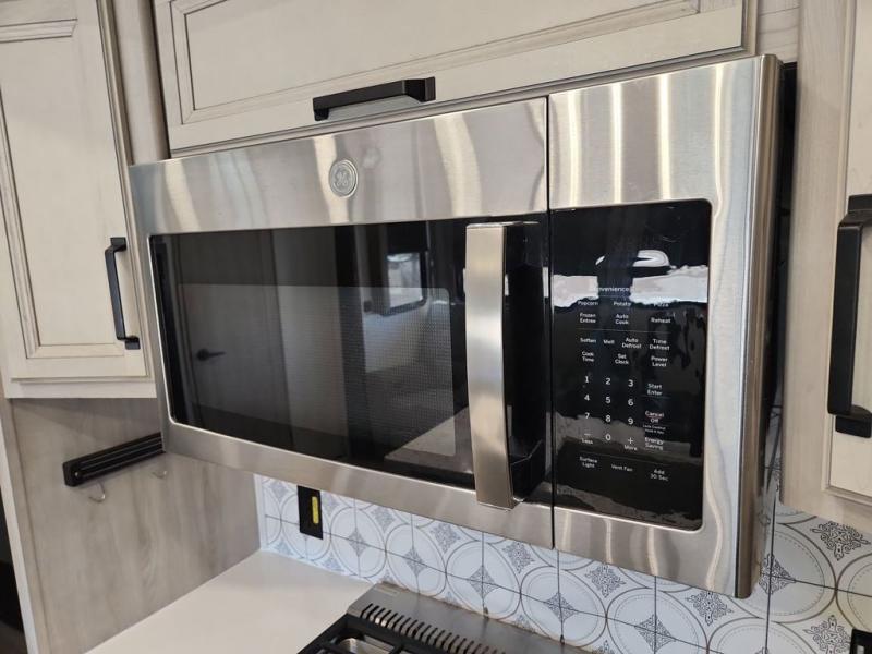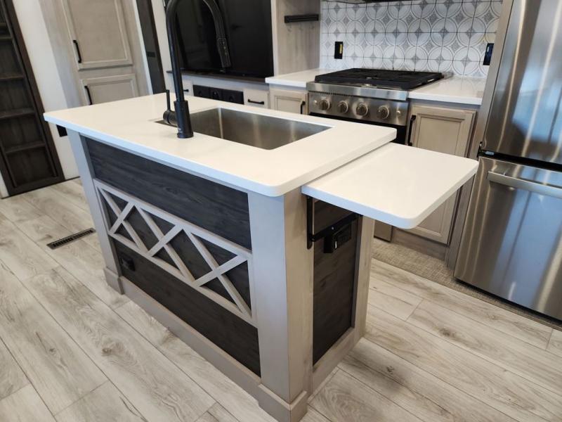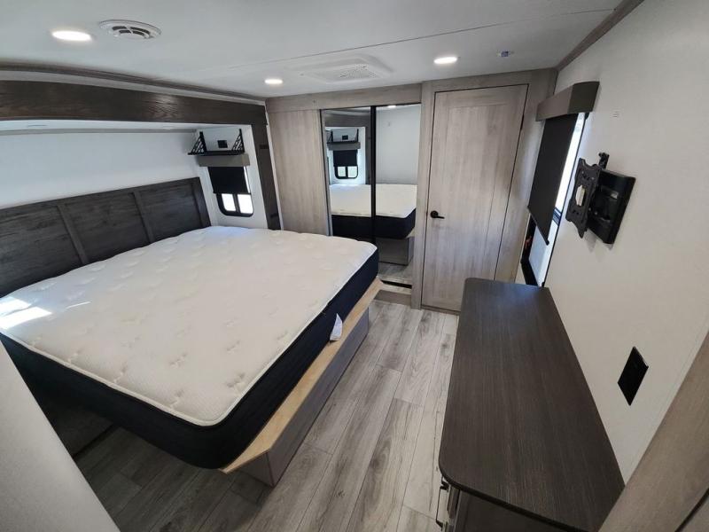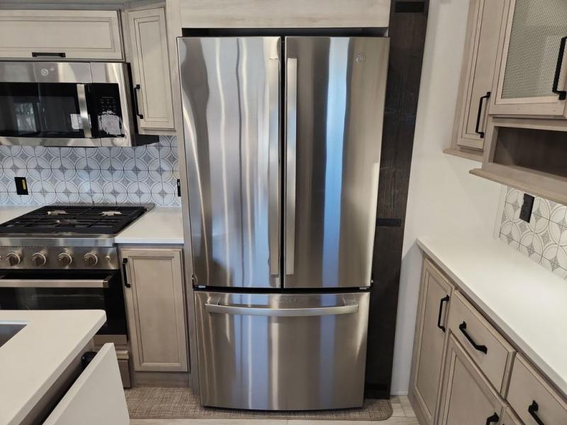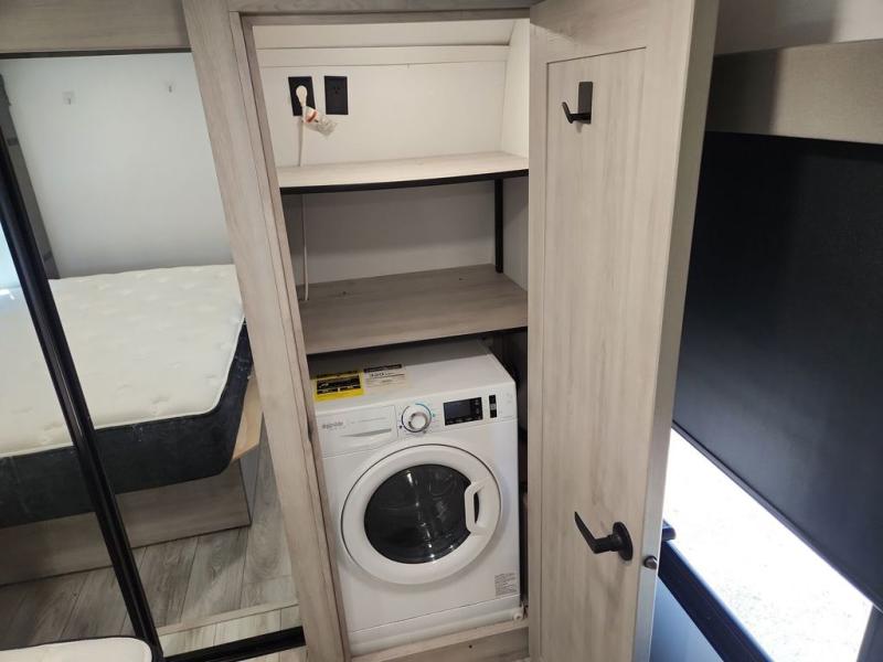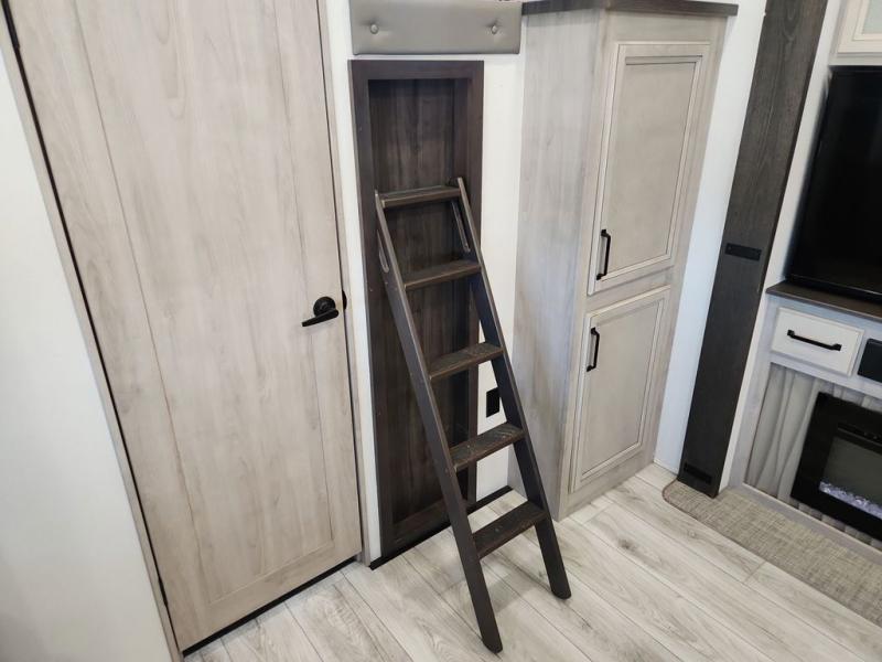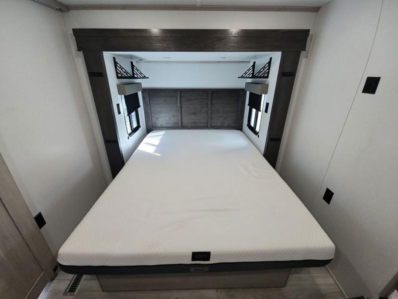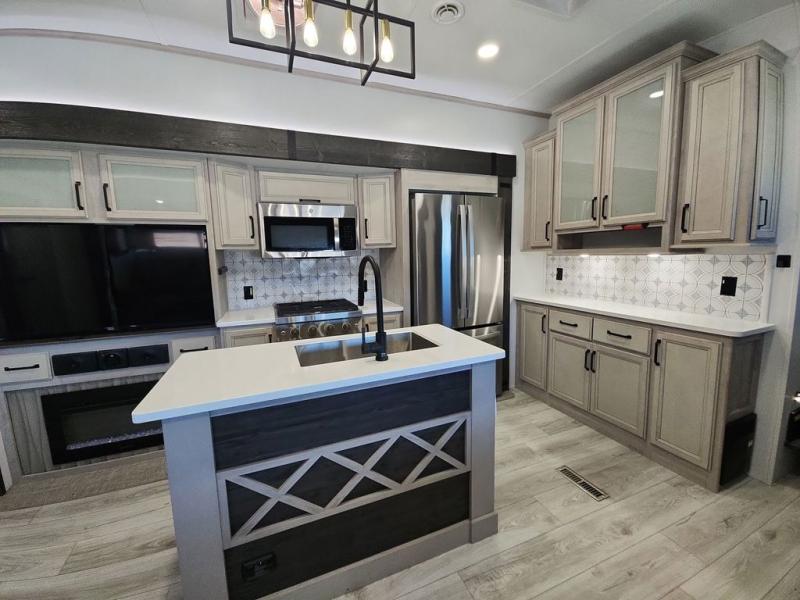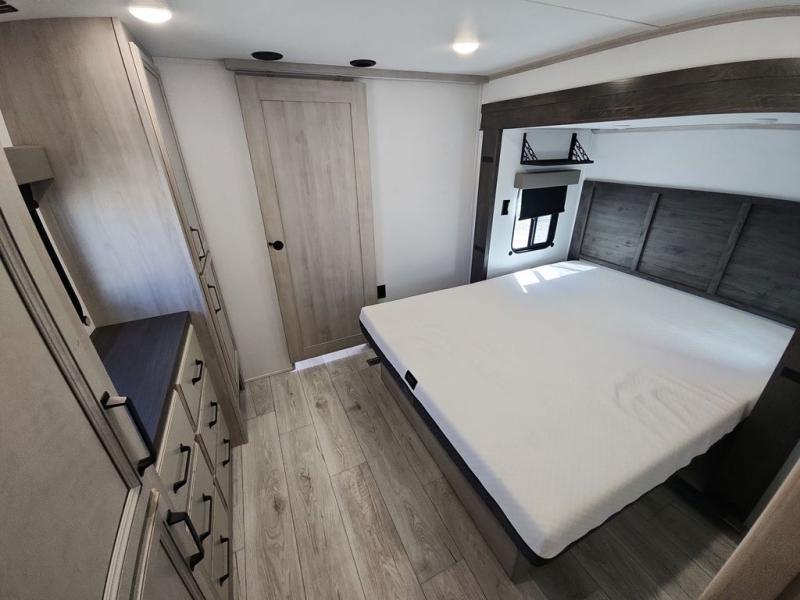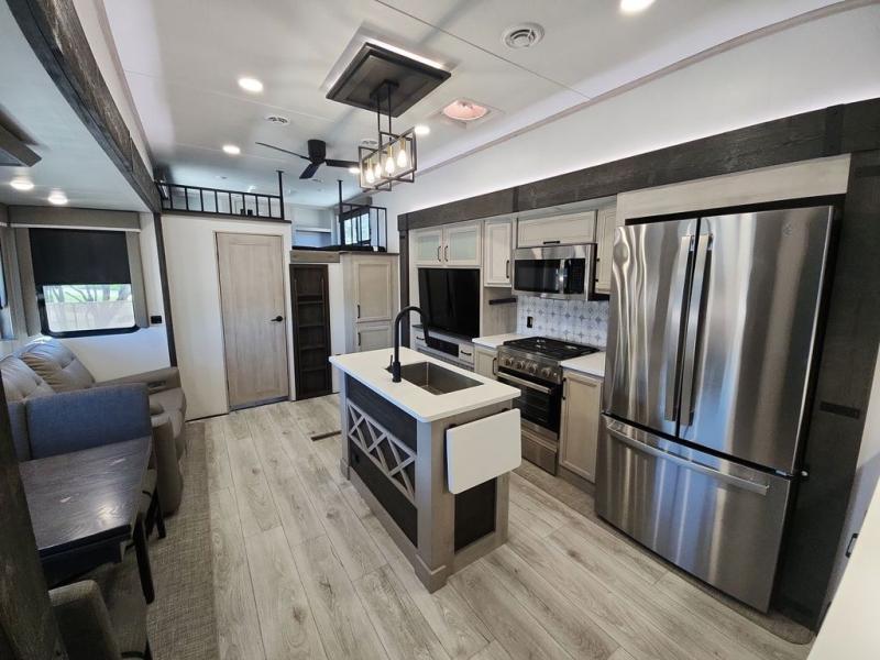 Two full bathrooms and two private bedrooms make this fifth wheel perfect for camping with friends and family. The front bedroom includes a king bed with a queen bed option, a large front wardrobe, plus stackable washer and dryer prep. The rear master bedroom has two closets plus a dresser and underbed storage, plus its own full bath with an exterior entry door for convenience. There is even a loft above the rear bedroom for even more sleeping space! Everyone can meet in the main living area/kitchen to relax on the power theater seat as the chef cooks dinner, and you can watch a show on the Smart HDTV to pass the time. The kitchen island will provide more counter space, along with the hutch that includes overhead cabinets as well. Don't let this luxury fifth wheel slip away!
