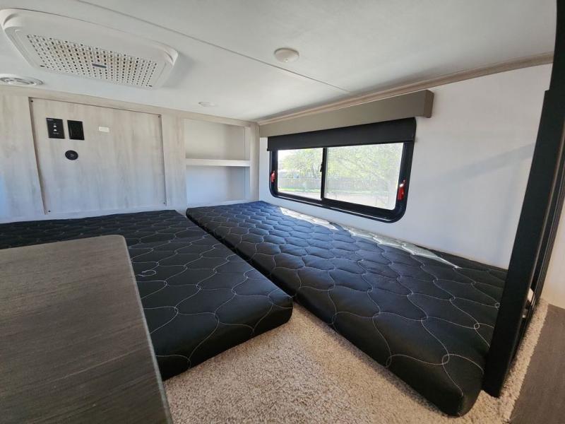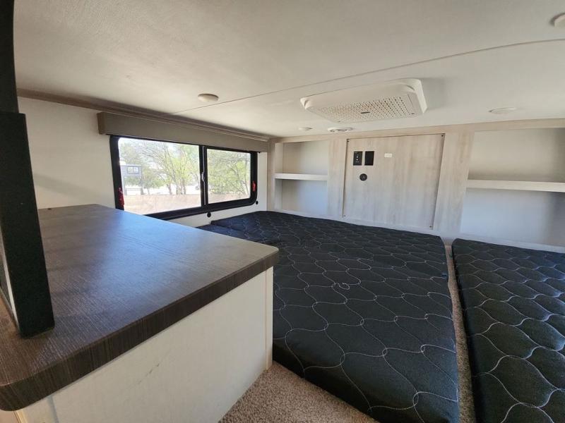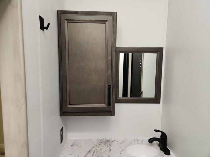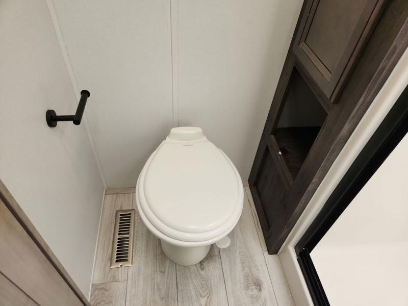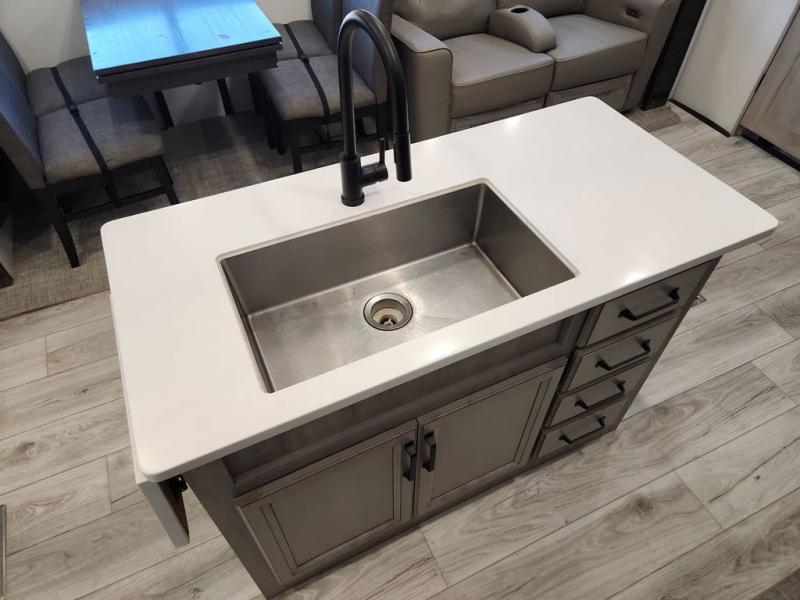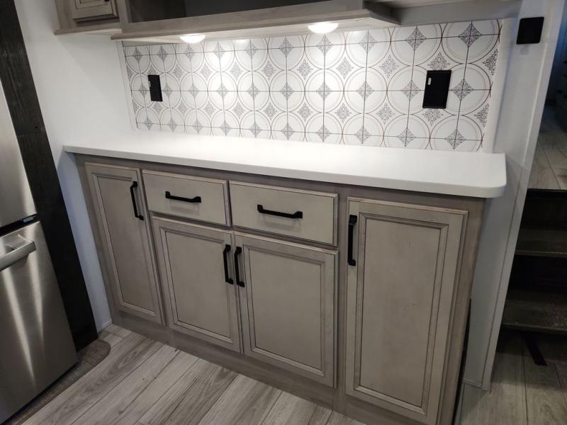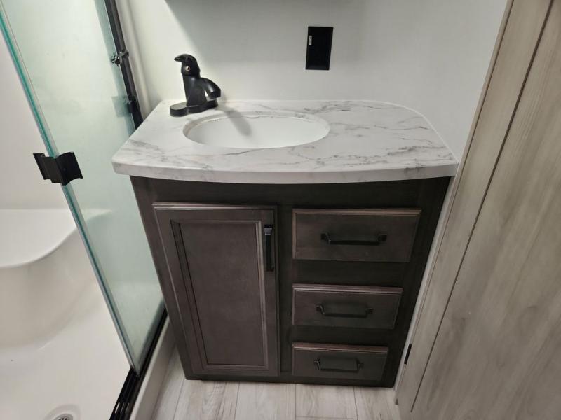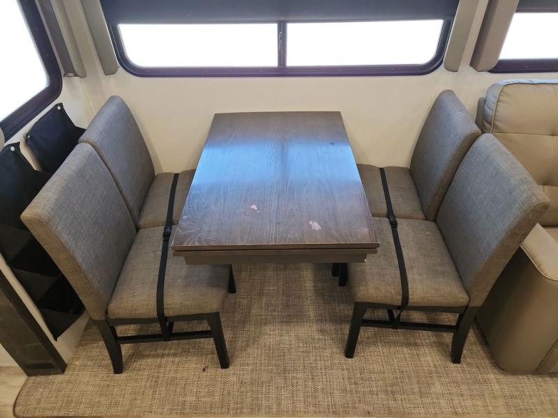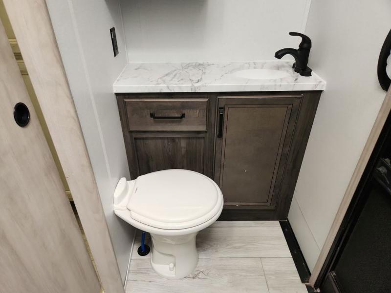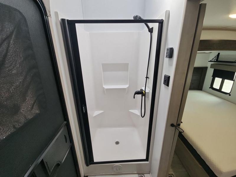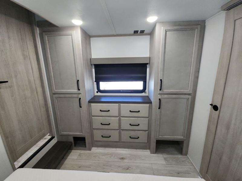 Two full bathrooms and two private bedrooms make this fifth wheel perfect for camping with friends and family. The front bedroom includes a king bed with a queen bed option, a large front wardrobe, plus stackable washer and dryer prep. The rear master bedroom has two closets plus a dresser and underbed storage, plus its own full bath with an exterior entry door for convenience. There is even a loft above the rear bedroom for even more sleeping space! Everyone can meet in the main living area/kitchen to relax on the power theater seat as the chef cooks dinner, and you can watch a show on the Smart HDTV to pass the time. The kitchen island will provide more counter space, along with the hutch that includes overhead cabinets as well. Don't let this luxury fifth wheel slip away!