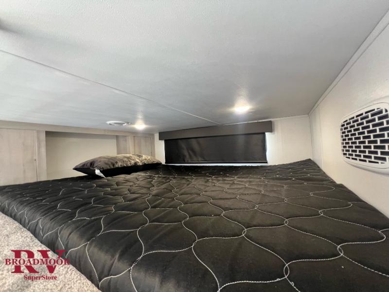 Just one look at this Montana High Country fifth wheel will impress you! There is an extra middle room that can be used for many different purposes, like an office, a guest bedroom, a craft room, or a hangout room. The hide-a-bed sofa sits on a slide for more space in this room, and there is a desk that can be used to get some work done. Above this room is a loft, so you have even more sleeping space. You also have a hide-a-bed sofa in the living area, and the king-size bed in the front private bedroom has storage underneath. The power theater seating sits across from the fireplace and 50" LCD TV for nighttime entertainment, and the kitchen island has a countertop extension for more prep space.
