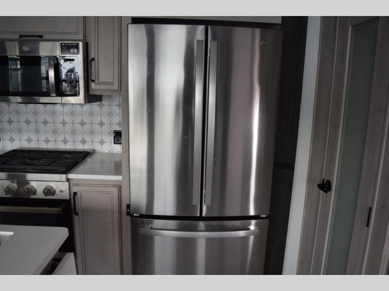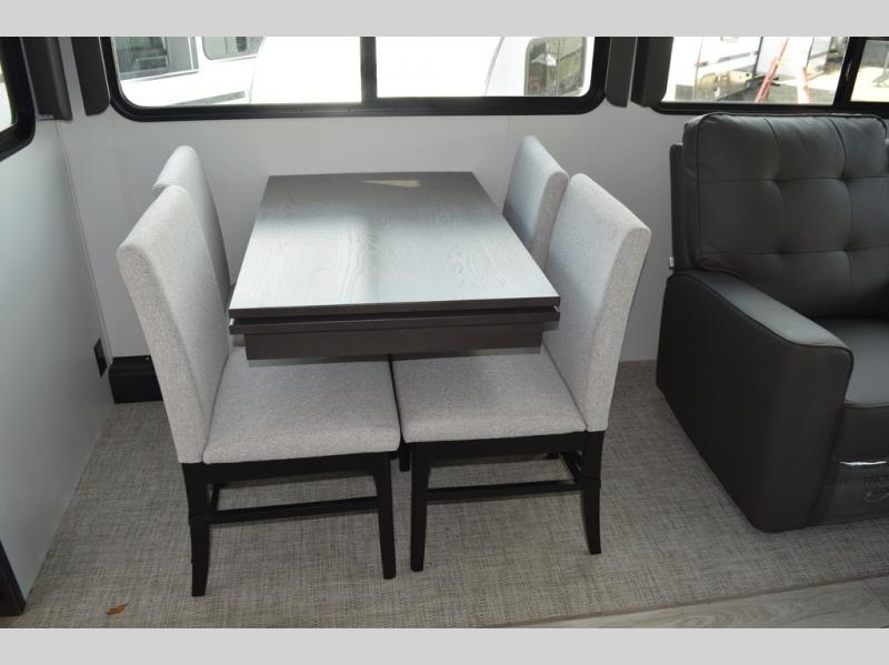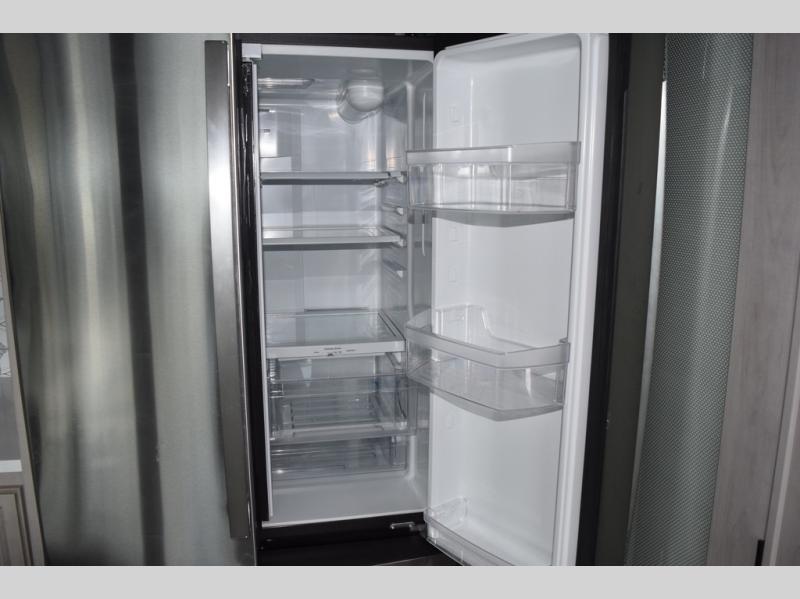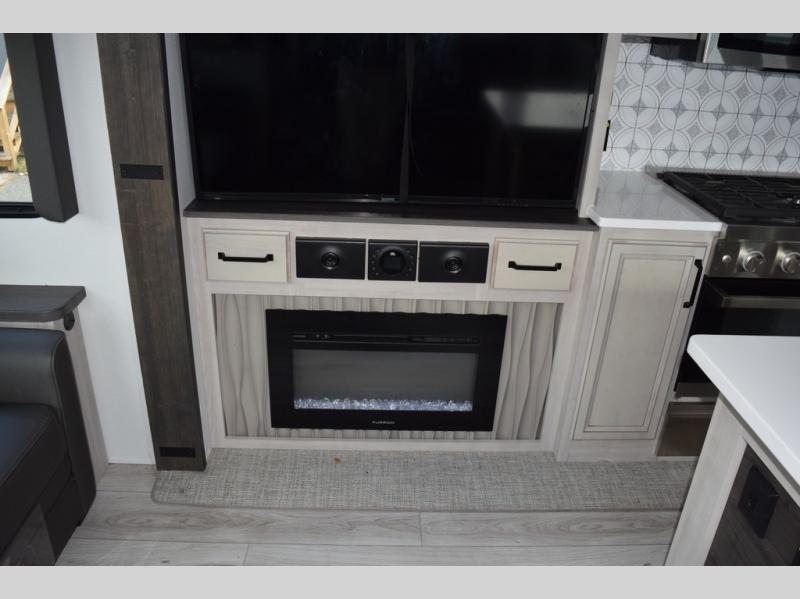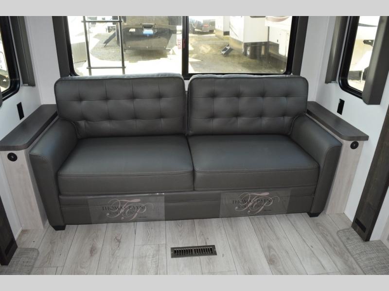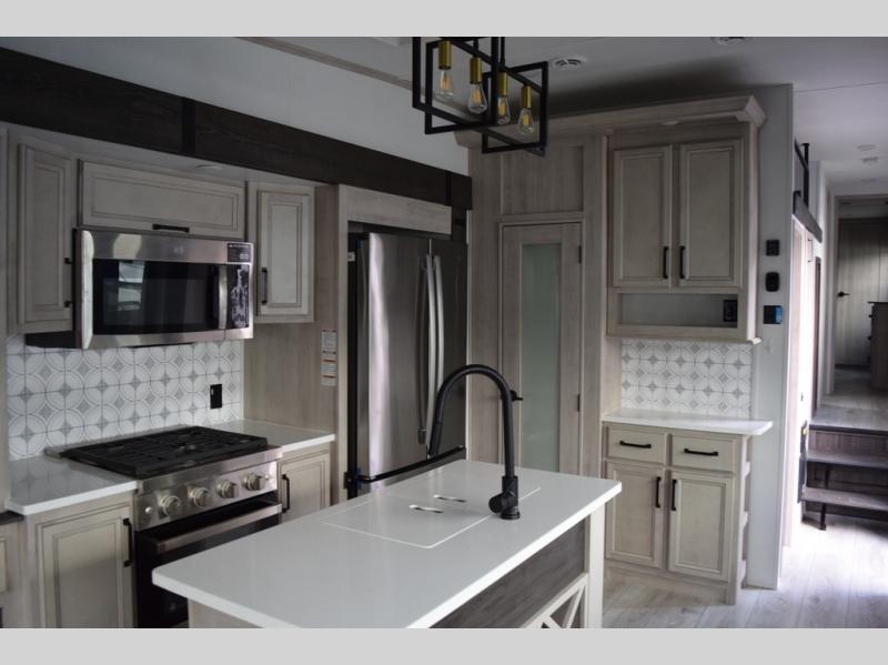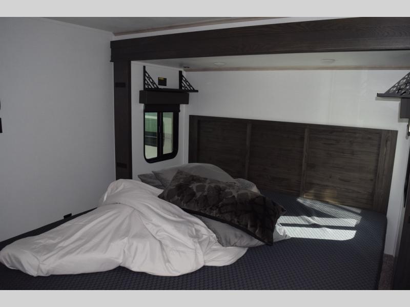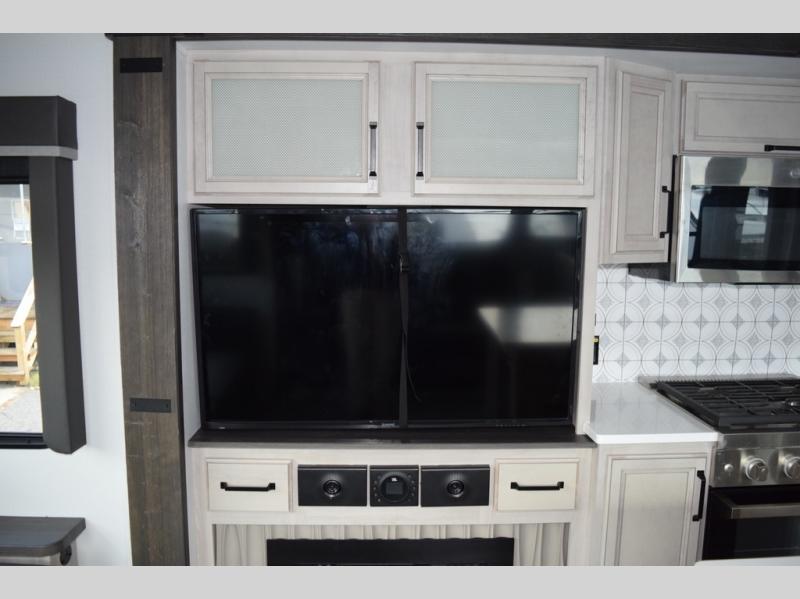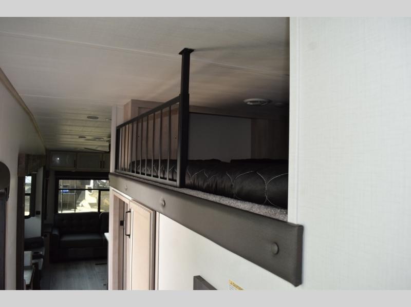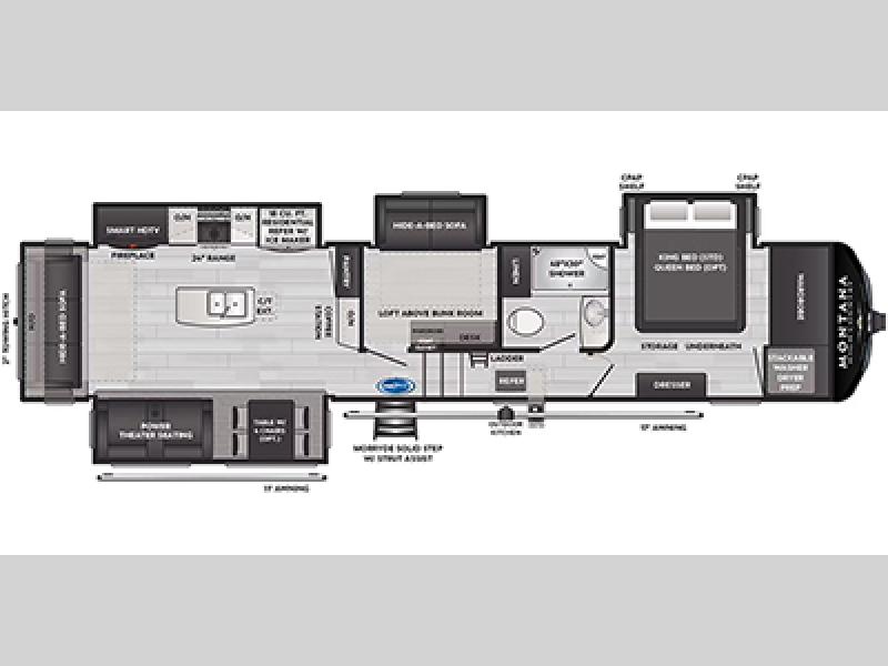 Just one look at this Montana High Country fifth wheel will impress you! There is an extra middle room that can be used for many different purposes, like an office, a guest bedroom, a craft room, or a hangout room. The hide-a-bed sofa sits on a slide for more space in this room, and there is a desk that can be used to get some work done. Above this room is a loft, so you have even more sleeping space. You also have a hide-a-bed sofa in the living area, and the king-size bed in the front private bedroom has storage underneath. The power theater seating sits across from the fireplace and 50" LCD TV for nighttime entertainment, and the kitchen island has a countertop extension for more prep space.