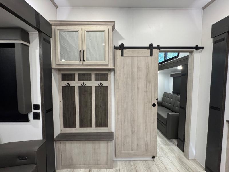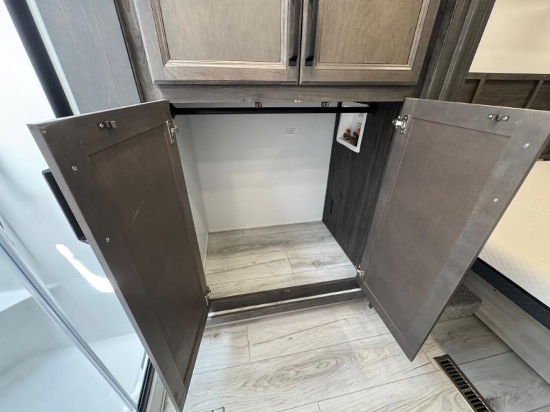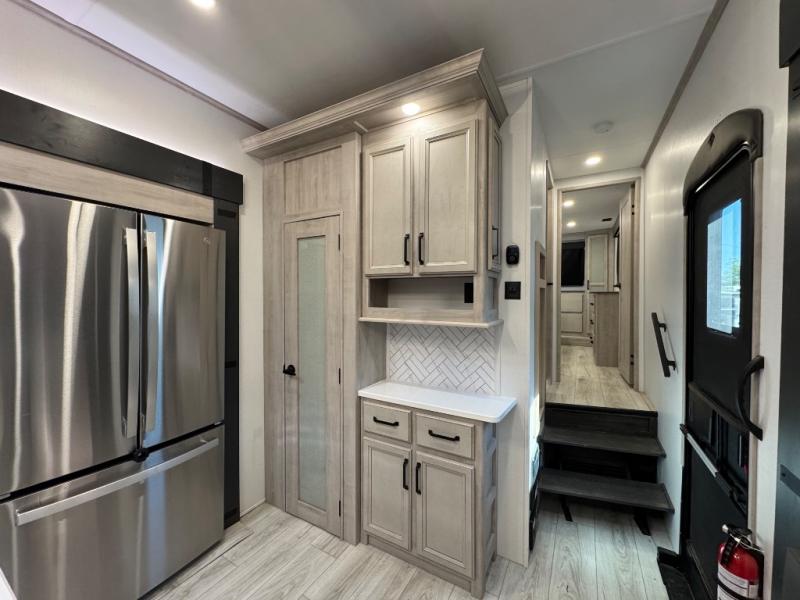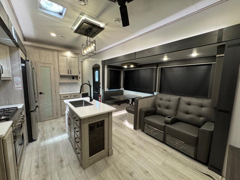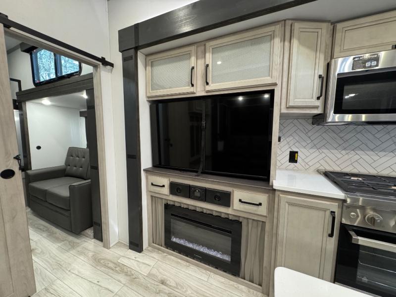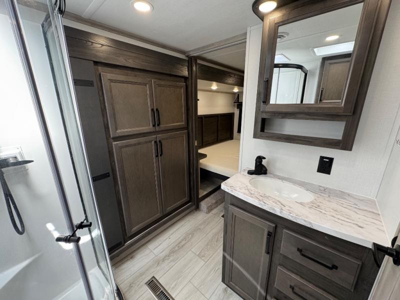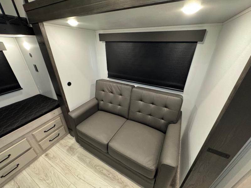 This fifth wheel is sure to check off all the boxes on your wish list for a new RV! There is a rear private bunkhouse suite with triple bunks and a hide-a-bed sofa, plus a half bath with its own exterior entry door! You'll have the front master bedroom all to yourselves with a king bed slide out, three wardrobes, two dressers, and even underbed storage! You could choose the optional queen bed in place of the king if you want more floor place, and there is washer/dryer prep if you want to add those appliances. The combined living area and kitchen is spacious with its dual opposing slides, and there is a kitchen island here for more counter space the chef if sure to love. Power theater seating is directly across from the Smart HDTV and fireplace, and the booth dinette provides a place to dine at. There is also a large 18.6 cu. ft. residential refrigerator and a pantry for food storage, plus a coffee station where you can park your Keurig machine! Head outdoors to enjoy the two power awnings and outdoor kitchen!