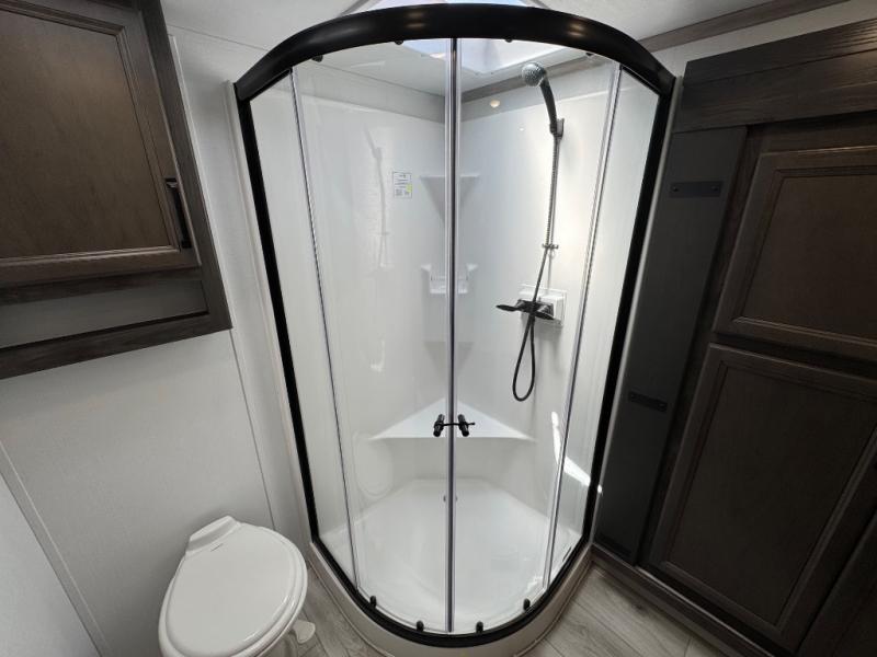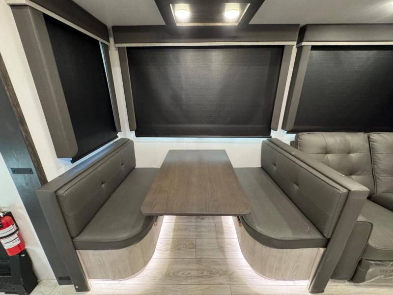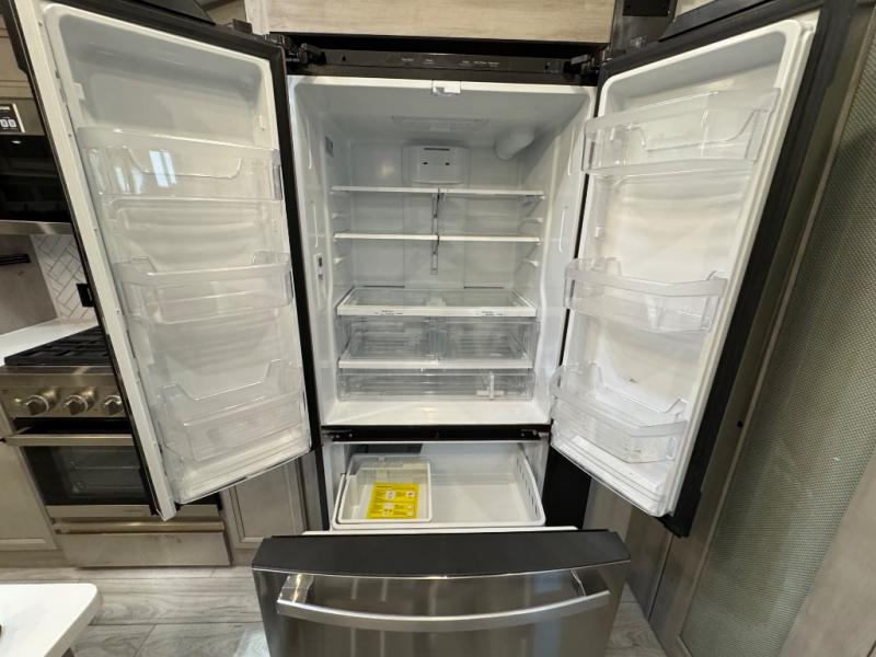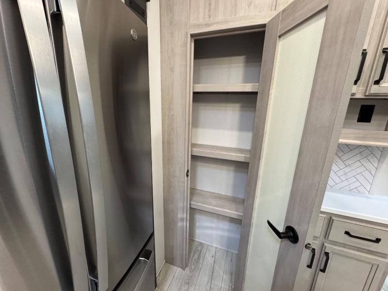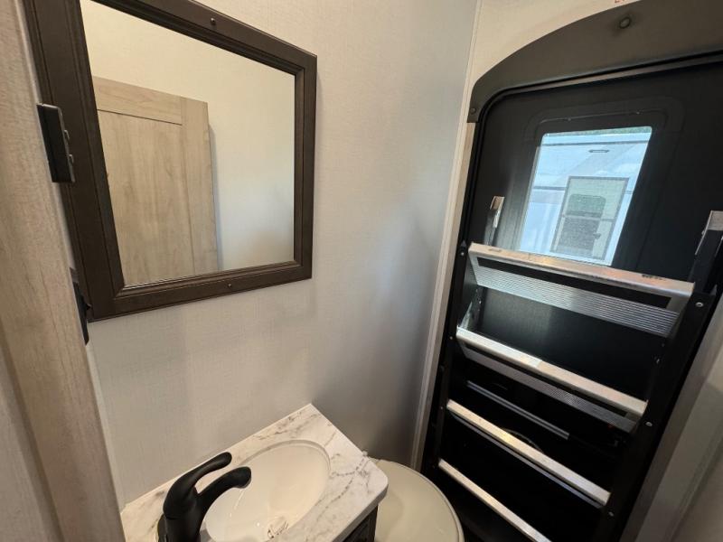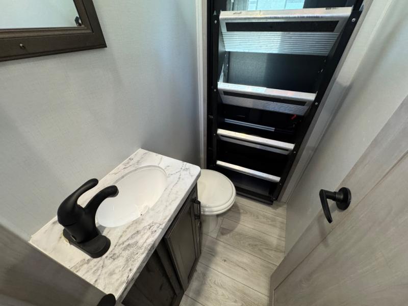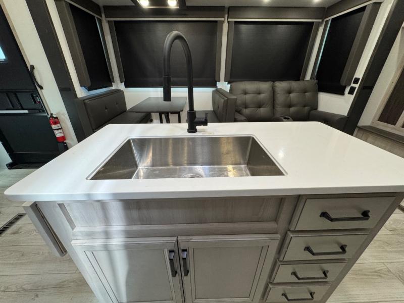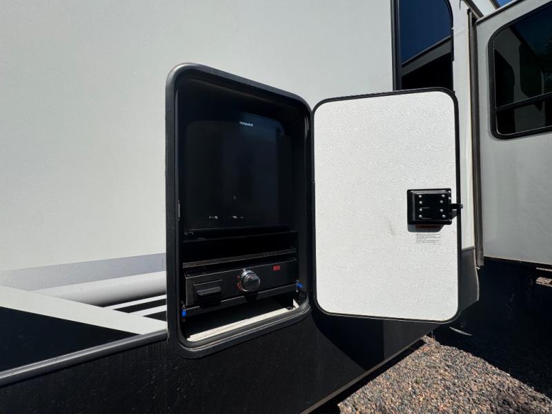 This fifth wheel is sure to check off all the boxes on your wish list for a new RV! There is a rear private bunkhouse suite with triple bunks and a hide-a-bed sofa, plus a half bath with its own exterior entry door! You'll have the front master bedroom all to yourselves with a king bed slide out, three wardrobes, two dressers, and even underbed storage! You could choose the optional queen bed in place of the king if you want more floor place, and there is washer/dryer prep if you want to add those appliances. The combined living area and kitchen is spacious with its dual opposing slides, and there is a kitchen island here for more counter space the chef if sure to love. Power theater seating is directly across from the Smart HDTV and fireplace, and the booth dinette provides a place to dine at. There is also a large 18.6 cu. ft. residential refrigerator and a pantry for food storage, plus a coffee station where you can park your Keurig machine! Head outdoors to enjoy the two power awnings and outdoor kitchen!
