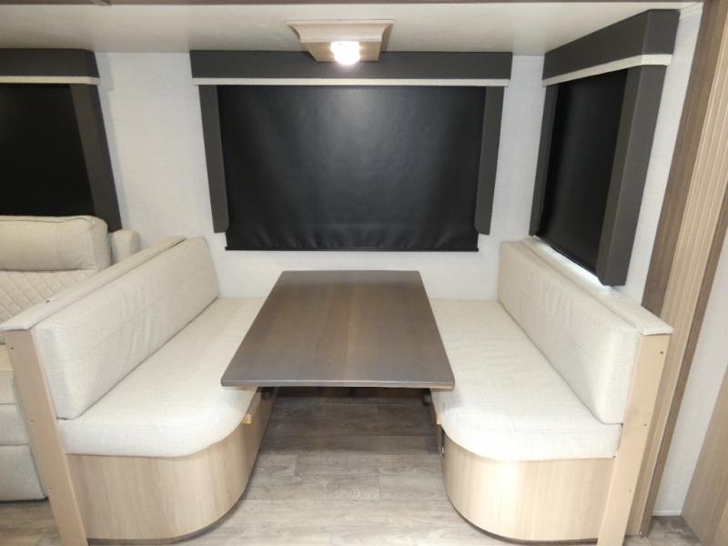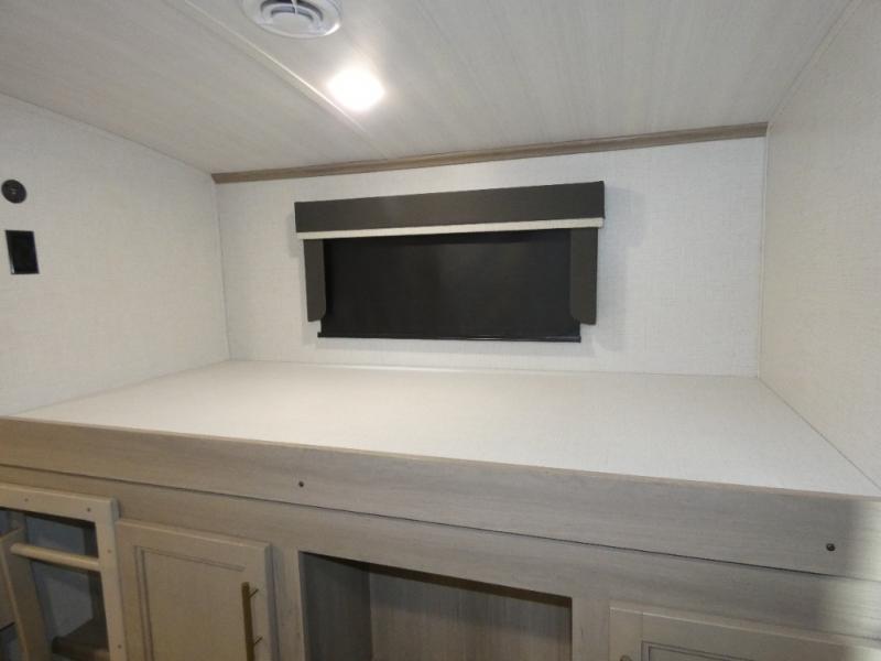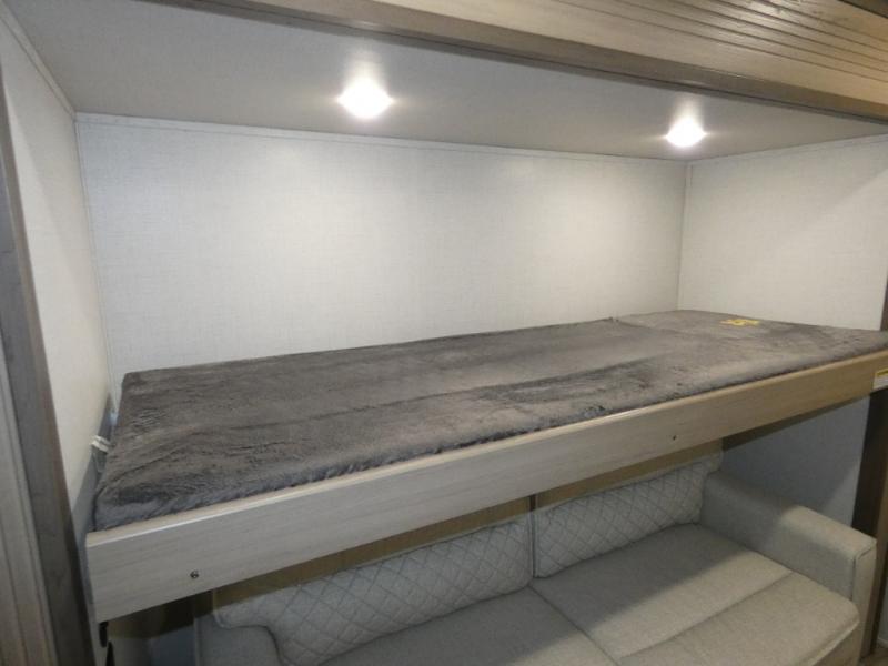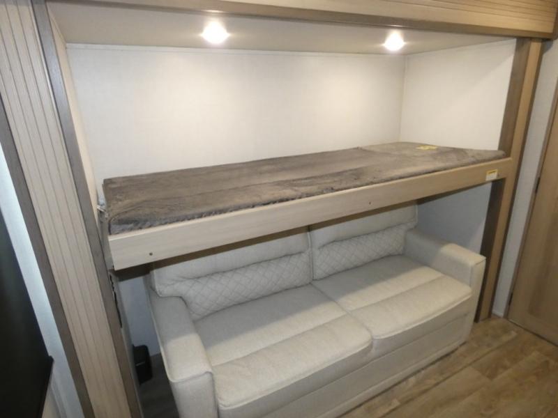 When you enjoy entertaining guests and relaxing both inside and outside at the campgrounds, this trailer has you covered! There is a 20' awning along the exterior, a drop frame pass-through storage to carry larger gear like camping chairs, outdoor tables, fishing poles and such, plus an outside kitchen to make a few meals. The inside is spacious with dual opposing slides in the main living and kitchen area, and the private bunkhouse has a slide out with a sofa sleeper and bunk above. There is a second bunk above an entertainment center that your guests will surely appreciate. You will have a queen bed in the front bedroom, and the full bathroom will keep everyone refreshed. The kitchen has full amenities, plus a kitchen island with a skylight for more natural lighting, theater seats and booth dinette.