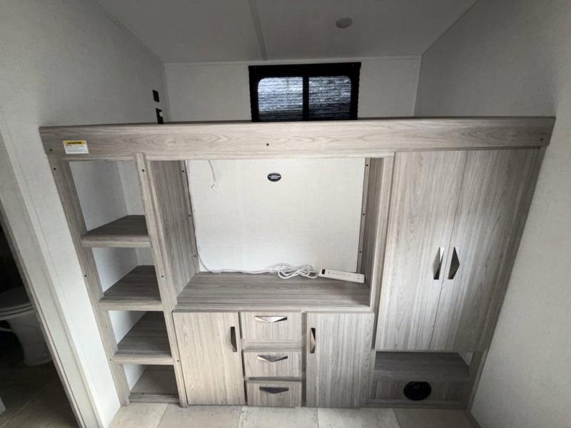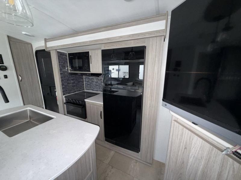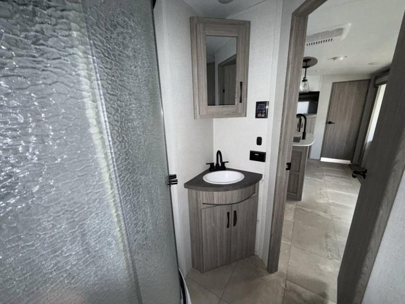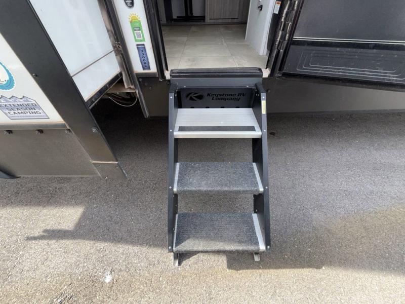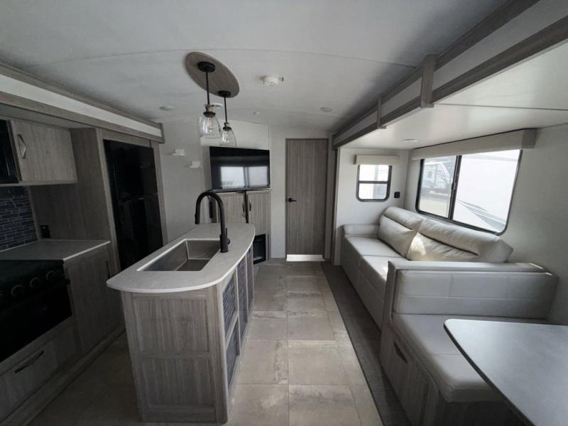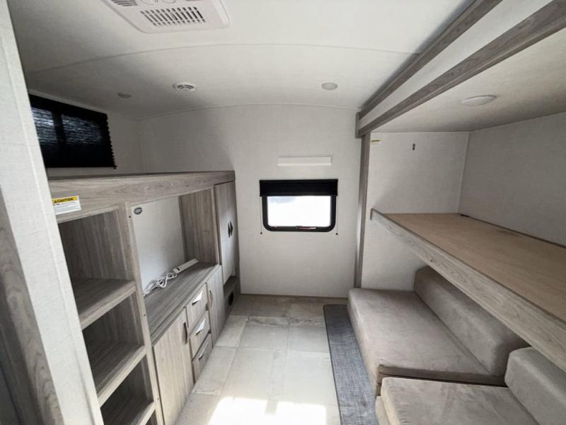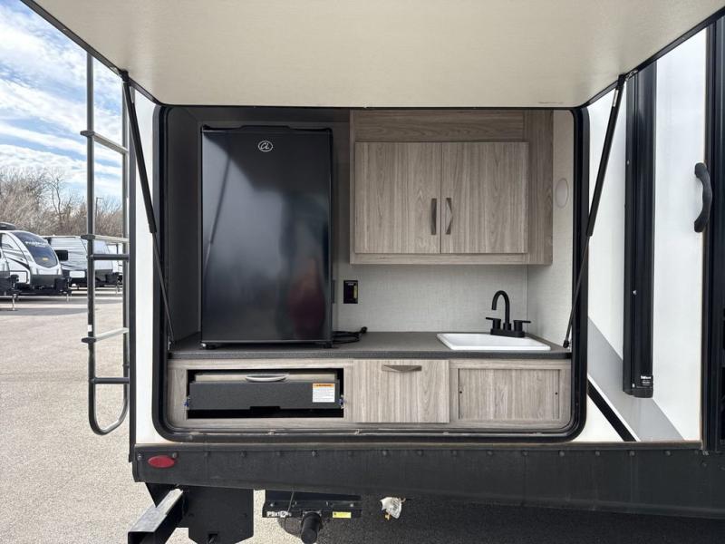 You won't believe all that this travel trailer has to offer! Starting with the rear private bunkhouse which has a 28" x 74" flip-up bunk above a 68" tri-fold sofa, a 51" x 74" bunk above an entertainment center, and even a half bathroom which has one of the dual entry doors to the unit. The front private bedroom has a queen bed to lay your head on at night with wardrobes on either side and a laundry chute to place your dirty clothes. As you exit the bedroom, you will enter the walk-through bathroom. Now that you're ready for the day, you can head to the fully equipped kitchen complete with a kitchen island to whip up some delicious cinnamon rolls that can be enjoyed at the dream dinette. You even have an outside kitchen with a capital grill, a 4.4 cu. ft. refrigerator, and a sink!