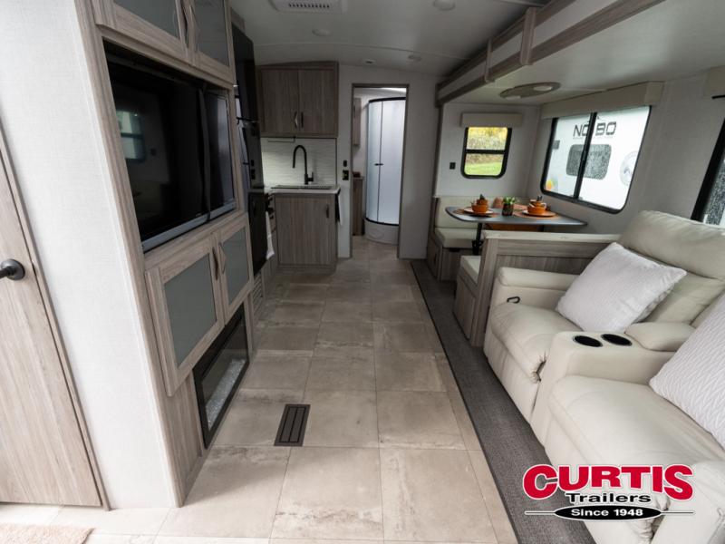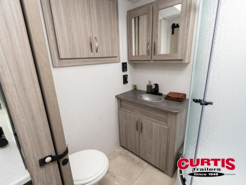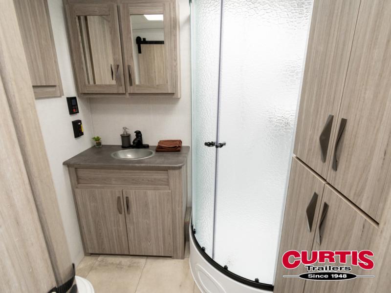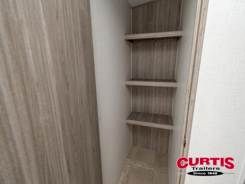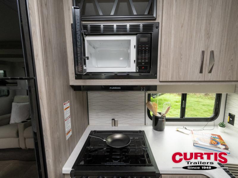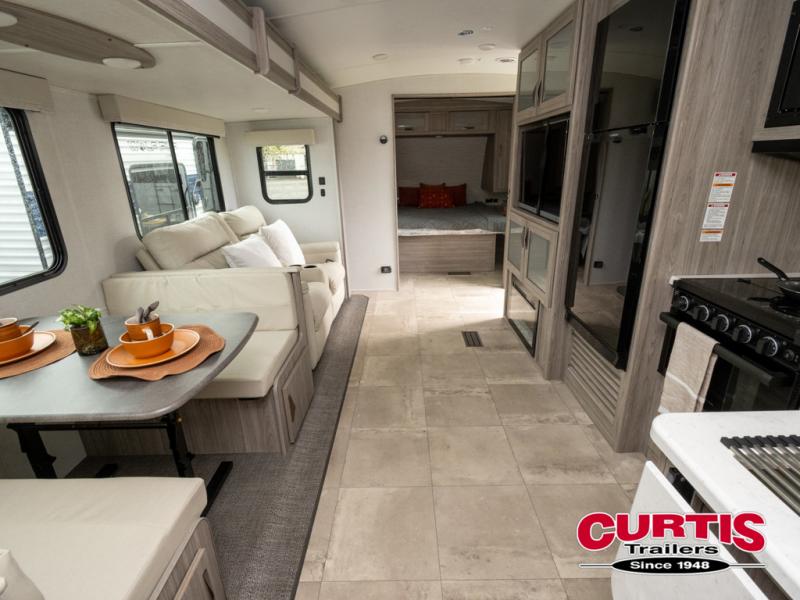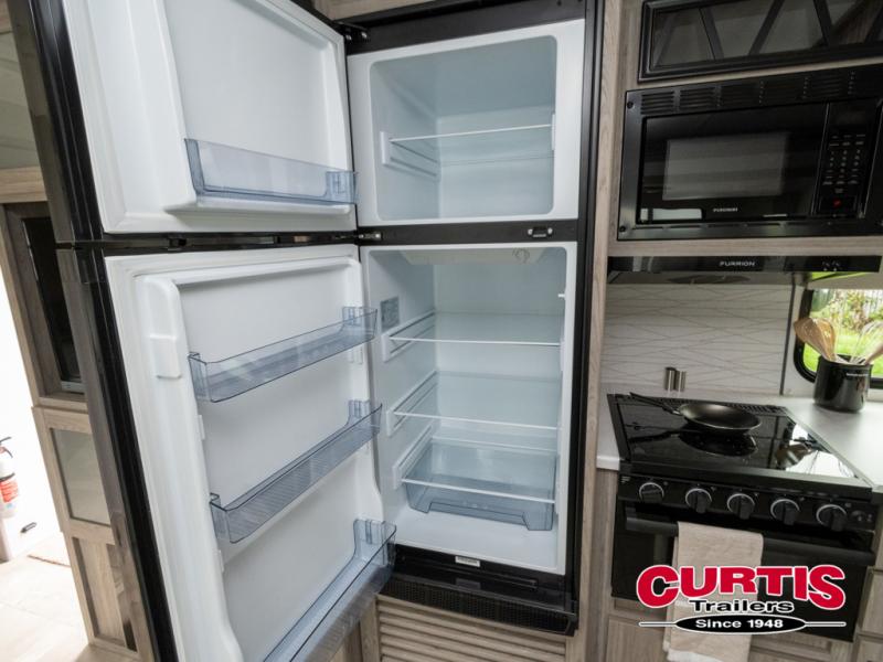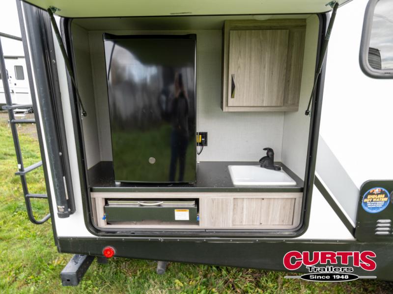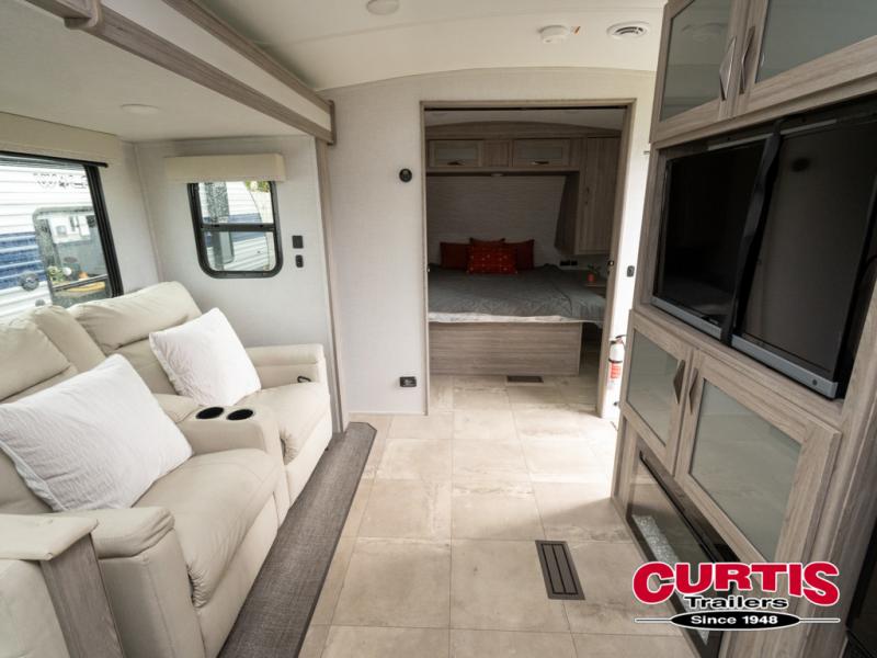 There is much to love about this travel trailer! The spacious full rear bathroom has a radius shower to rinse the sand out of your hair and a linen closet to keep your toiletries close. The front private bedroom has a queen bed for a good night's rest with wardrobes on either side of it. After a fun day outdoors, you can relax on the 68" tri-fold sofa or switch it out for the optional luxury cinema recliners across from the entertainment center with a fireplace or you can play a game or two at the dream dinette which can also be switched out for the optional free standing dinette. The chef will have an easy time preparing meals either indoors with the fully equipped kitchen or at the outside kitchen with a capital grill, a 4.4 cu. ft. refrigerator, and even a sink all of which is protected by the 21' power awning!