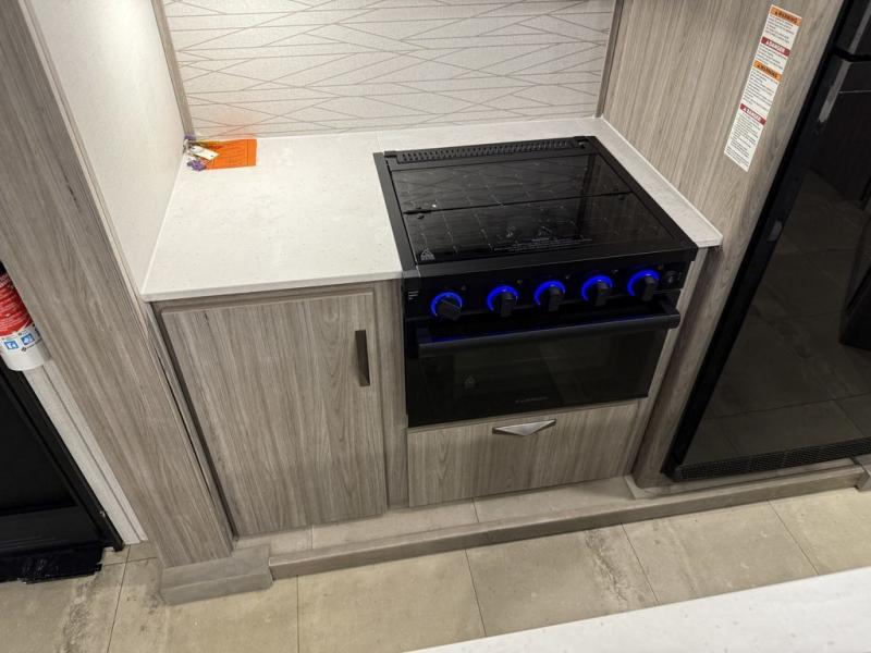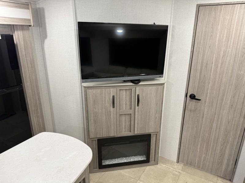 You won't believe all that this travel trailer has to offer! Starting with the rear private bunkhouse which has a 28" x 74" flip-up bunk above a 68" tri-fold sofa, a 51" x 74" bunk above an entertainment center, and even a half bathroom which has one of the dual entry doors to the unit. The front private bedroom has a queen bed to lay your head on at night with wardrobes on either side and a laundry chute to place your dirty clothes. As you exit the bedroom, you will enter the walk-through bathroom. Now that you're ready for the day, you can head to the fully equipped kitchen complete with a kitchen island to whip up some delicious cinnamon rolls that can be enjoyed at the dream dinette. You even have an outside kitchen with a capital grill, a 4.4 cu. ft. refrigerator, and a sink!