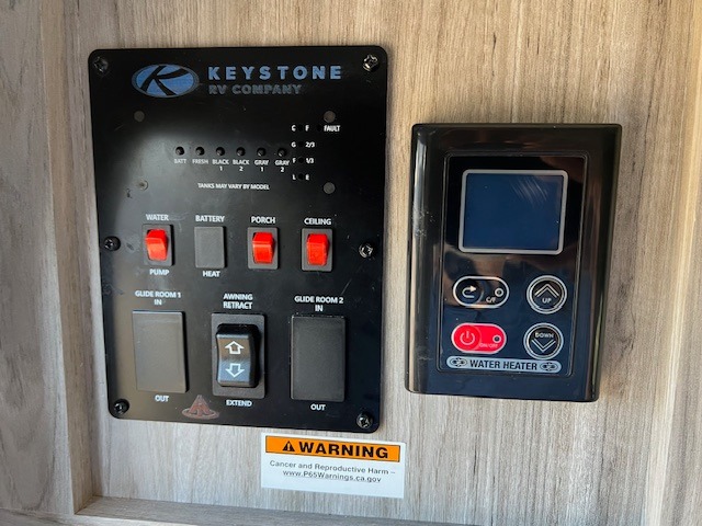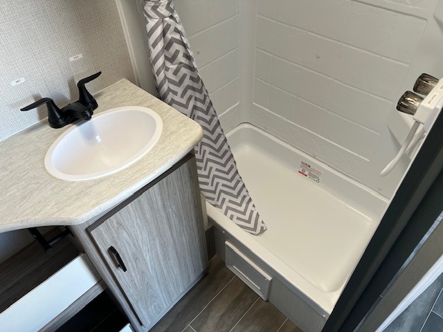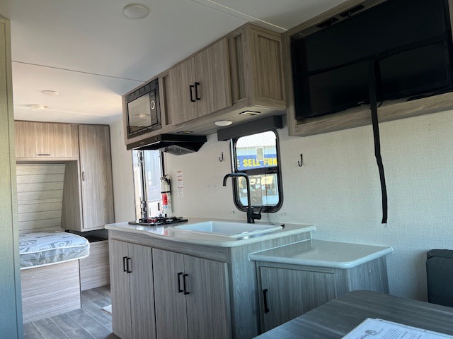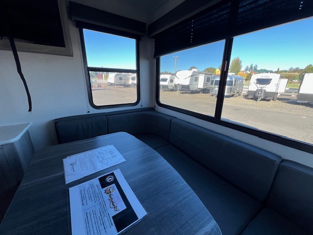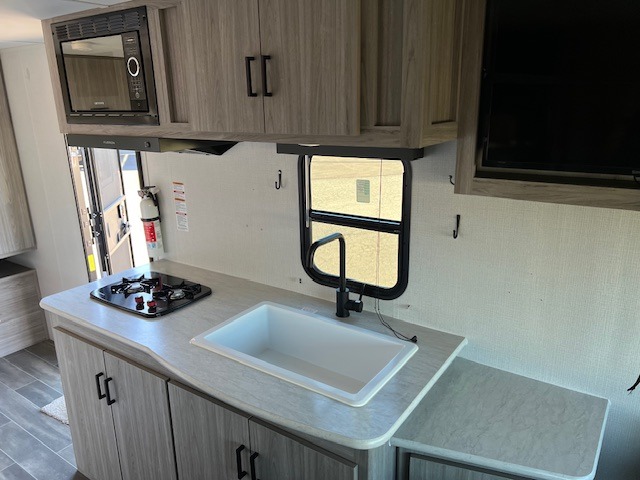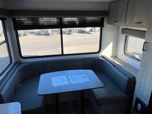 Pack your bags and hitch up this travel trailer for a fun weekend excursion! You can get a good night's sleep on the front queen bed with a wardrobe at the foot of the bed, and overhead cabinets above it for your items. You can also transform the U-shaped dinette with counter next to it into an extra sleeping space when you aren't using it to enjoy a meal prepared with the high output two burner cooktop and 9.8 cu. ft. double door refrigerator. Everyone can freshen up in the full bathroom with the shower tub which has a skylight above for added natural lighting. Relax underneath the 11' awning and store all of your gear in the front exterior pass-through storage area!
