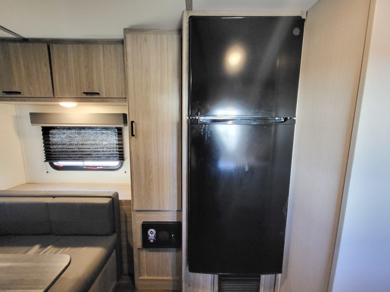 Pack your bags and hitch up this travel trailer for a fun weekend excursion! You can get a good night's sleep on the front queen bed with a wardrobe at the foot of the bed, and overhead cabinets above it for your items. You can also transform the U-shaped dinette with counter next to it into an extra sleeping space when you aren't using it to enjoy a meal prepared with the high output two burner cooktop and 9.8 cu. ft. double door refrigerator. Everyone can freshen up in the full bathroom with the shower tub which has a skylight above for added natural lighting. Relax underneath the 11' awning and store all of your gear in the front exterior pass-through storage area!