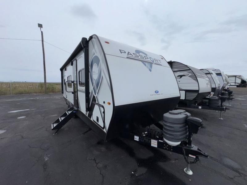 You can take many different kinds of trips with this Passport SL travel trailer! Once you get to the campsite and set up the 19' awning, you can remove your travel gear from the exterior pass-through storage to create your own little retreat. On the interior, the front private bedroom provides you with a queen-size bed, nightstands, and bedside wardrobes so that you can easily get changed every morning and night. The large slide out in the main living area will add to the amount of living space on the interior without adding to the overall width of the trailer. As the night comes to a close, you can heat up a bag of popcorn in the microwave before sitting down in the tri-fold sofa sleeper which could be switched out for the optional theater seating.