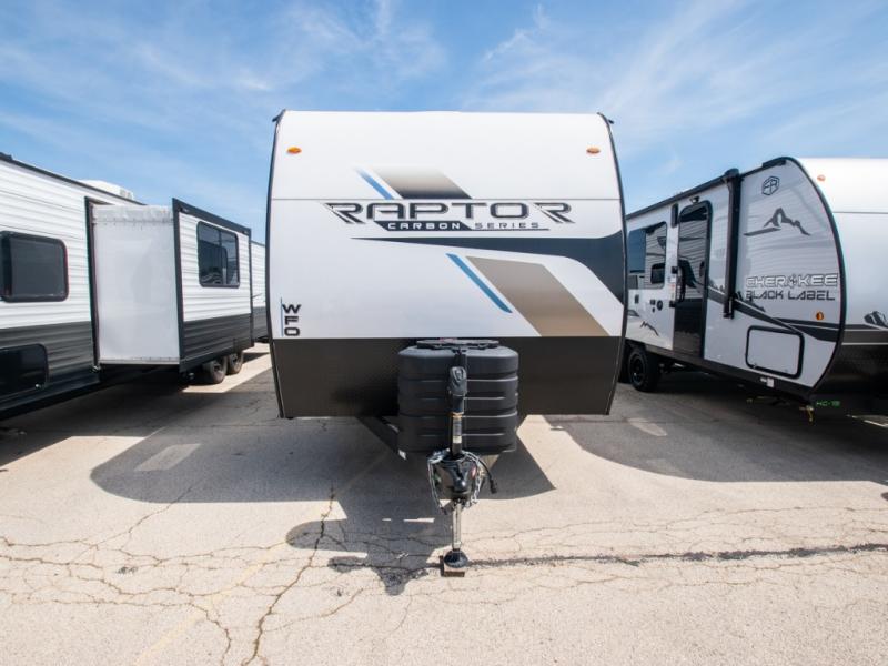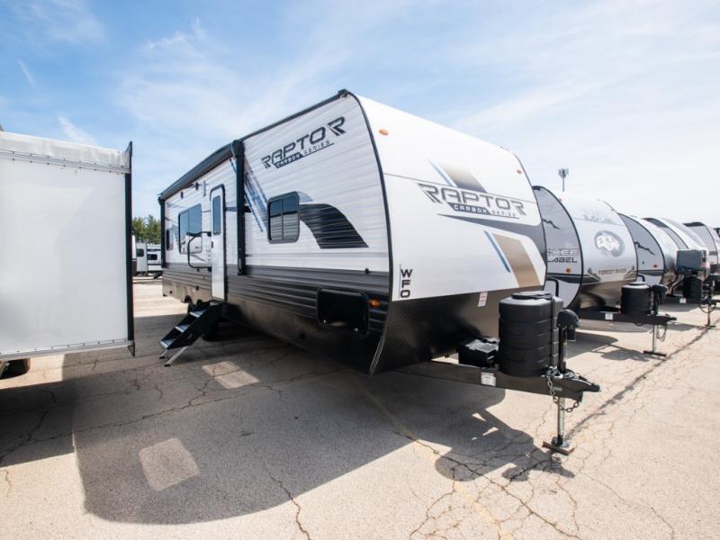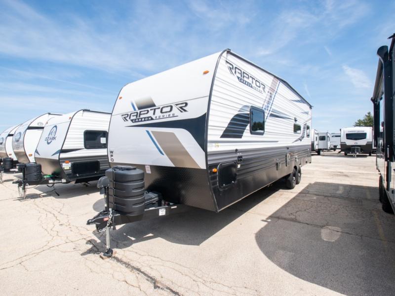 Each Raptor Carbon Series toy hauler travel trailer is built with a 10" I-beam frame, laminated sidewalls with double-welded aluminum construction, plus Dexter E-Z lube 6,000 lb. axles with self-adjusting brakes, electric stabilizer jacks for easy setup, and MORyde step above steps for stability on any type of ground you camp on. On the interior, designer style vinyl flooring throughout, pull-down window shades for privacy at night, and LED lighting throughout. You will appreciate the Girard tankless on-demand water heater for showering both inside and out, and you can also customize your trailer by adding a few options if you wish. The optional patio package will provide you with a raised outdoor living area to enjoy, and the optional SolarFlex protect 220 allows you the ability to decide how you want to camp. Choose your favorite model today!