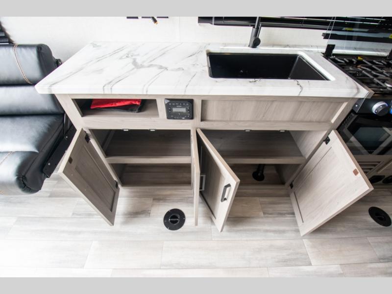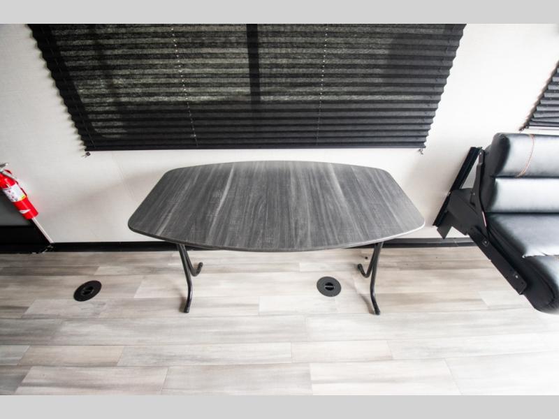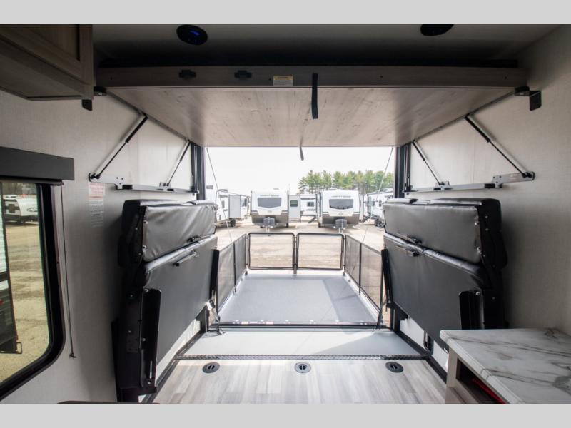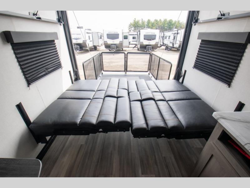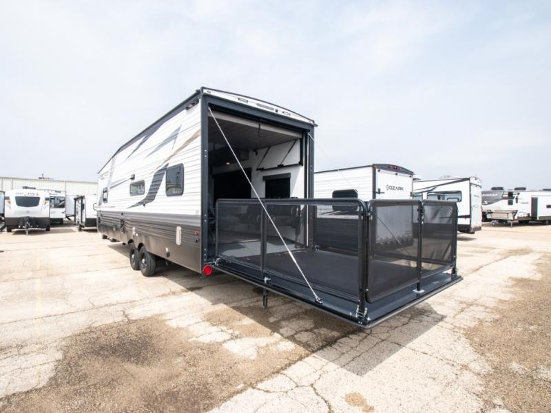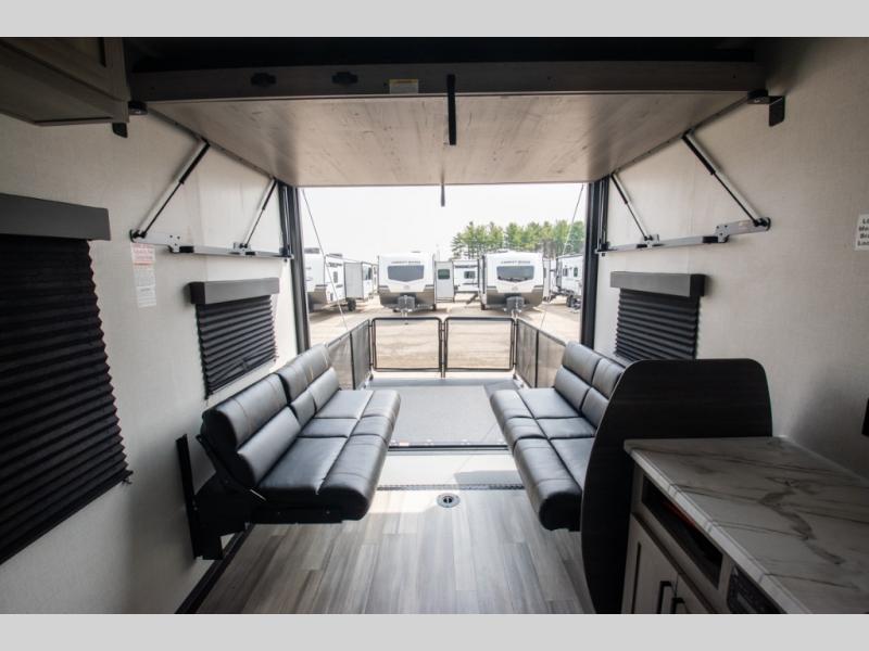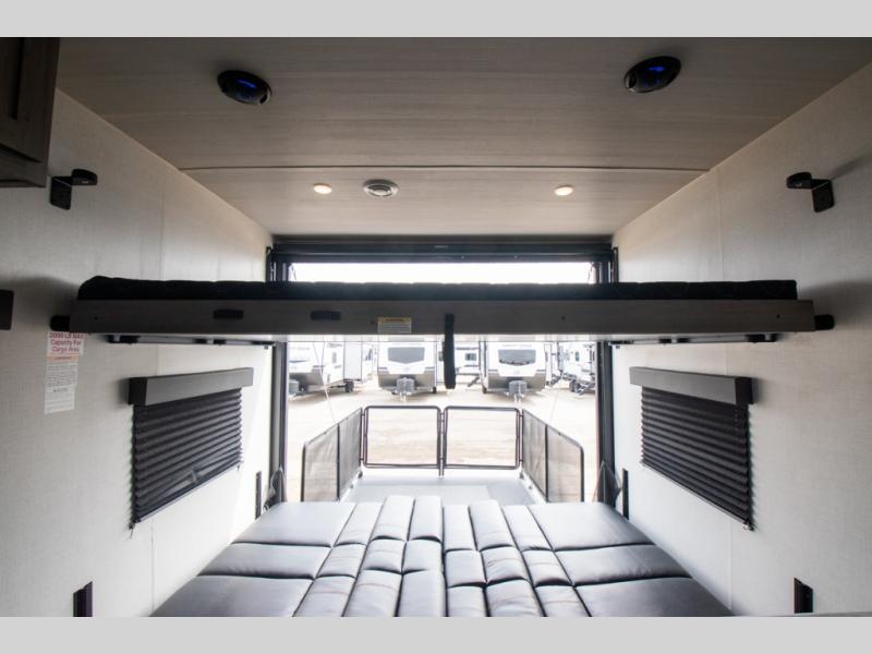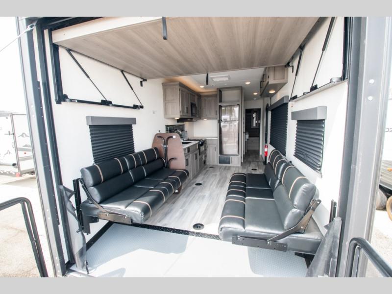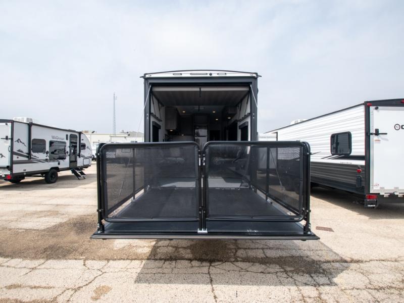 Load up your favorite off-road riding toys and head to your favorite trails, dunes, or competition rally with family and friends. This unit sleeps six with the RV queen bed in front and the dual roll over sofas and bonus bunk in back. The 13' garage with 5K inter-lock system tie downs will get all of your cargo safely to your destination. Once in camp, the rear ramp door will help you easily unload and then set up the sofas with table in between. A full kitchen allows you to refuel your bodies easily by providing a three burner range and 17" black oven, a 10.7 cu. ft. 12V refrigerator for your perishables, and a residential microwave oven to heat up leftovers. The full bath will allow everyone to easily clean up after a full day of fun, and you will enjoy the private front bedroom with an RV queen bed and a full closet for all of your things. On the outside, an 18' power awning provides added living space, or you might like to add the optional patio package for a raised extension of your unit giving you an outdoor space to enjoy.