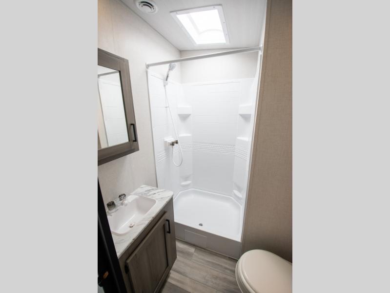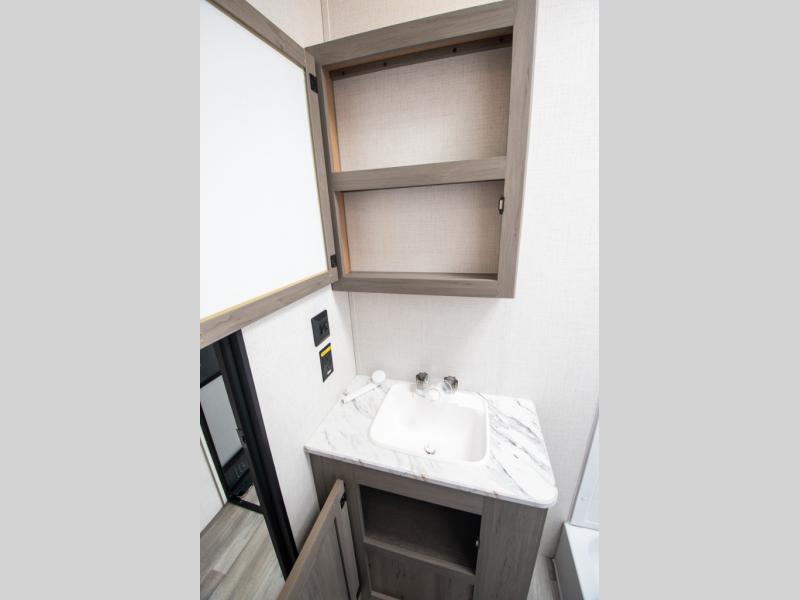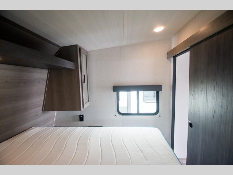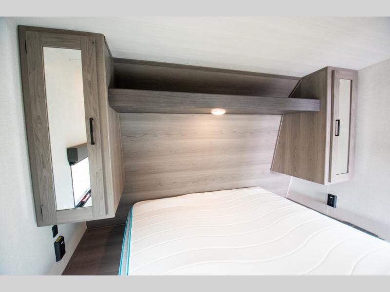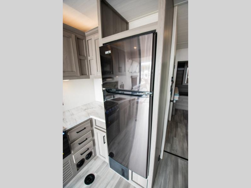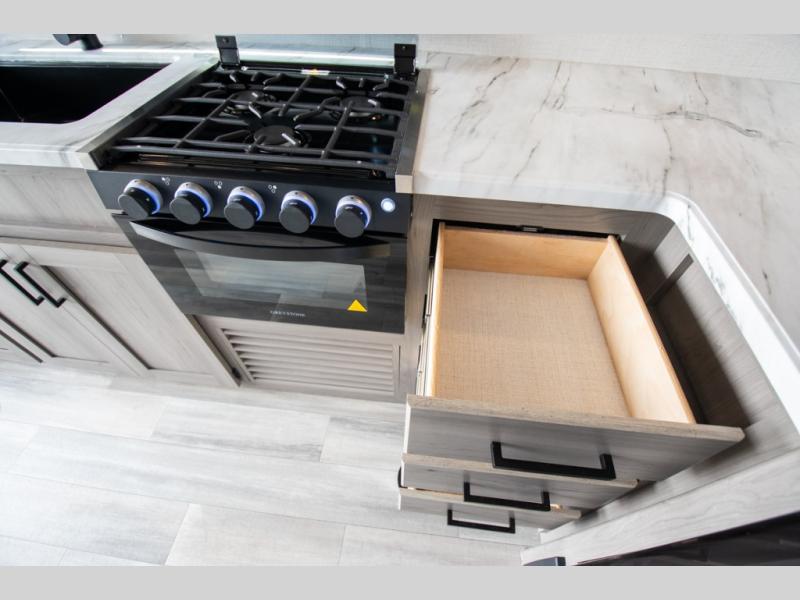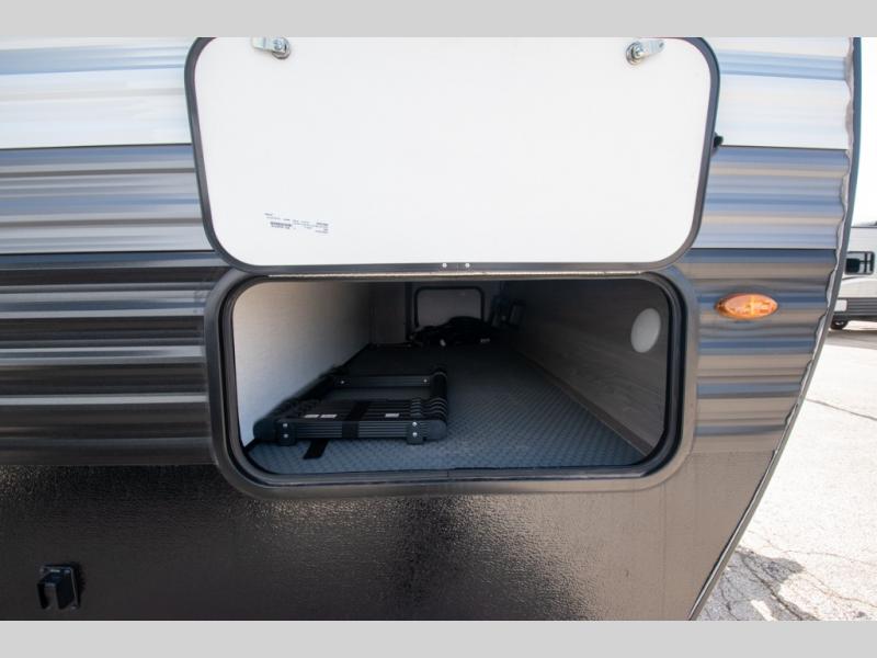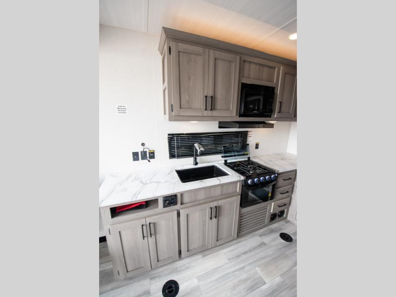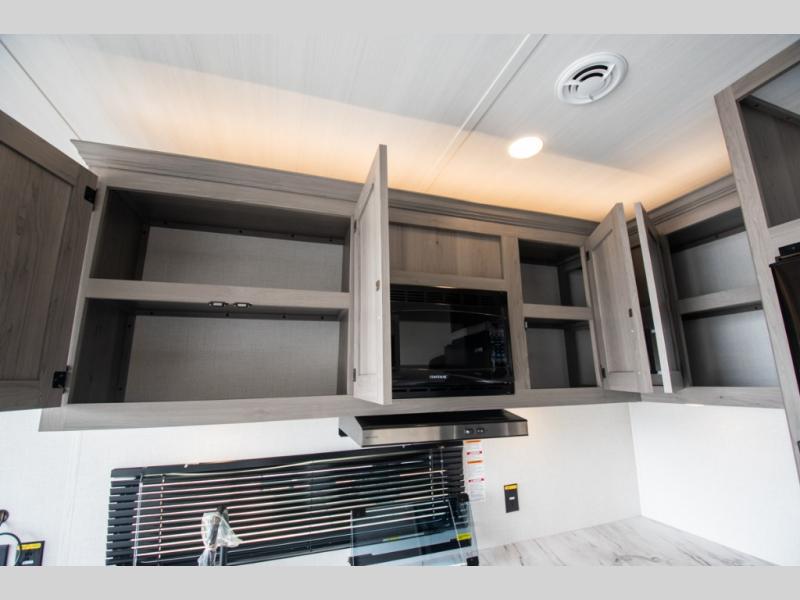 Load up your favorite off-road riding toys and head to your favorite trails, dunes, or competition rally with family and friends. This unit sleeps six with the RV queen bed in front and the dual roll over sofas and bonus bunk in back. The 13' garage with 5K inter-lock system tie downs will get all of your cargo safely to your destination. Once in camp, the rear ramp door will help you easily unload and then set up the sofas with table in between. A full kitchen allows you to refuel your bodies easily by providing a three burner range and 17" black oven, a 10.7 cu. ft. 12V refrigerator for your perishables, and a residential microwave oven to heat up leftovers. The full bath will allow everyone to easily clean up after a full day of fun, and you will enjoy the private front bedroom with an RV queen bed and a full closet for all of your things. On the outside, an 18' power awning provides added living space, or you might like to add the optional patio package for a raised extension of your unit giving you an outdoor space to enjoy.