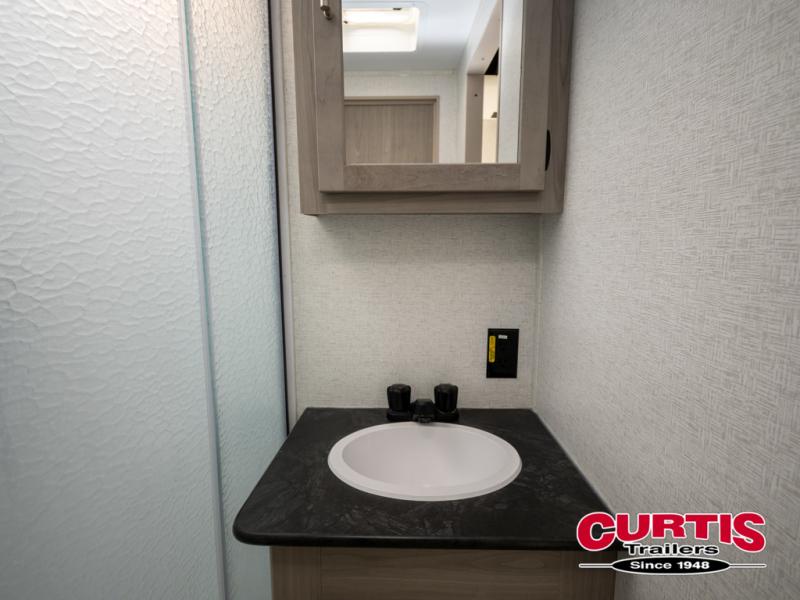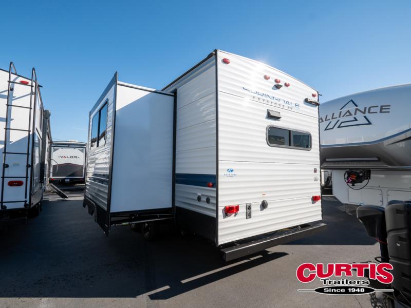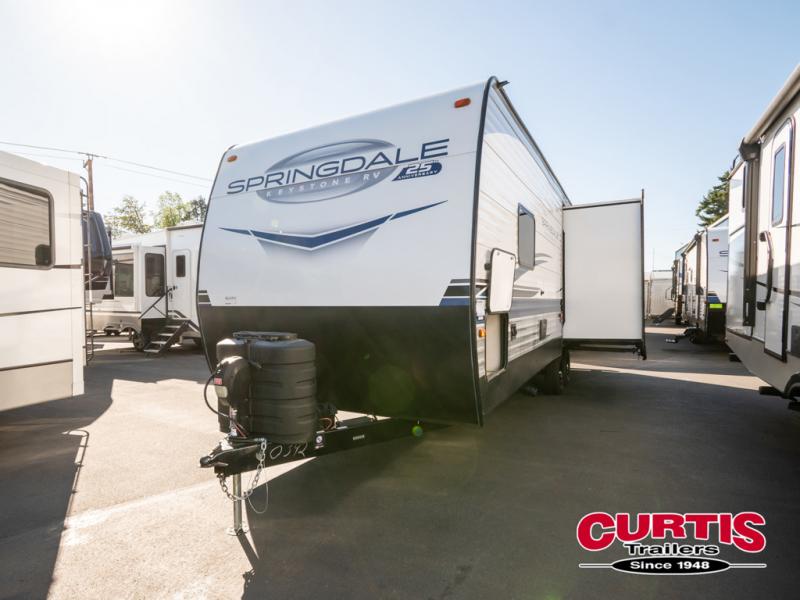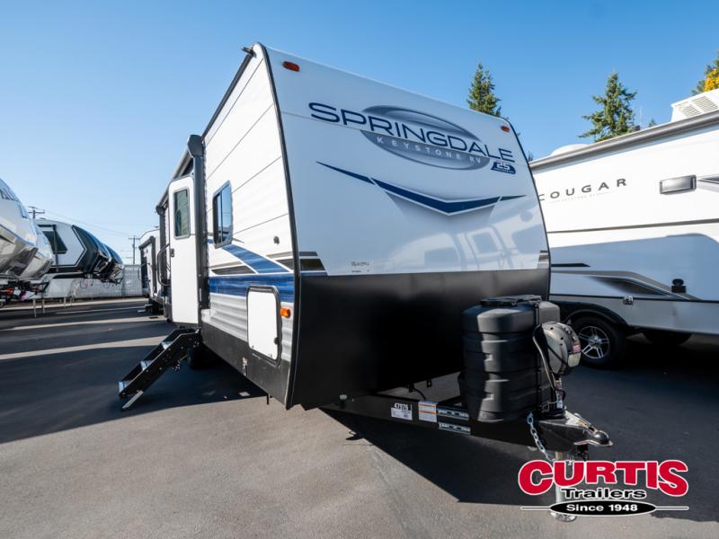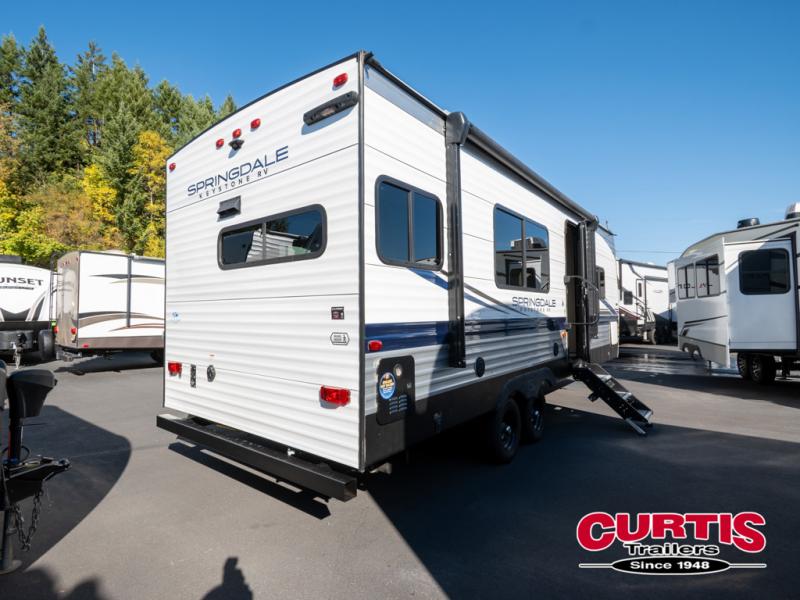 With any Springdale travel trailer by Keystone you will enjoy convenient amenities and comfortable camping features at every turn. The aluminum exterior will be easy to clean, and the power awning provides protection against the hot summer sun. There is also an exterior shower, a friction hinge entry door, and an XL entry assist handle to safely enter and exit the unit. You will find many comforts inside, including a stainless steel sink, ample storage space for your belongings, and cozy sleeping spaces. Start a new adventure today in a Springdale travel trailer!