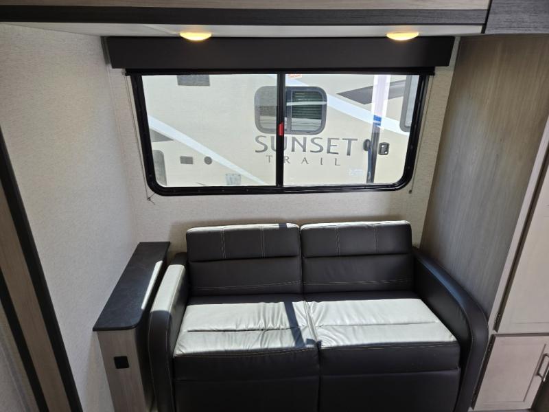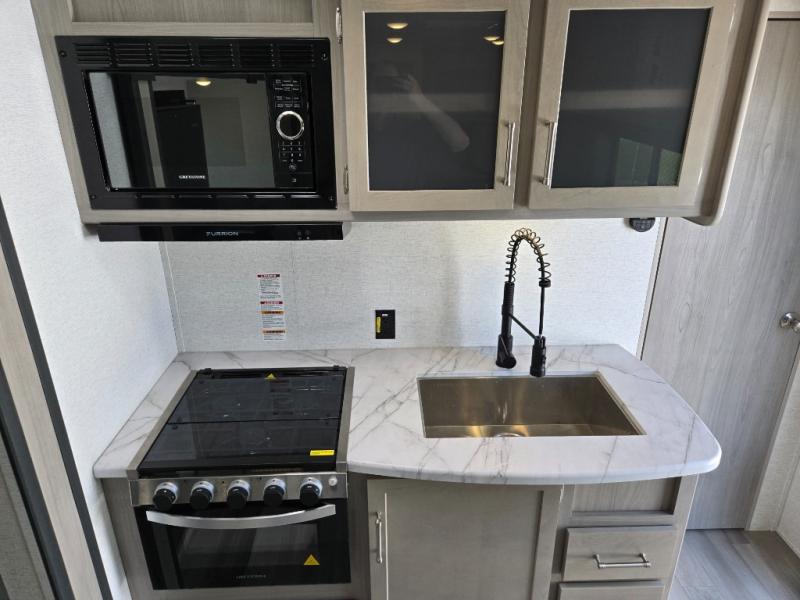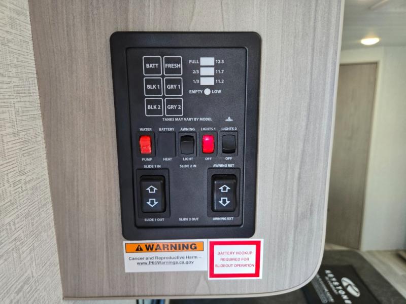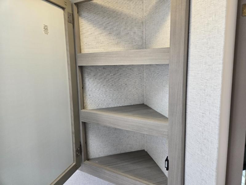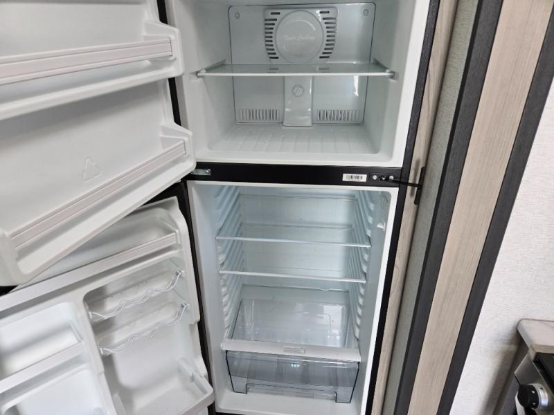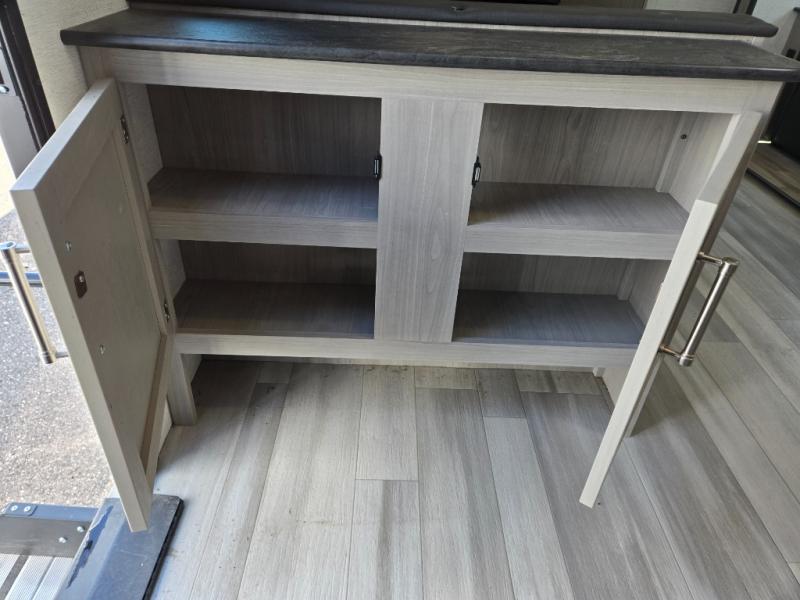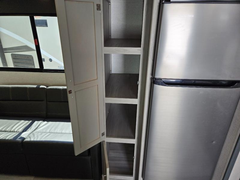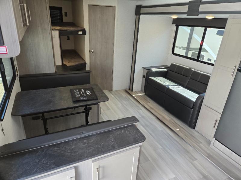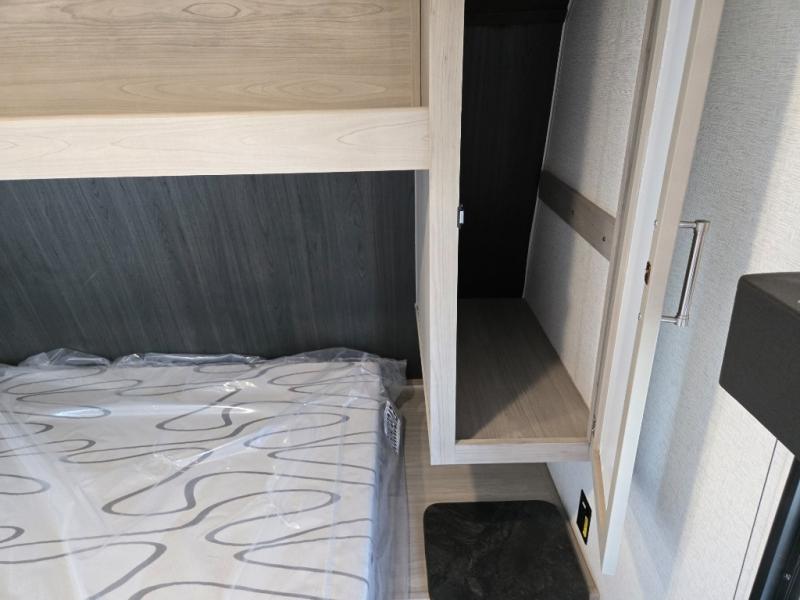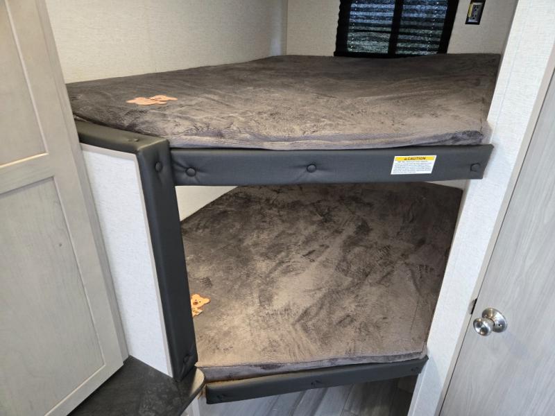 Camping trips in this spacious trailer are sure to bring lasting memories! The little ones or your guests will love the double-size bunks with a flip-up bottom bunk to easily store luggage away. You will have a cozy queen bed in the front bedroom, along with dual closets and nightstands and a laundry chute that will go straight to the pass-through storage. Everyone can meet in the middle living room on the jack knife sofa within the slide out, or you can choose the optional tri-fold sleeper sofa. And don't overlook the full kitchen with a three burner cooktop and 17" oven, microwave oven, and 12V refrigerator. There is even an outdoor griddle and refrigerator so you can grab a cold drink while relaxing under the 14' awning!