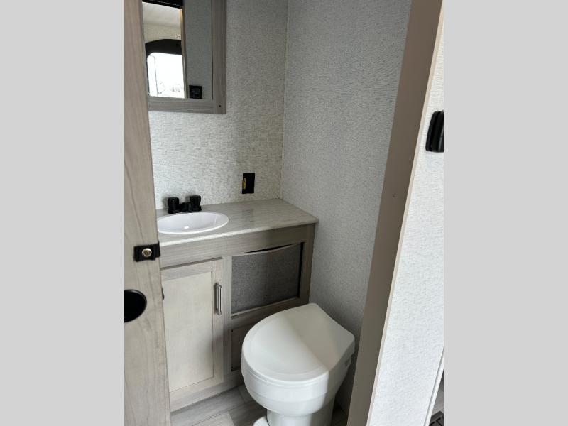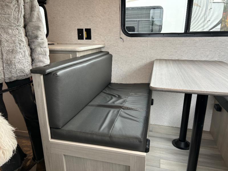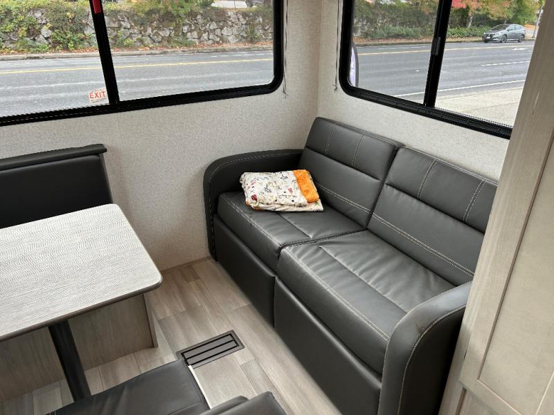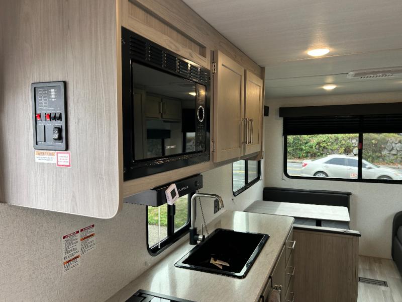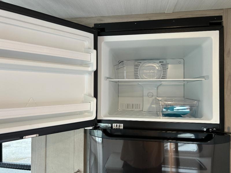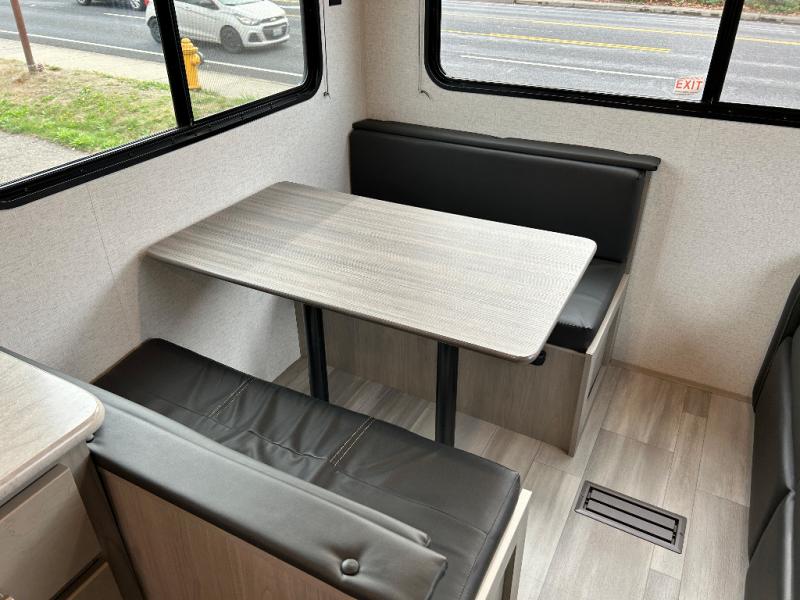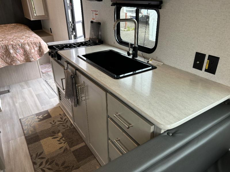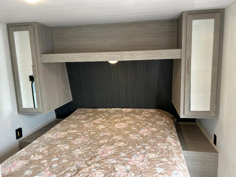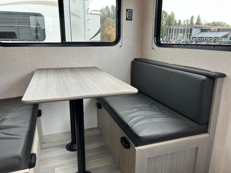 This trailer is perfect for your crew of four to six. There is a queen bed in the semi-private bedroom, along with dual closets and nightstands to keep your things tidy. You can dine each day on the booth dinette, relax on the sofa, and house additional guests here at night. The kitchen includes everything you need to prepare meals each day, including a two burner gas range, a .9 cu. ft. microwave, and a 10 cu. ft. 12V refrigerator for cold items. And the full bath on board lets you stay clean throughout each camping trip!