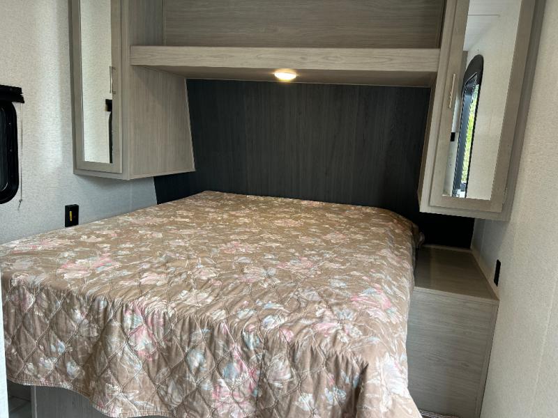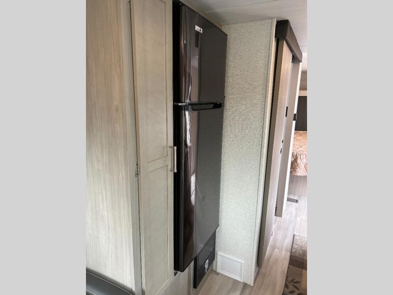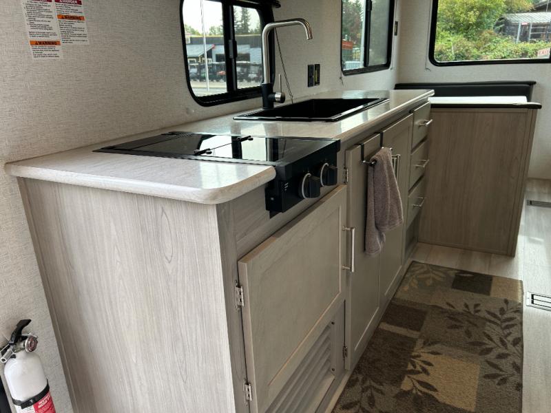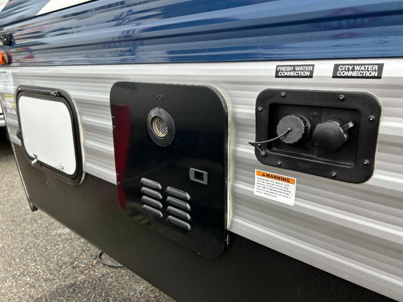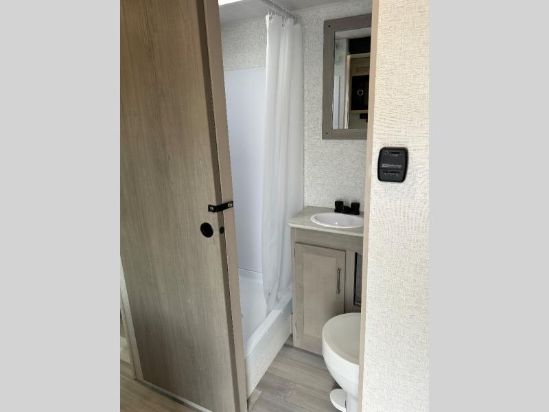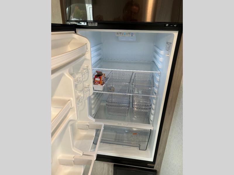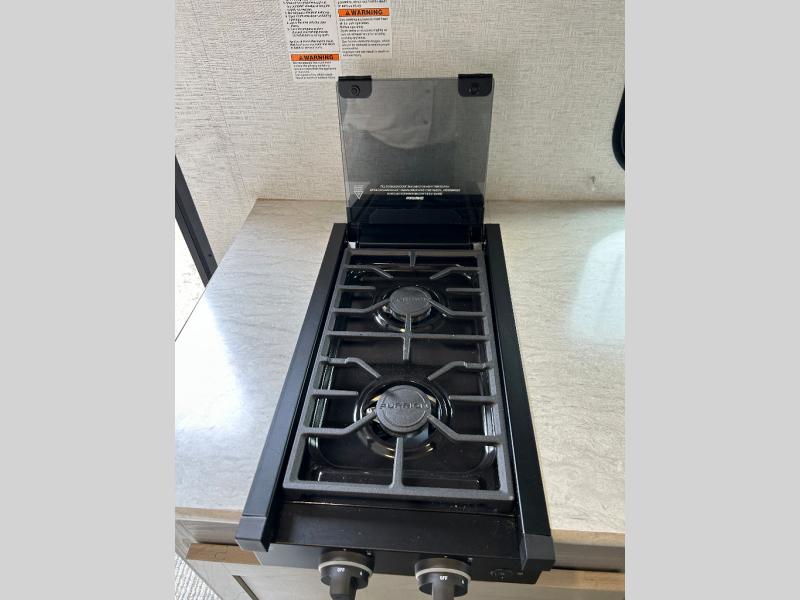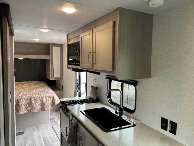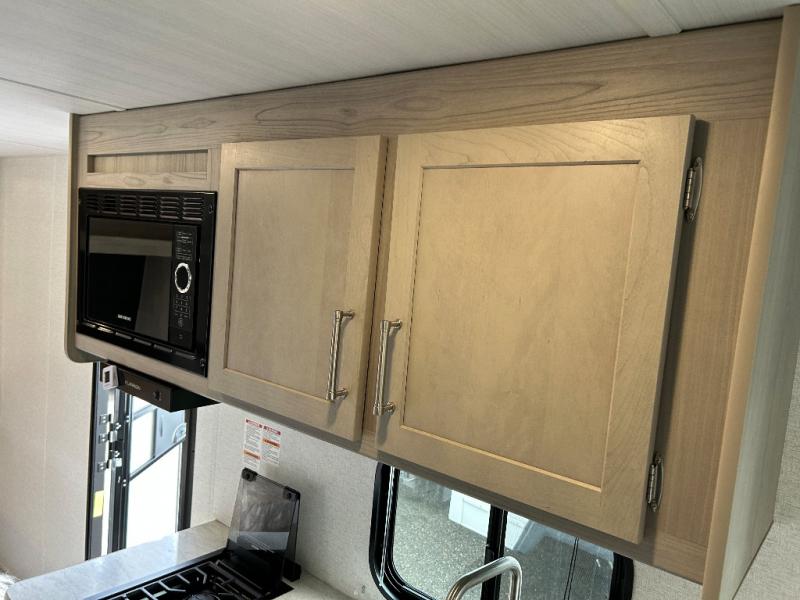 This trailer is perfect for your crew of four to six. There is a queen bed in the semi-private bedroom, along with dual closets and nightstands to keep your things tidy. You can dine each day on the booth dinette, relax on the sofa, and house additional guests here at night. The kitchen includes everything you need to prepare meals each day, including a two burner gas range, a .9 cu. ft. microwave, and a 10 cu. ft. 12V refrigerator for cold items. And the full bath on board lets you stay clean throughout each camping trip!