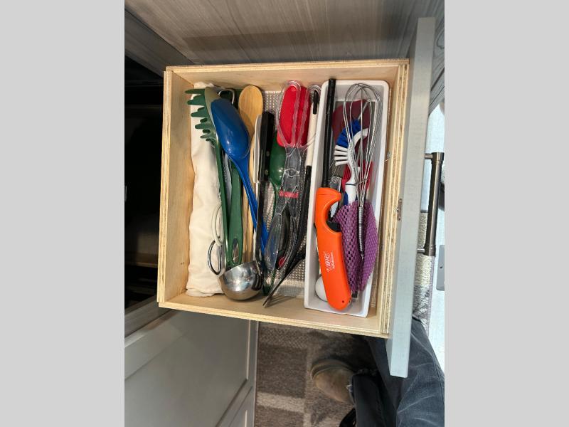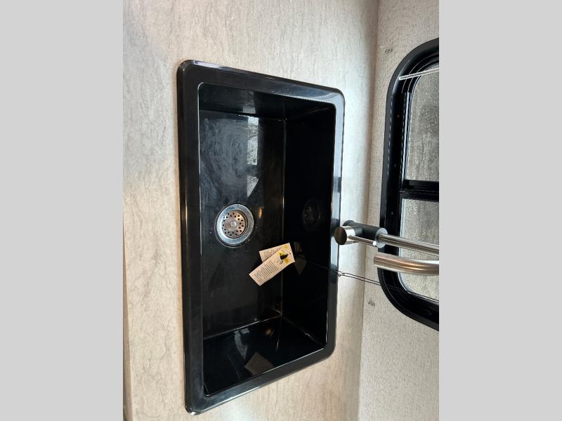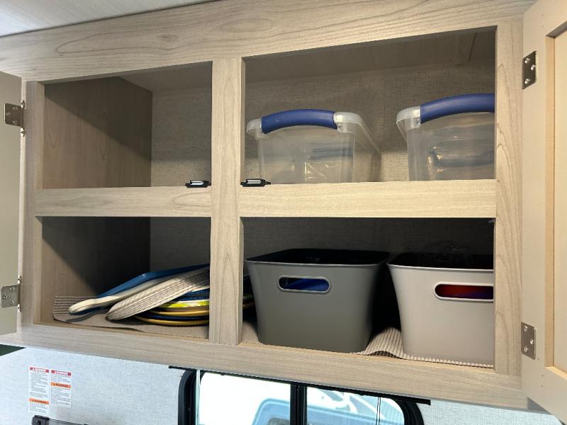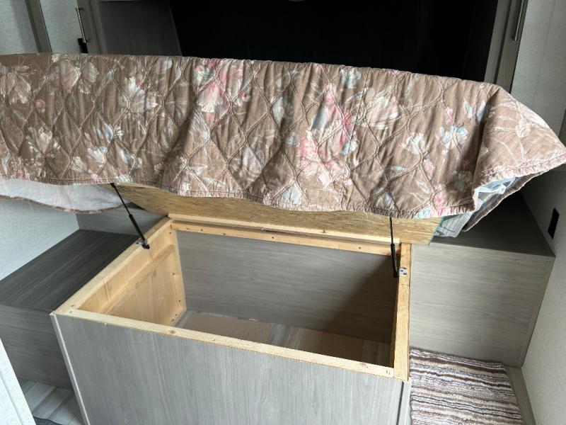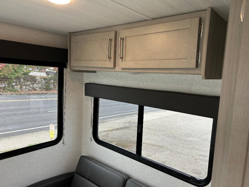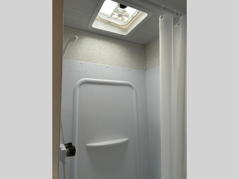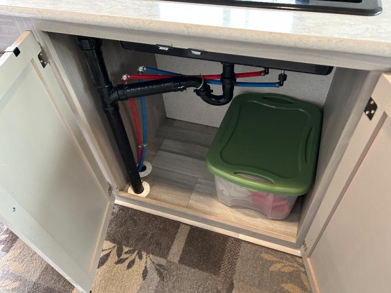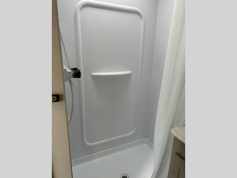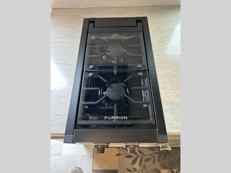 This trailer is perfect for your crew of four to six. There is a queen bed in the semi-private bedroom, along with dual closets and nightstands to keep your things tidy. You can dine each day on the booth dinette, relax on the sofa, and house additional guests here at night. The kitchen includes everything you need to prepare meals each day, including a two burner gas range, a .9 cu. ft. microwave, and a 10 cu. ft. 12V refrigerator for cold items. And the full bath on board lets you stay clean throughout each camping trip!