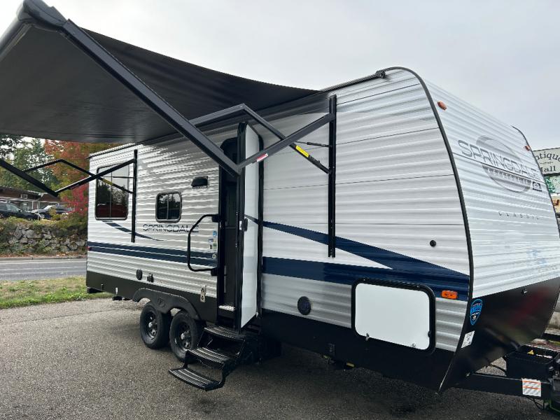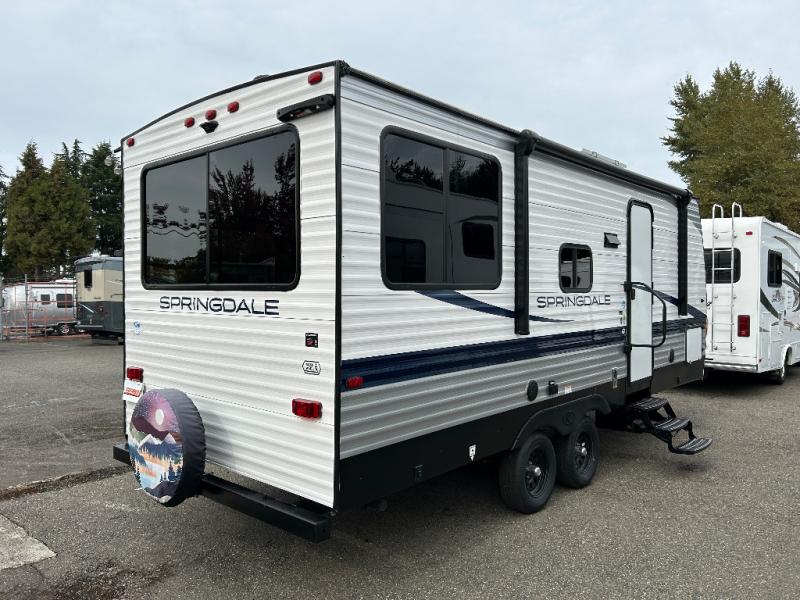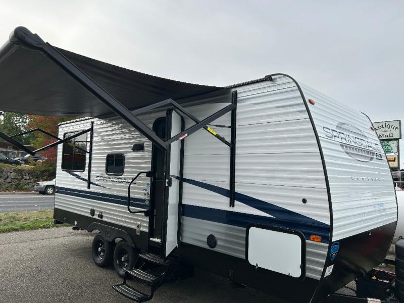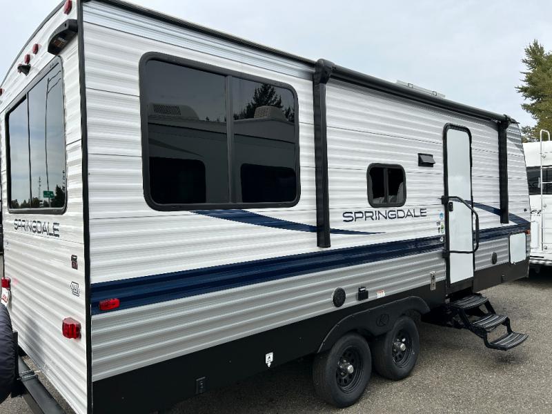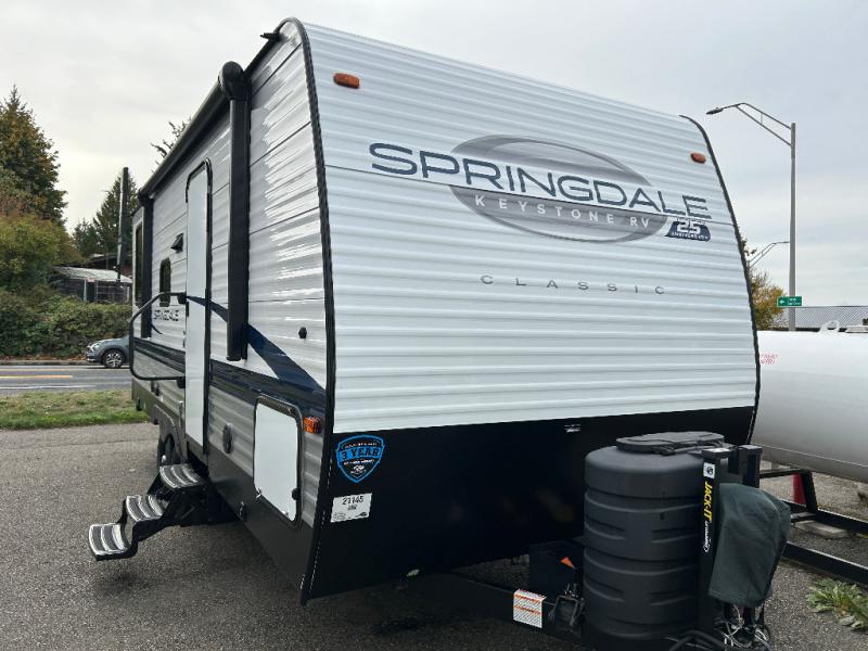 The Springdale Classic travel trailers by Keystone will provide you and your family many great outdoor experiences and it will also be kind to your pocketbook. Each one is constructed with an aluminum exterior, a walkable roof, and an I-beam frame with stamped steel cross-members and outriggers for added strength. There are also electric stabilizer jacks and power tongue jacks outside, along with a friction hinge entry door and an XL entry assist handle for added convenience. Each travel trailer includes a two burner flush mount gas range with a glass cover, LED lighting, bedside outlets, and blackout night shades inside that will provide you with more privacy at night. Some of the Keystone Exclusives you'll appreciate are the color-coded unified wiring and in-floor heating ducts, and the optional SolarFlex 200 will let you add off-grid capabilities if you choose!