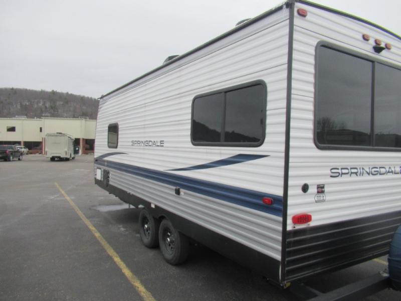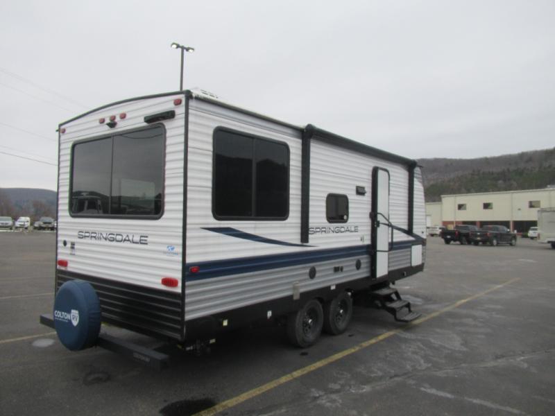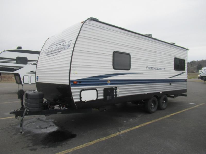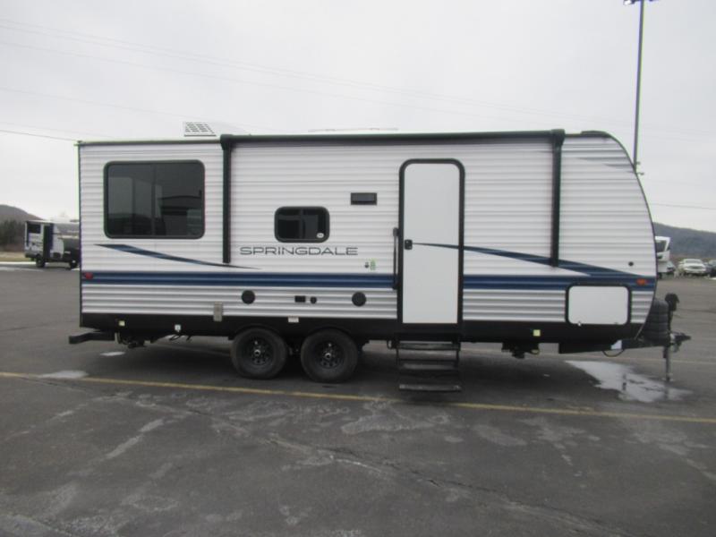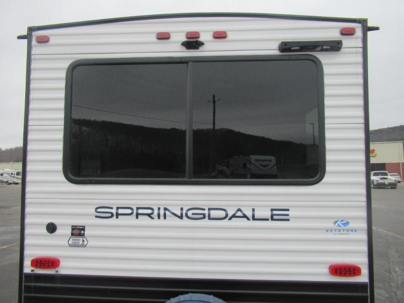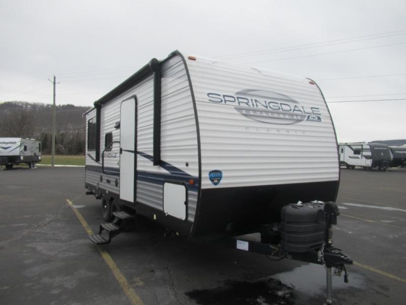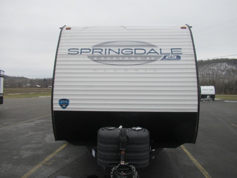 The Springdale Classic travel trailers by Keystone will provide you and your family many great outdoor experiences and it will also be kind to your pocketbook. Each one is constructed with an aluminum exterior, a walkable roof, and an I-beam frame with stamped steel cross-members and outriggers for added strength. There are also electric stabilizer jacks and power tongue jacks outside, along with a friction hinge entry door and an XL entry assist handle for added convenience. Each travel trailer includes a two burner flush mount gas range with a glass cover, LED lighting, bedside outlets, and blackout night shades inside that will provide you with more privacy at night. Some of the Keystone Exclusives you'll appreciate are the color-coded unified wiring and in-floor heating ducts, and the optional SolarFlex 200 will let you add off-grid capabilities if you choose!