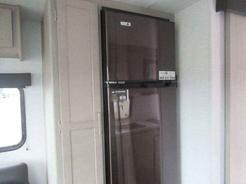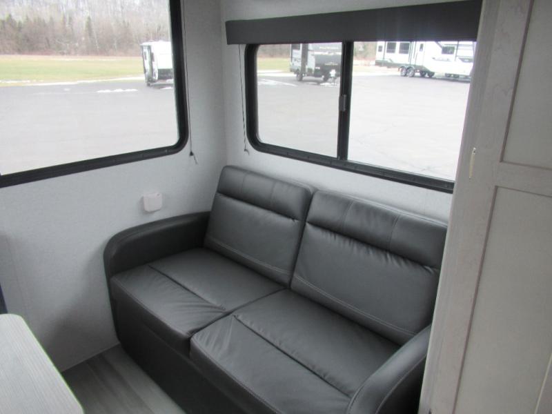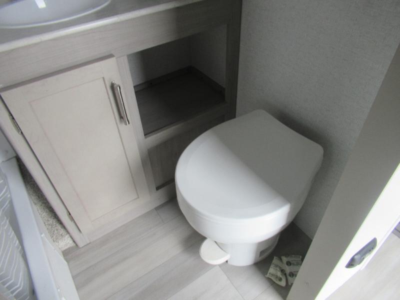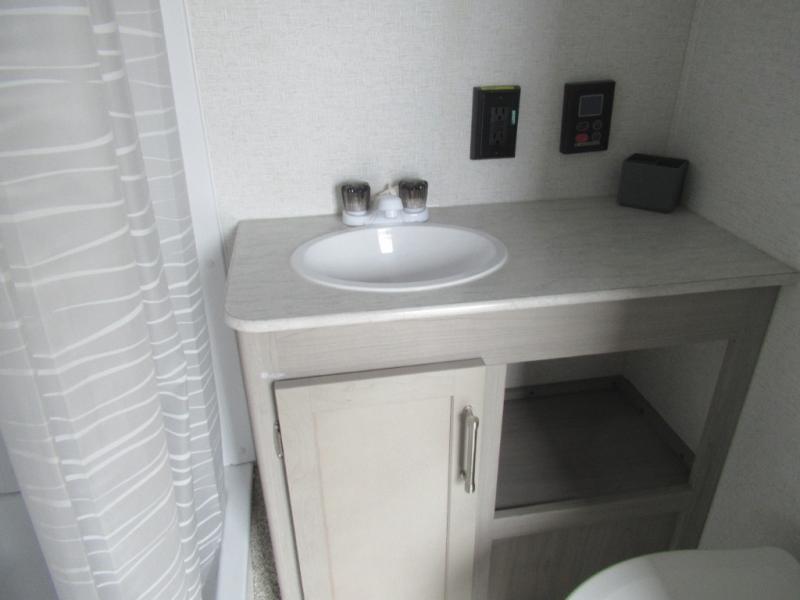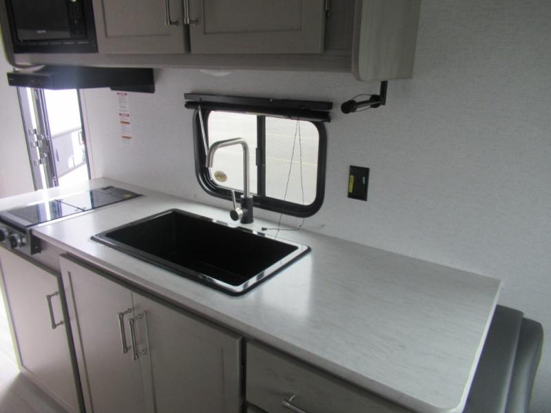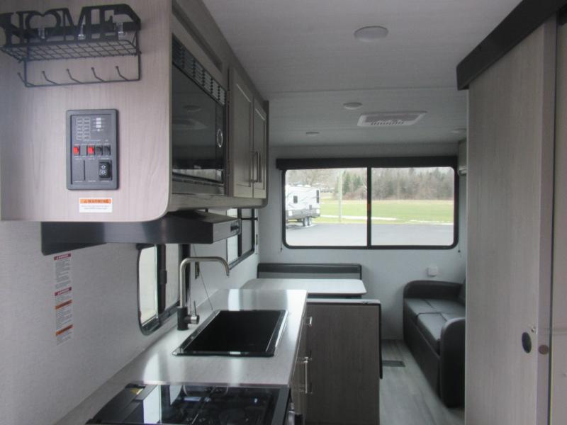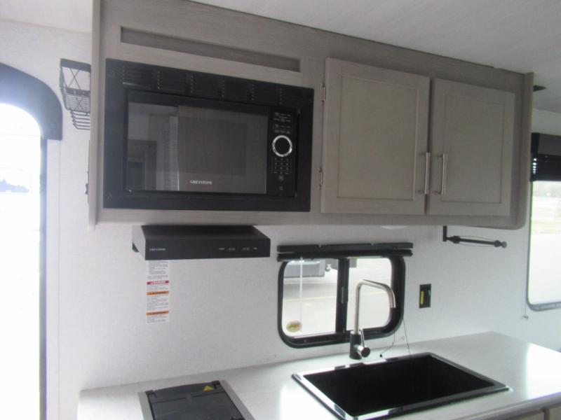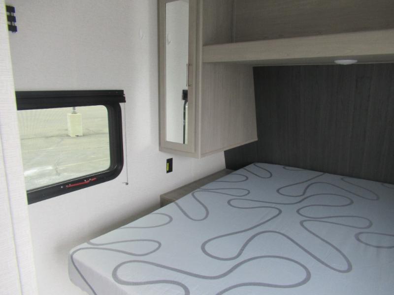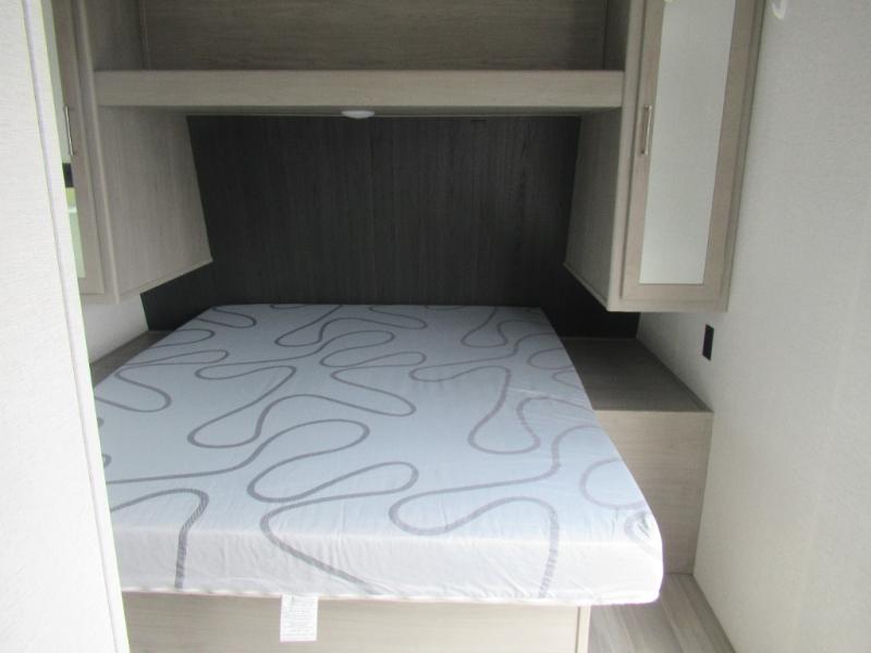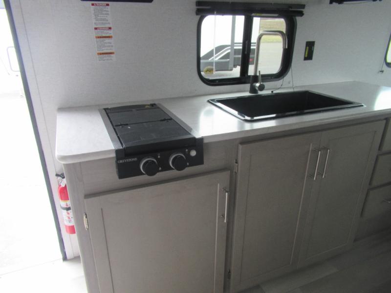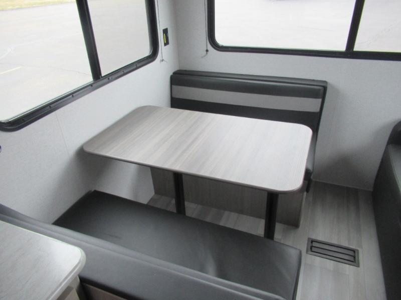 This trailer is perfect for your crew of four to six. There is a queen bed in the semi-private bedroom, along with dual closets and nightstands to keep your things tidy. You can dine each day on the booth dinette, relax on the sofa, and house additional guests here at night. The kitchen includes everything you need to prepare meals each day, including a two burner gas range, a .9 cu. ft. microwave, and a 10 cu. ft. 12V refrigerator for cold items. And the full bath on board lets you stay clean throughout each camping trip!