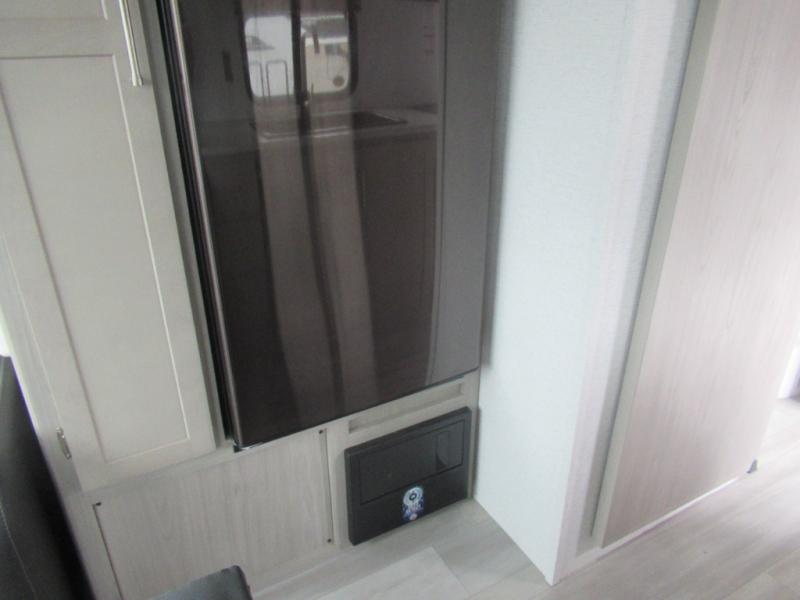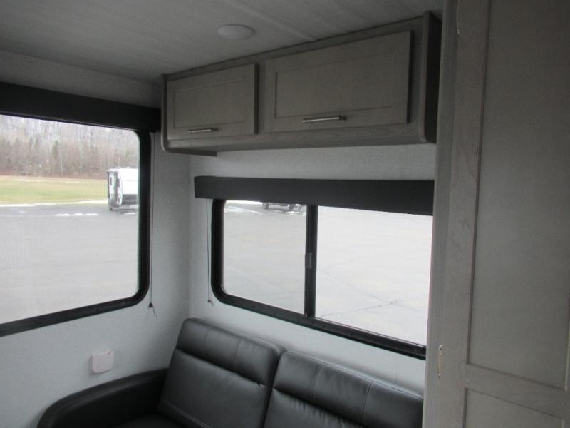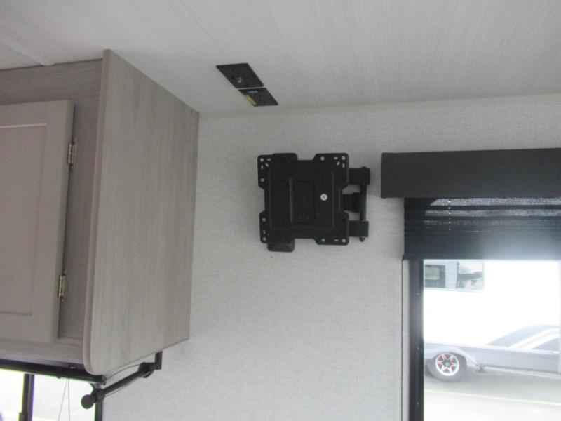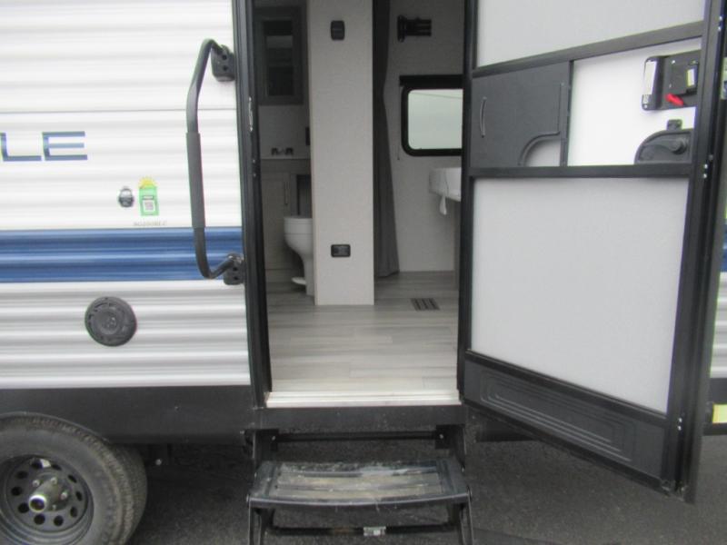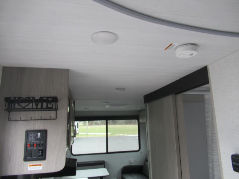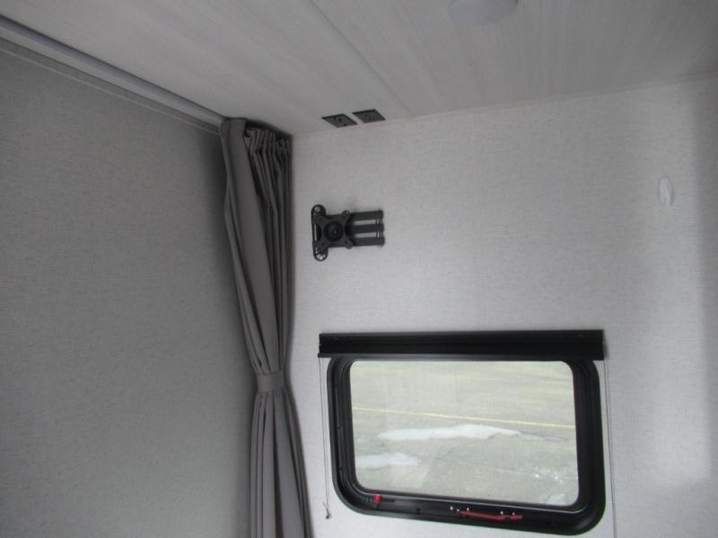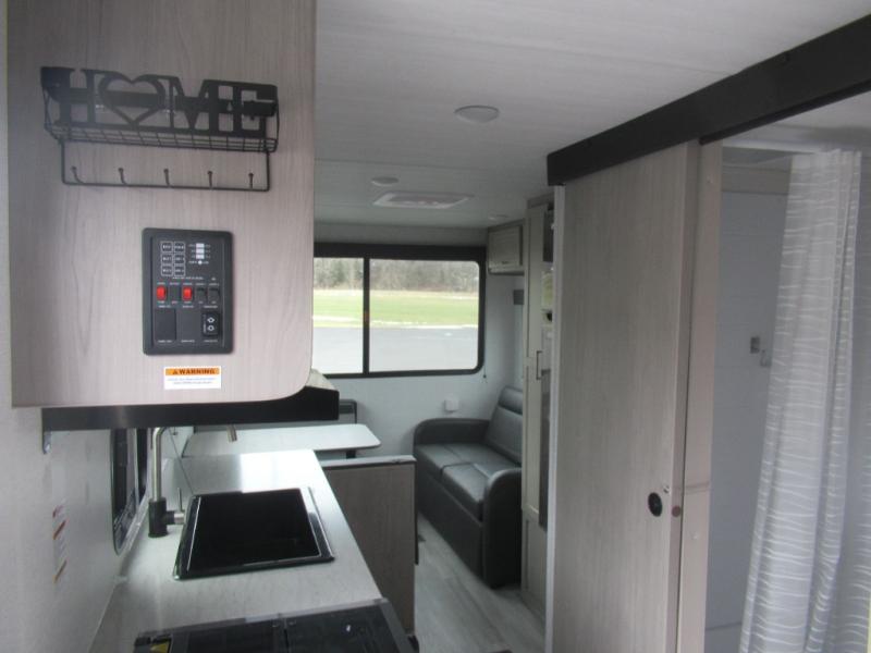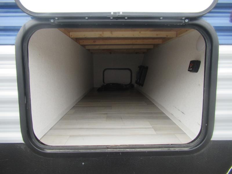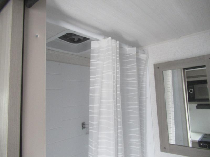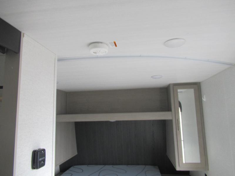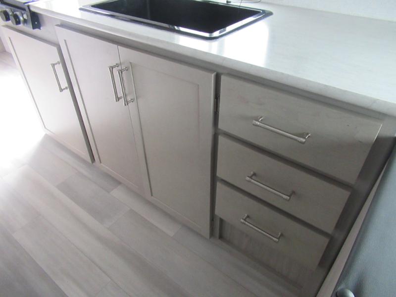 This trailer is perfect for your crew of four to six. There is a queen bed in the semi-private bedroom, along with dual closets and nightstands to keep your things tidy. You can dine each day on the booth dinette, relax on the sofa, and house additional guests here at night. The kitchen includes everything you need to prepare meals each day, including a two burner gas range, a .9 cu. ft. microwave, and a 10 cu. ft. 12V refrigerator for cold items. And the full bath on board lets you stay clean throughout each camping trip!