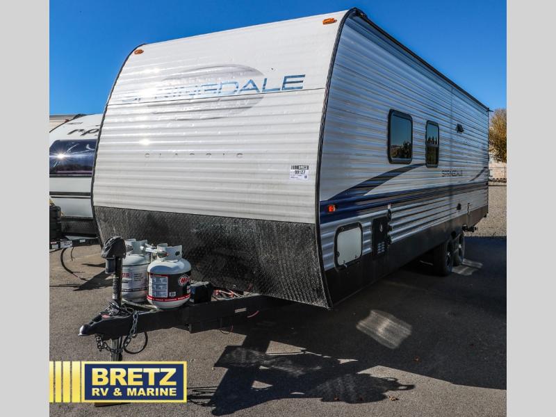 The Springdale Classic travel trailers by Keystone will provide you and your family many great outdoor experiences and it will also be kind to your pocketbook. Each one is constructed with an aluminum exterior, a walkable roof, and an I-beam frame with stamped steel cross-members and outriggers for added strength. There are also electric stabilizer jacks and power tongue jacks outside, along with a friction hinge entry door and an XL entry assist handle for added convenience. Each travel trailer includes a two burner flush mount gas range with a glass cover, LED lighting, bedside outlets, and blackout night shades inside that will provide you with more privacy at night. Some of the Keystone Exclusives you'll appreciate are the color-coded unified wiring and in-floor heating ducts, and the optional SolarFlex 200 will let you add off-grid capabilities if you choose!