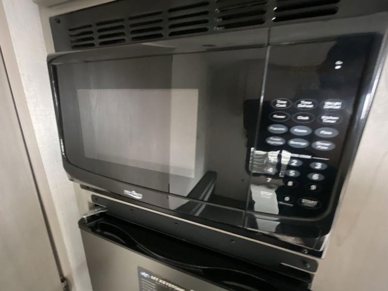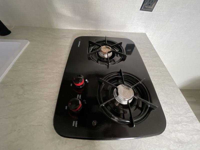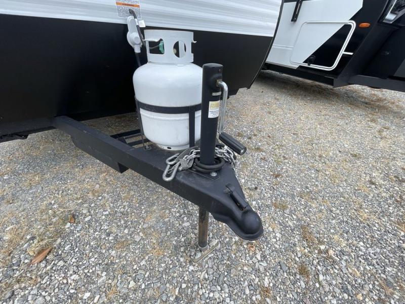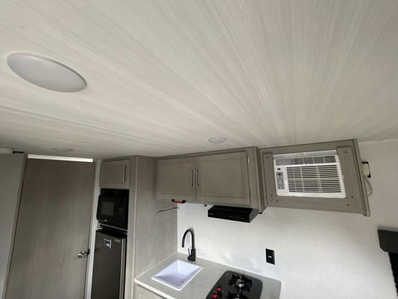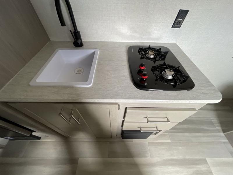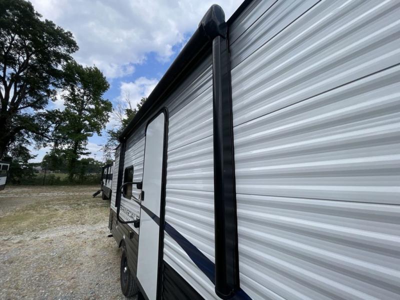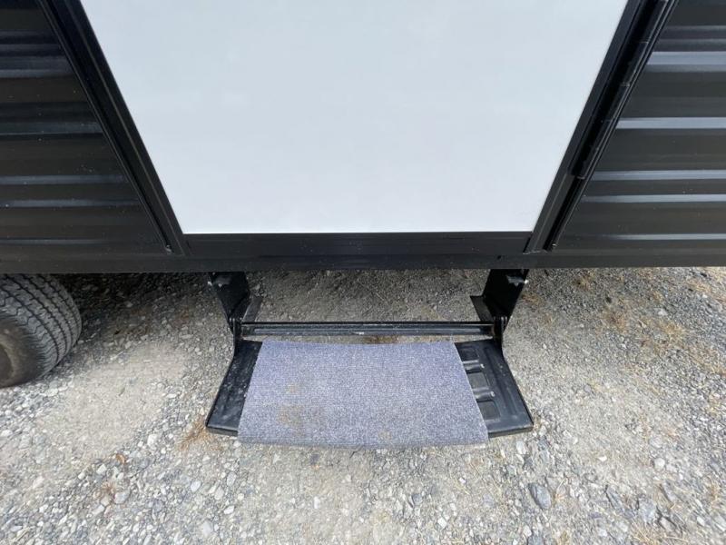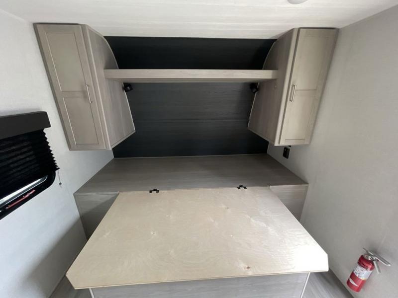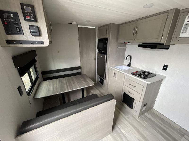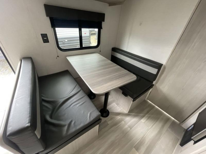 This cozy trailer for two or four will have you out enjoying nature easily. There is a queen bed for you, and the booth dinette can easily transform into a bed for one or two more campers if needed at night. The rear private bath features a shower and vanity with sink, plus toilet so no late night trips to the campground bathroom. There is ample storage in overhead cabinets on both sides of the trailer, as well as dual closets and nightstands on either side of the bed. A 10' awning offers even more living space outside. Grab a couple of camp chairs and enjoy hanging out with your campground neighbors playing corn hole or enjoying a campfire.
