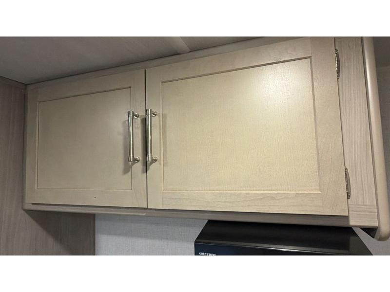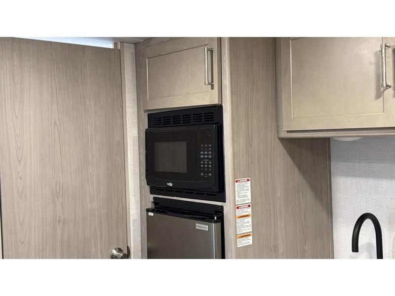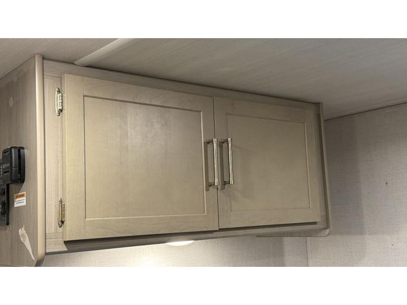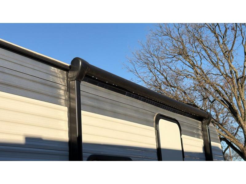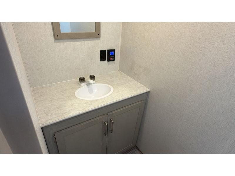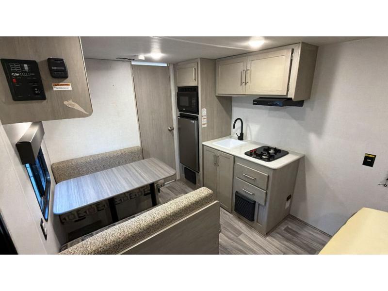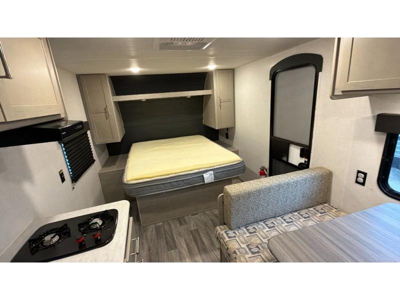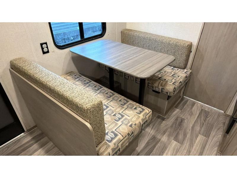 This cozy trailer for two or four will have you out enjoying nature easily. There is a queen bed for you, and the booth dinette can easily transform into a bed for one or two more campers if needed at night. The rear private bath features a shower and vanity with sink, plus toilet so no late night trips to the campground bathroom. There is ample storage in overhead cabinets on both sides of the trailer, as well as dual closets and nightstands on either side of the bed. A 10' awning offers even more living space outside. Grab a couple of camp chairs and enjoy hanging out with your campground neighbors playing corn hole or enjoying a campfire.