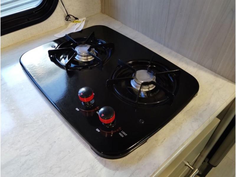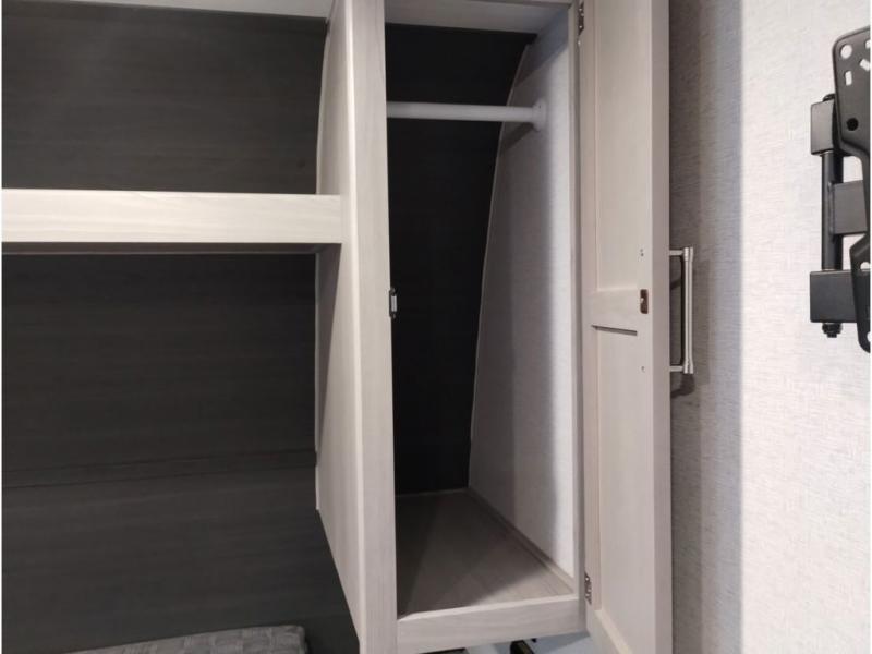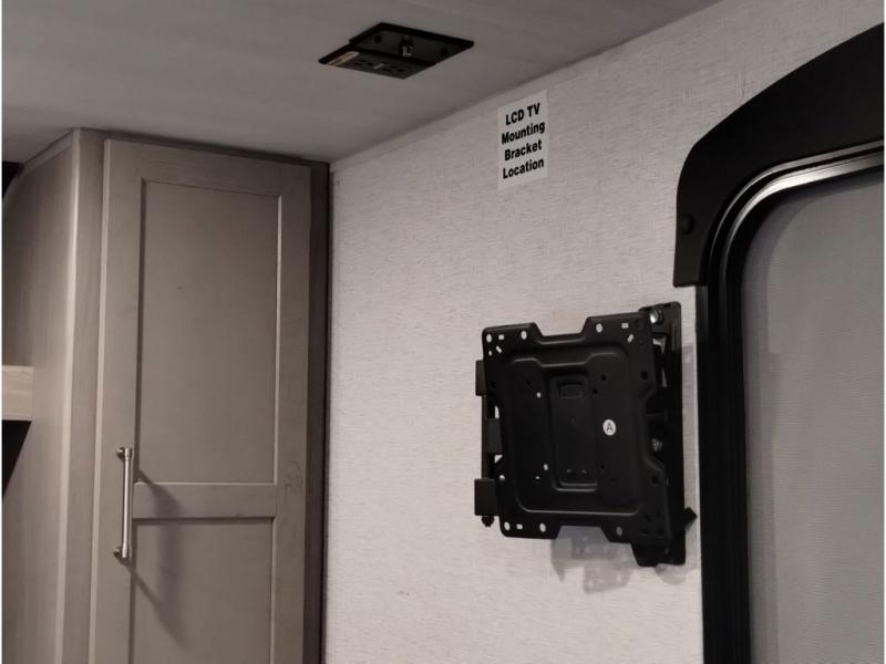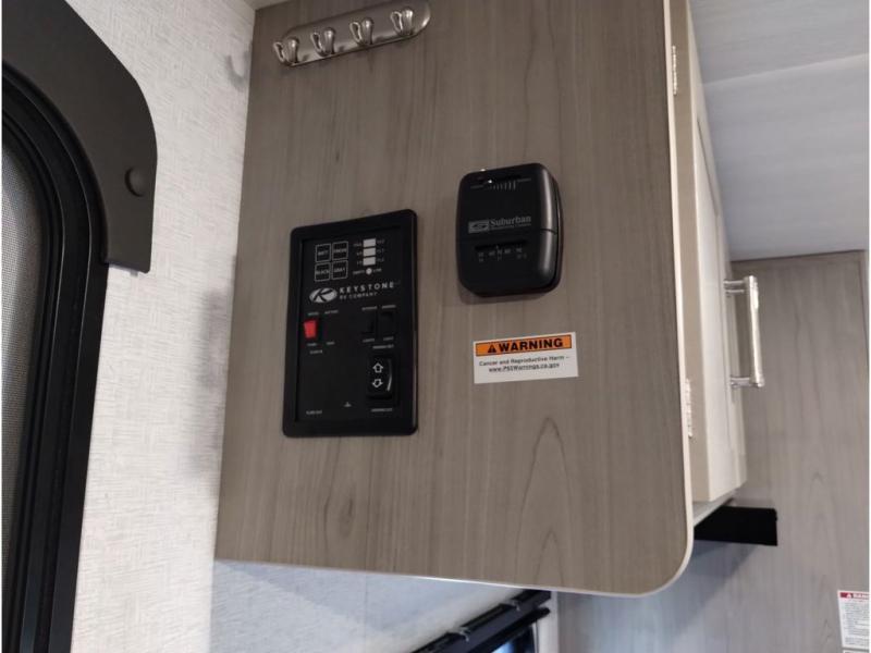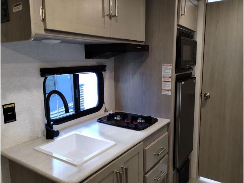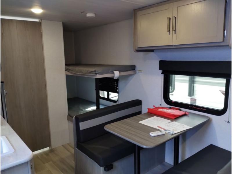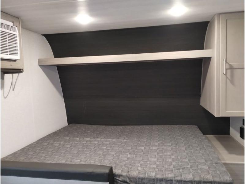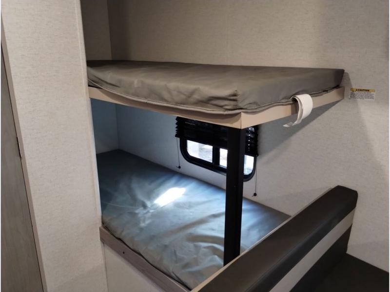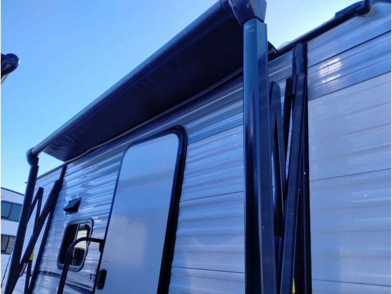 Get ready for outdoor fun with your favorite people when you have this trailer in tow! Once at your campsite, you can easily setup the 10' power awning, grab your camping chairs from the pass-through storage, and relax or start playing. The cook will love the galley kitchen with the two burner cooktop and microwave oven, plus a refrigerator for cold items. If you like, you can eat inside at the booth dinette which doubles as sleeping space, and of course the kids will love the bunk beds next to the full bathroom. And you will sleep soundly on the front queen bed.