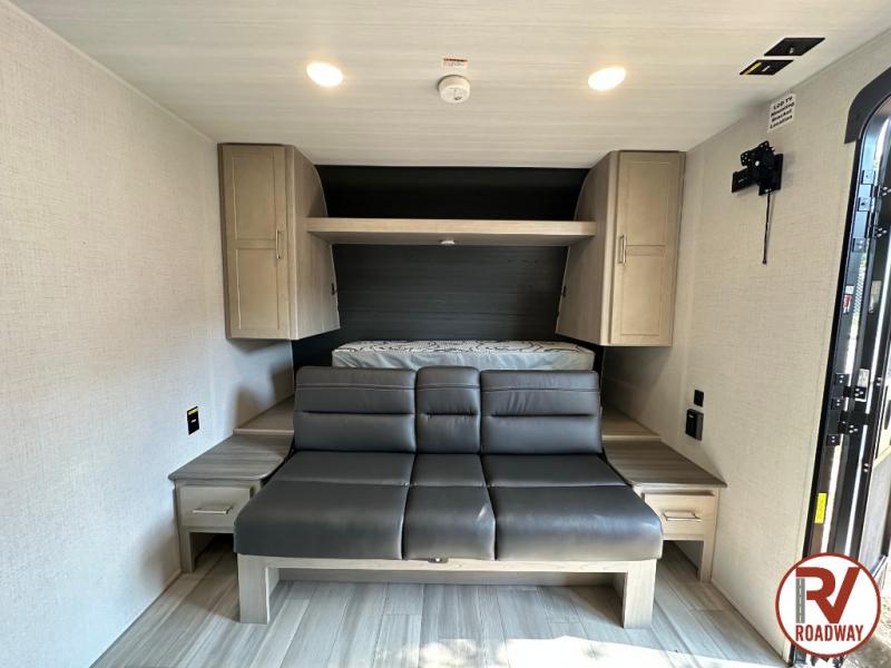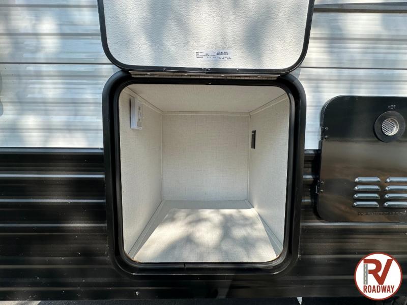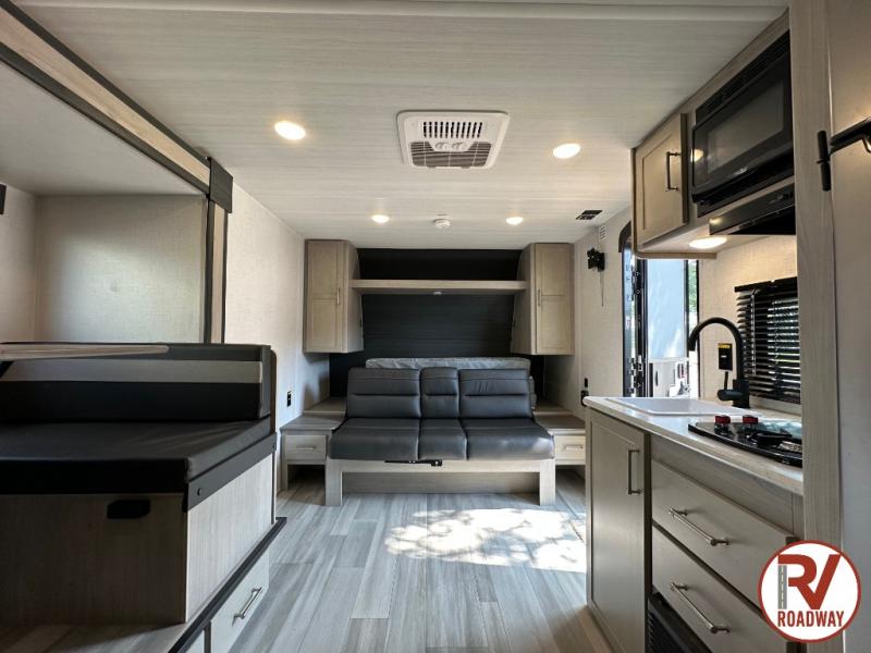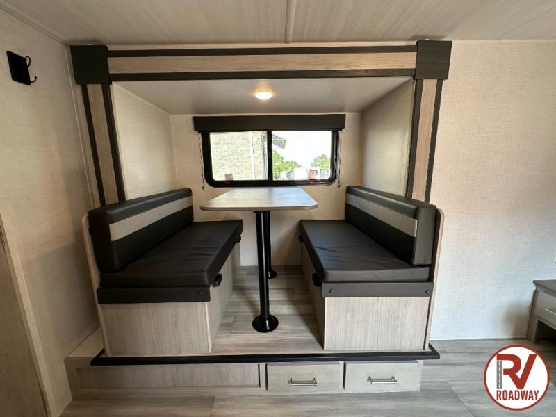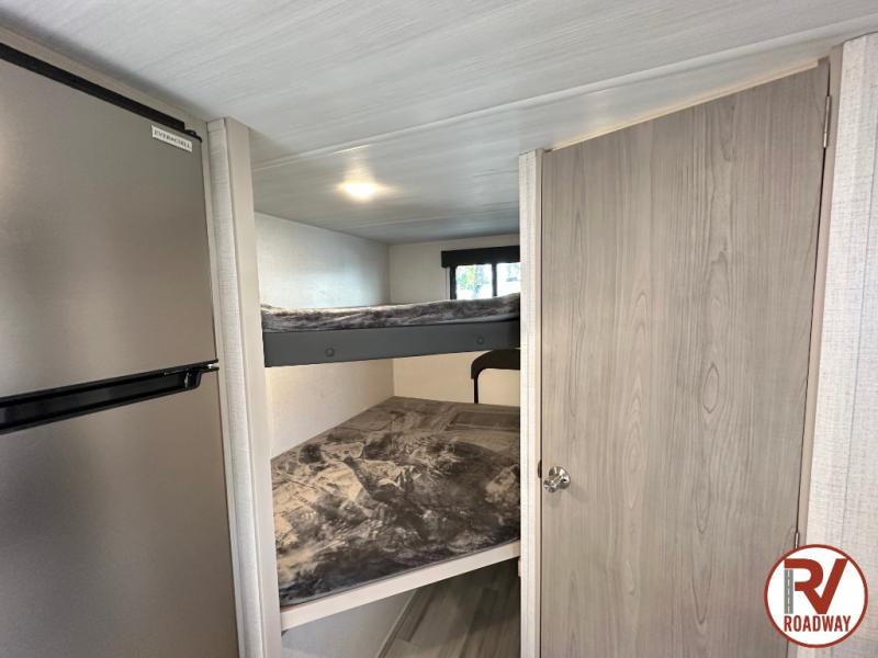 This cute Springdale Classic Mini bunk model will easily sleep eight with the 30" x 74" bunk bed, u-shaped dinette slide, and queen Miller bed which features a fold-down sofa at the end. During the daytime, you can have the seating you need and want, and at night the sofa folds to become part of the front bed. The rear corner bath is convenient and features a tub/shower, toilet, and sink. The kitchen is fully equipped to allow you to cook as you travel. There is even an outdoor refrigerator for your beverages and snacks. Enjoy them while under the 15' power awning. A handy pass-through storage compartment up front offers ample space for camp equipment, and there is additional outdoor storage accessible beneath the bunk in back.