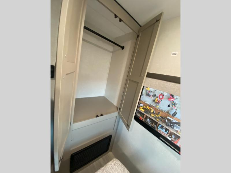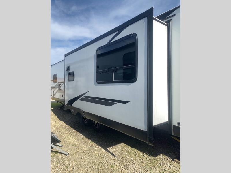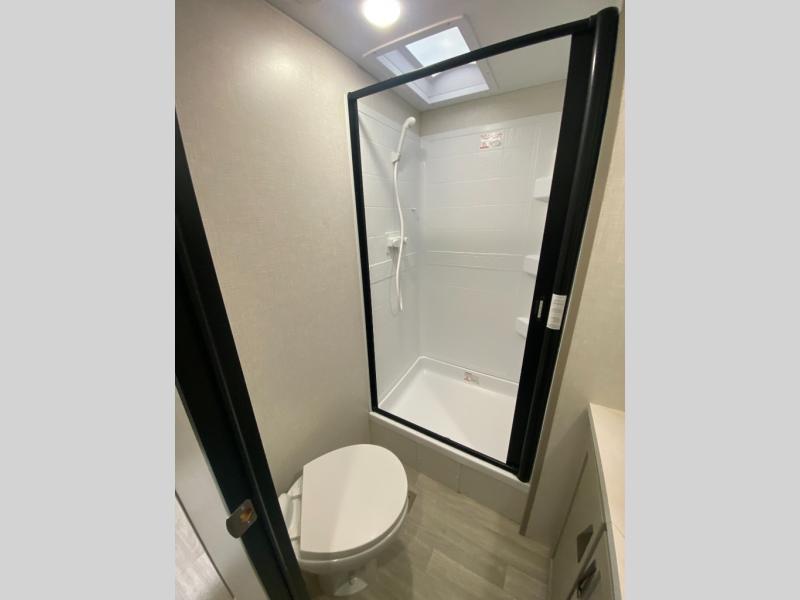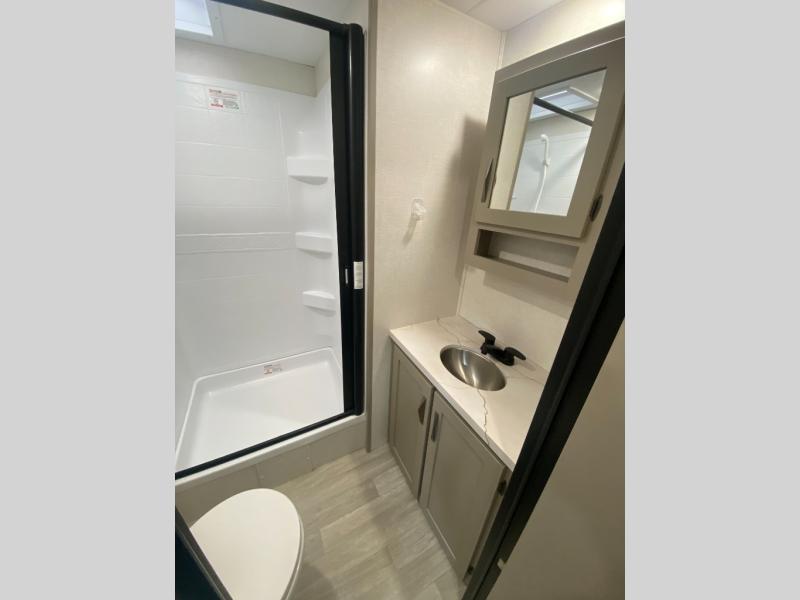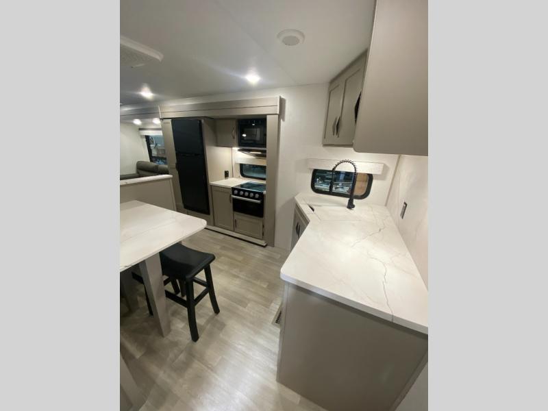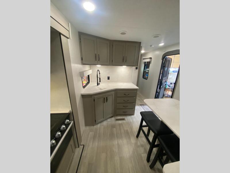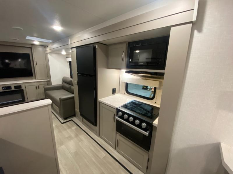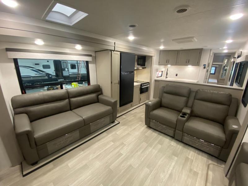 Head for the hills, lake, or woods in this spacious travel trailer. Once your gear is unloaded from the pass-through storage, set up the 19' power awning with LED lights and relax with a cold drink. Once you head inside you can make lunch on the three burner range and dine at the dinette that includes two chairs and bench seating. The rear living area includes a rear entertainment center with an LED TV and a 34" fireplace for a cozy atmosphere. There is also theater seating here and two 70" sofas within the dual opposing slides where your guests can sleep. And you will enjoy the front private bedroom with a king bed all to yourselves!