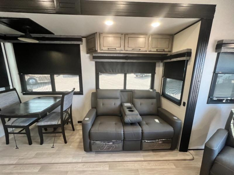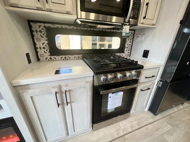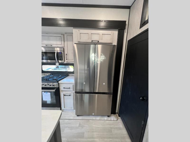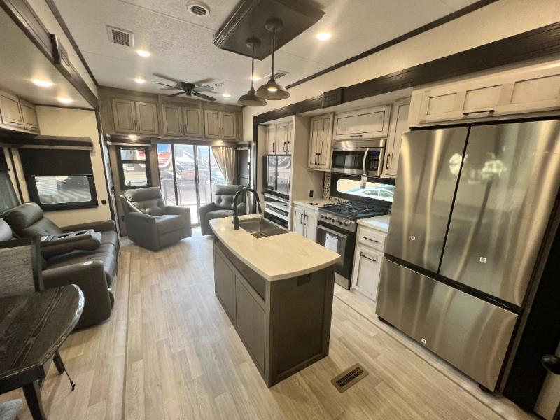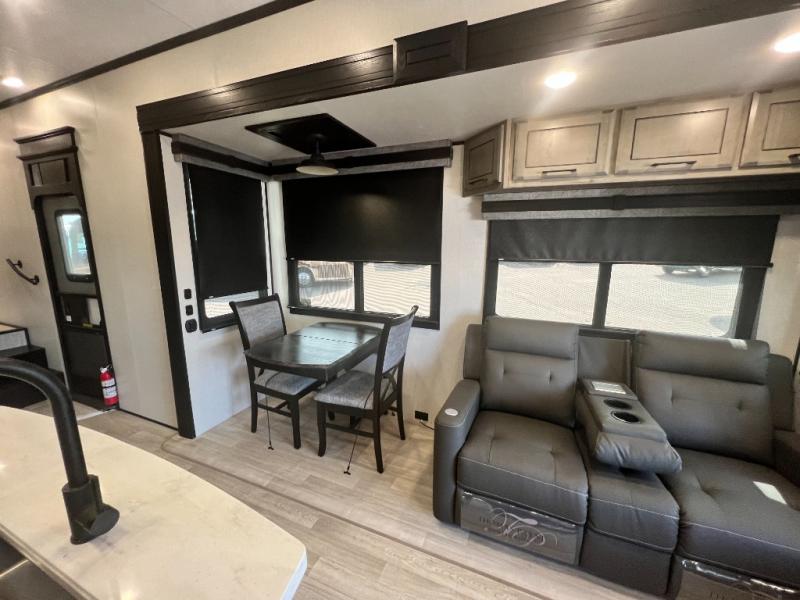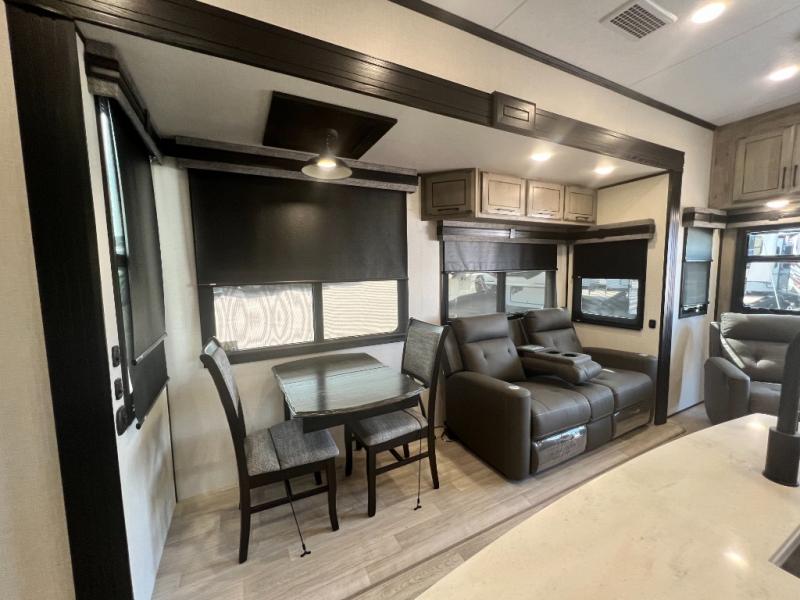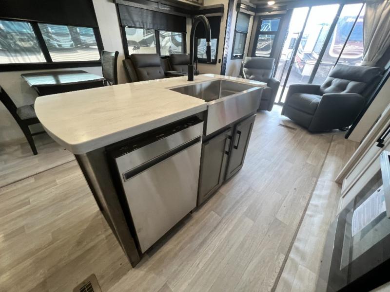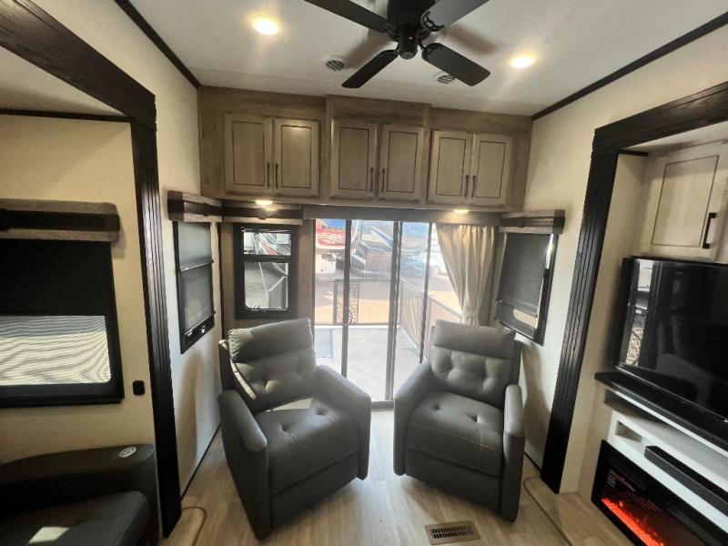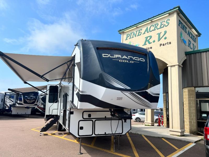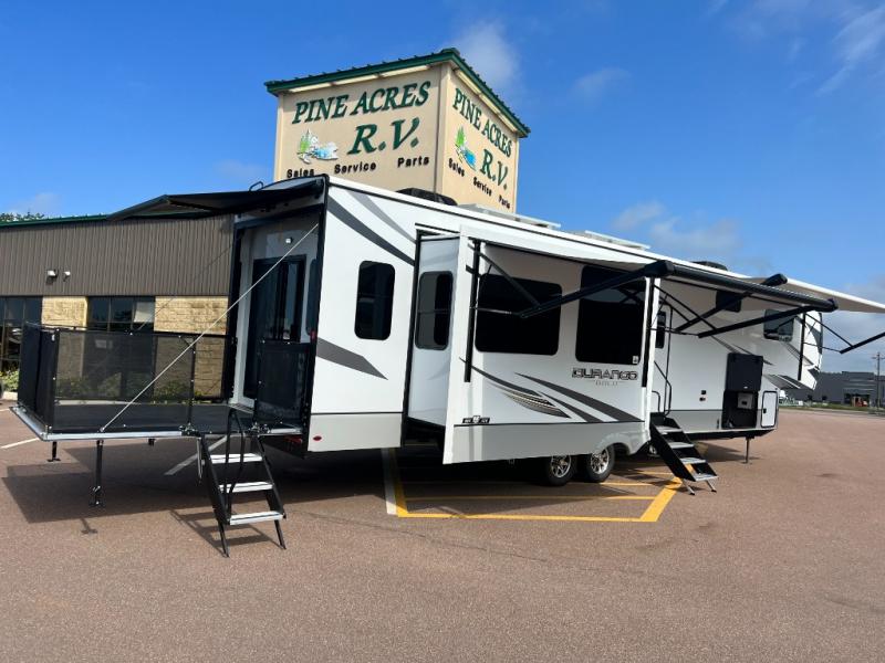 With any KZ Durango Gold full-time luxury fifth wheel, you will enjoy the new Blancher Cherry cabinetry, stainless steel appliances such as a 30" convection microwave and 24" oven with a four burner range, plus a stainless dishwasher. Other top features include an electric tilt bed with Serta Comfort foam king mattress, two 15K A/C units, plus theater seating with powered recline, heat and massage features. You will also appreciate a handy central vacuum system with attachments that stores out of sight. Each Durango Gold is constructed with six-sided aluminum framing, and has a heated, insulated and an enclosed underbelly. It is also constructed with Tufflex roofing material which is flexible, puncture resistant, and reflective. The now standard "Off The Grid" solar package includes two 200W solar panels, a 30A MPPT solar charge controller, and a 2,000W True Sine Wave inverter for off-grid capabilities. If you're wanting to go completely off-grid, you might want to choose the optional Boondocker Solar System with even more features that won't require you to be close to electric hookups!