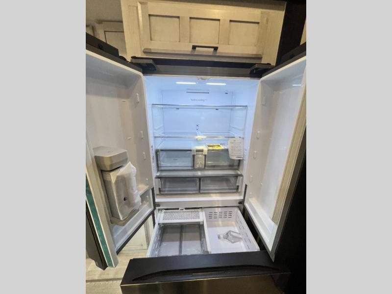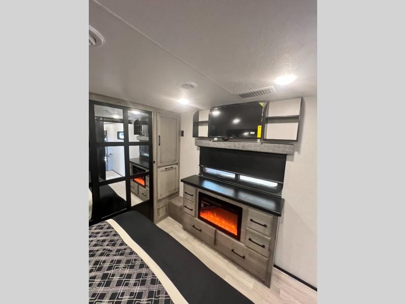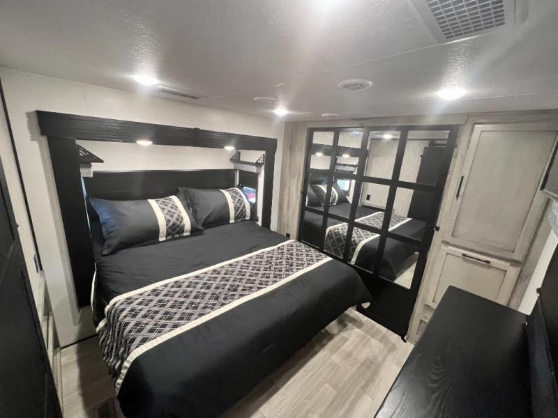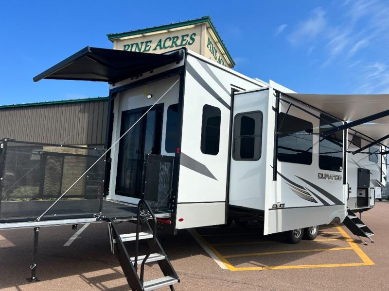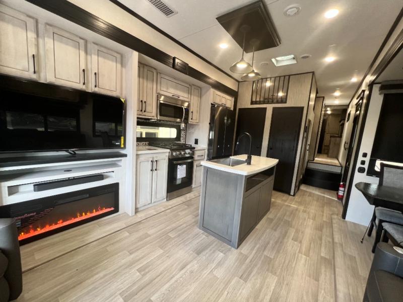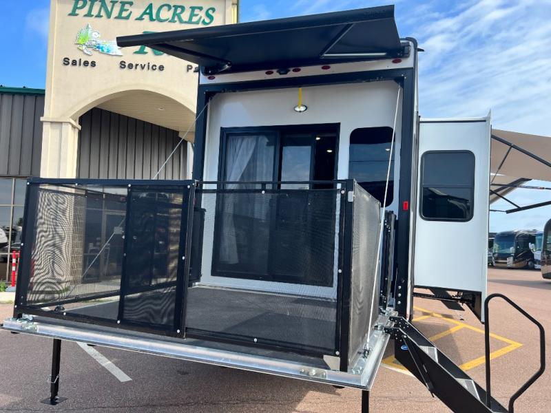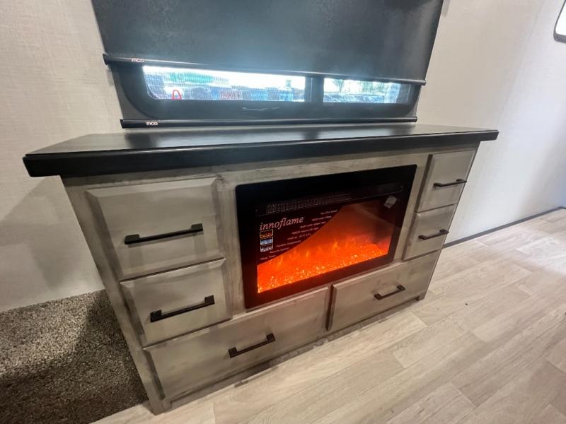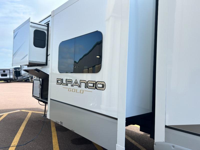 When you enjoy traveling with family and friends, this Durango Gold can provide everything you want, plus more! Beginning with the rear patio door that leads to the unique patio deck that provides a place to relax and unwind as well as stow a few items above ground. When you are ready to experience luxury and comfort head back inside to the fireplace below the 50" Smart LED TV and sit in the chairs or on the hide-a-bed sofa, or even at the dining table. There is a full-timer's desk option to choose as well. The cook will have full amenities, upgraded appliances, a kitchen island with a farmhouse stainless steel sink, solid surface countertops, and a pantry to store lots of goodies. The middle extra room can be utilizes as a bunkhouse, another living area, or even an office because of the desk top, plus there is a queen size loft above. And you will be able to sleep like royalty in the front bedroom with a fireplace. There is plenty of storage for your clothing, as well as a 32" Smart LED TV, plus washer and dryer prep if you want the option to make laundry day easier!