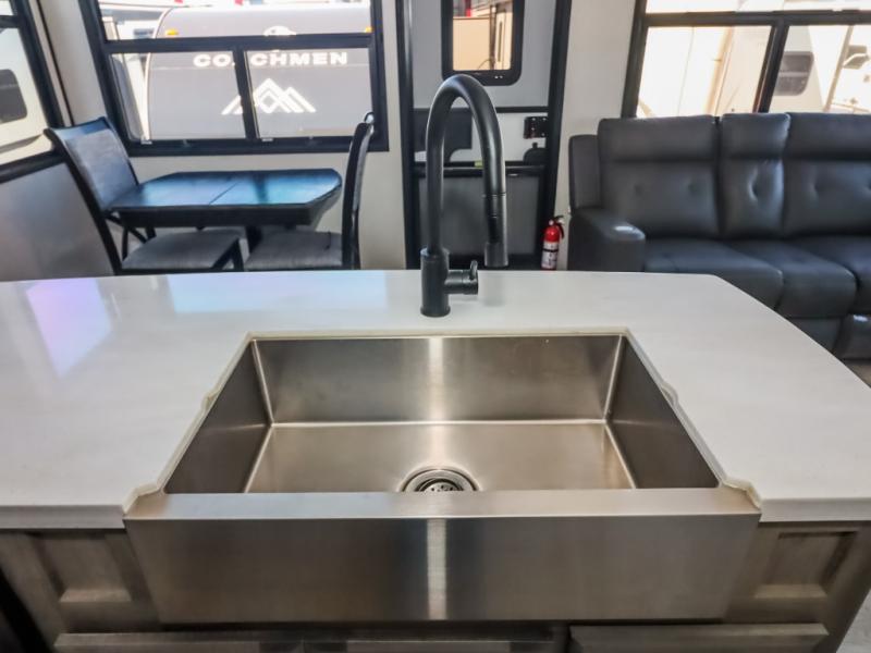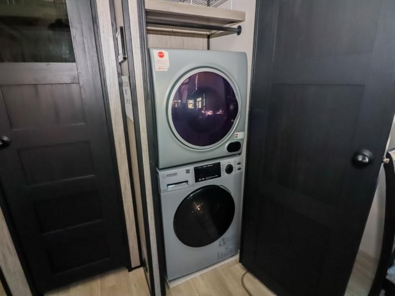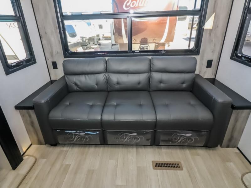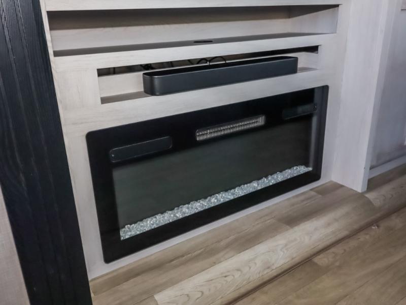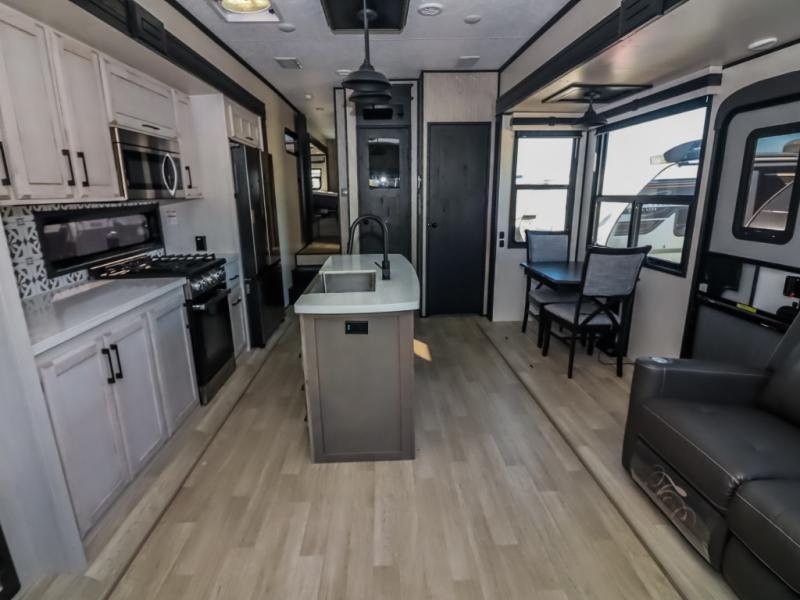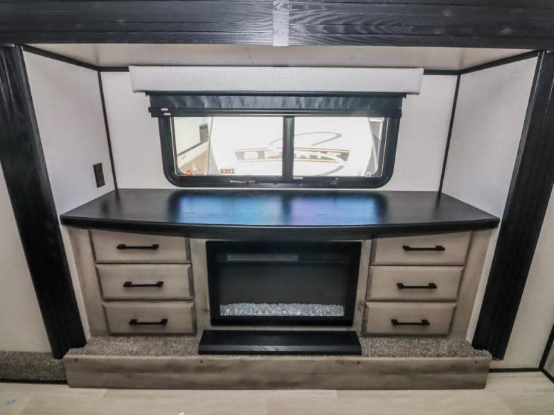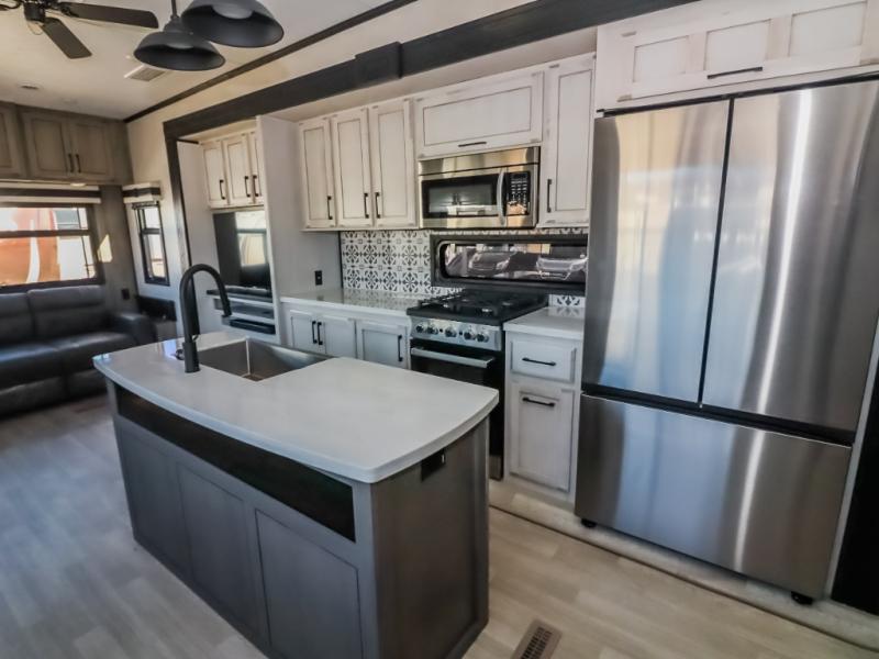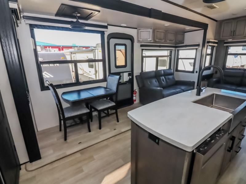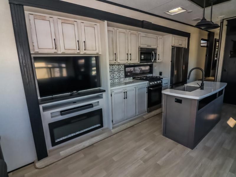 Travel to relax, work, and live in this fifth wheel to experience the ultimate luxury and comfort anywhere you set up camp! The flip-up solid step entry makes it sturdy and safe to enter and exit through the slide out which offers a legless table with chairs on one side and theater seating on the end of it. As you enjoy the spacious living and kitchen area, the cook can make full meals including holiday favorites using the residential appliances, and a farmhouse stainless steel sink in the center island, plus solid surface countertops are both beautiful and easy to clean. There is a pantry as well as washer and dryer prep nearby which both come in handy for storage. You can watch the 50" Smart LED TV with a fireplace below while playing games or working at the dining table or while sitting on any of the furniture. And the hide-a-bed sofa allows you to invite overnight guests to stay.