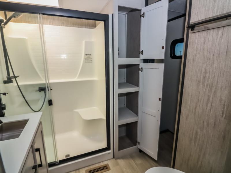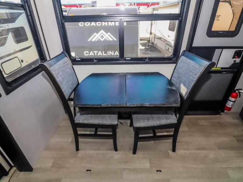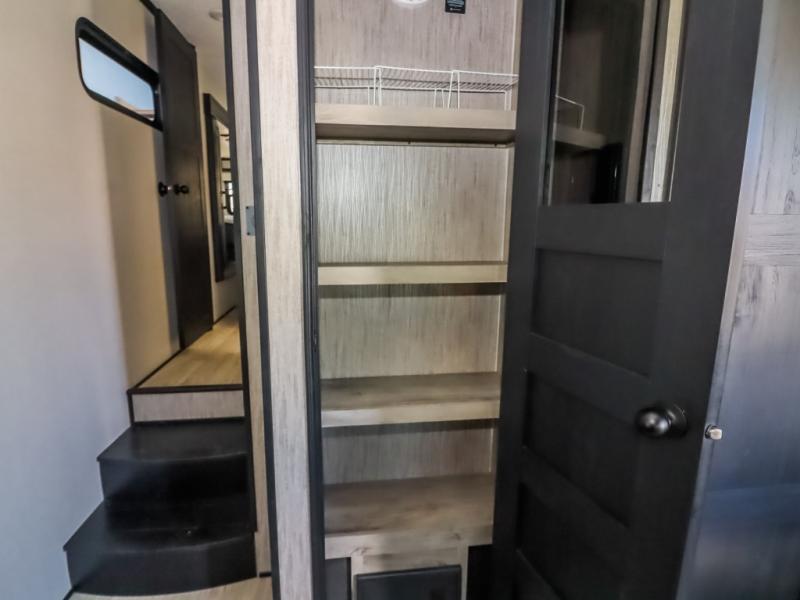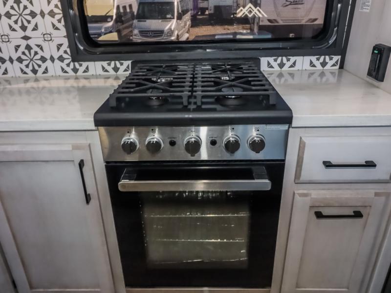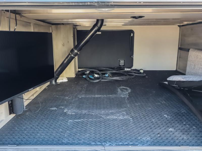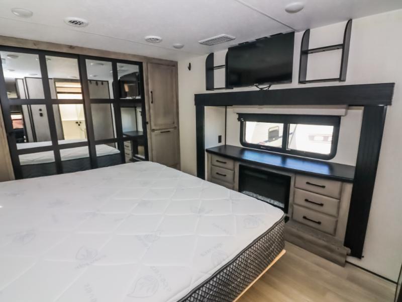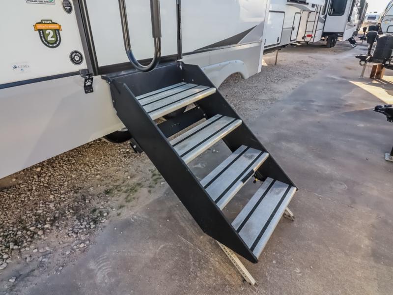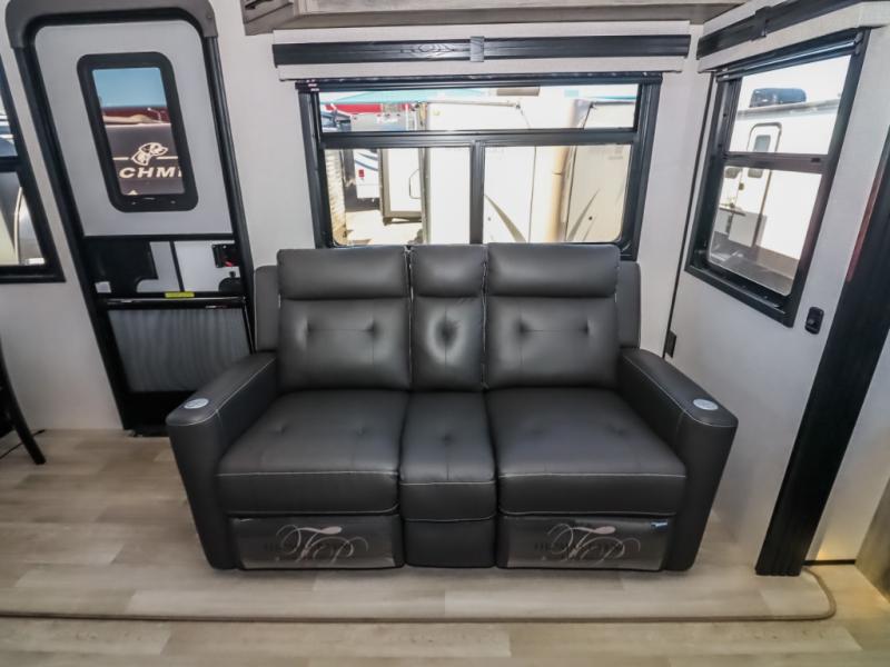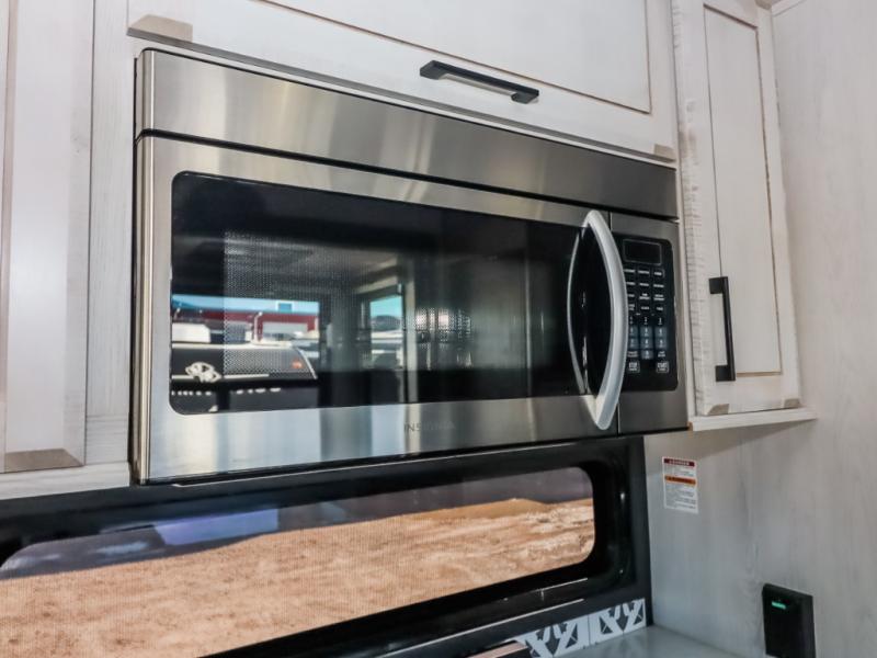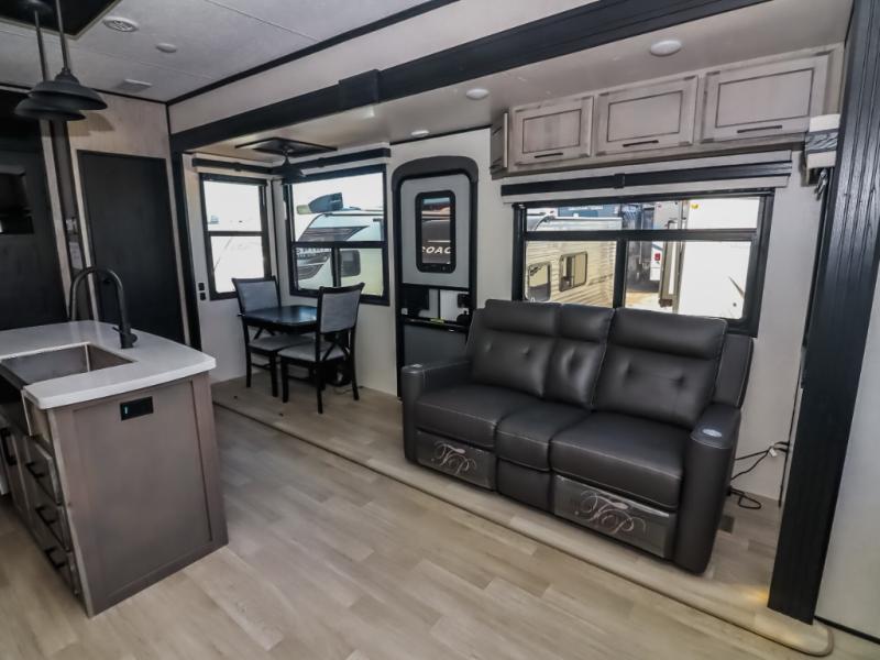 Travel to relax, work, and live in this fifth wheel to experience the ultimate luxury and comfort anywhere you set up camp! The flip-up solid step entry makes it sturdy and safe to enter and exit through the slide out which offers a legless table with chairs on one side and theater seating on the end of it. As you enjoy the spacious living and kitchen area, the cook can make full meals including holiday favorites using the residential appliances, and a farmhouse stainless steel sink in the center island, plus solid surface countertops are both beautiful and easy to clean. There is a pantry as well as washer and dryer prep nearby which both come in handy for storage. You can watch the 50" Smart LED TV with a fireplace below while playing games or working at the dining table or while sitting on any of the furniture. And the hide-a-bed sofa allows you to invite overnight guests to stay.