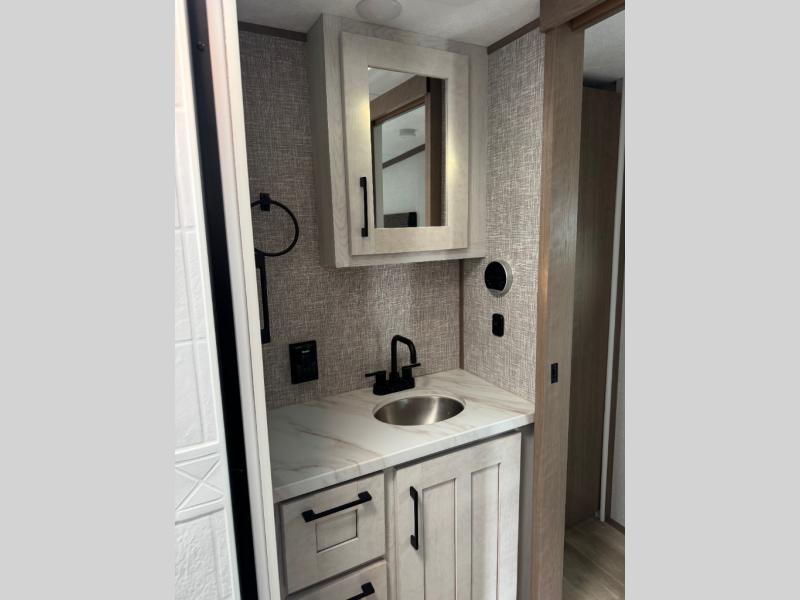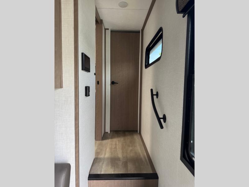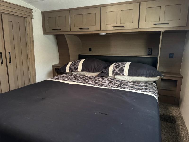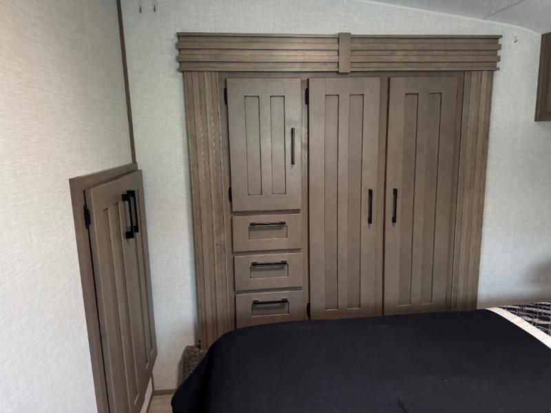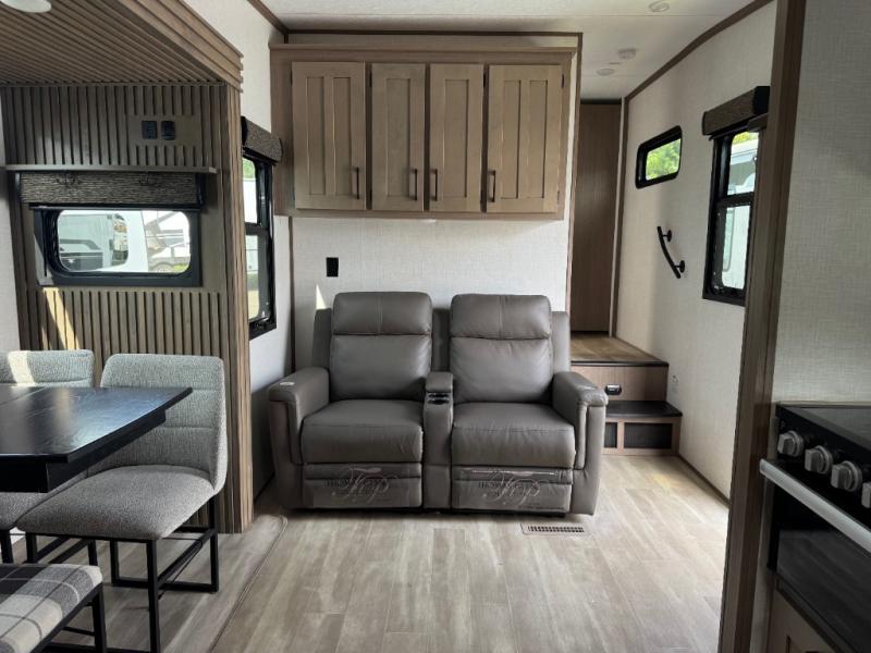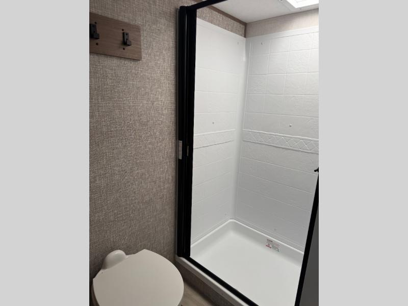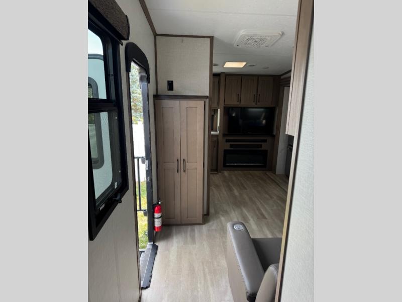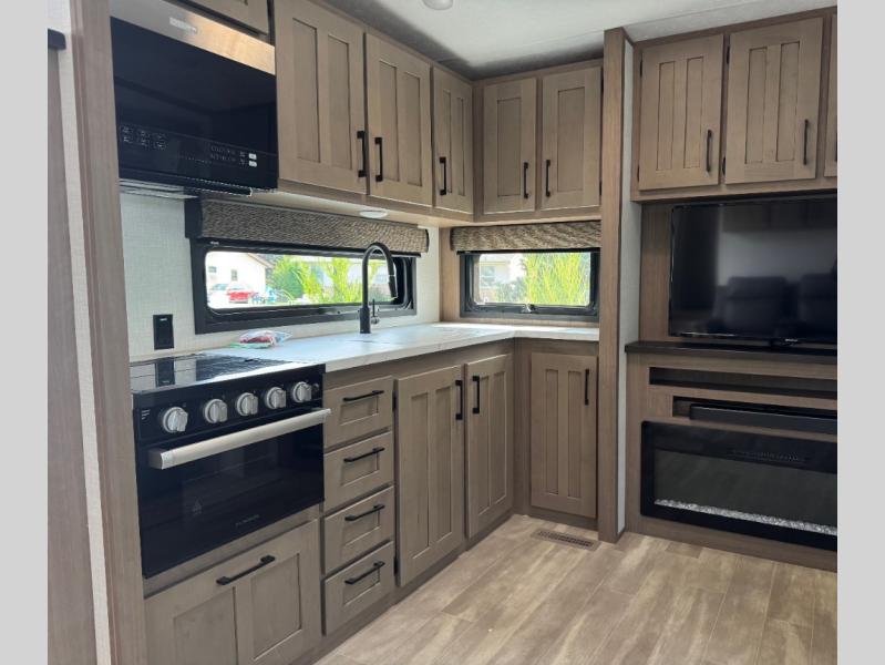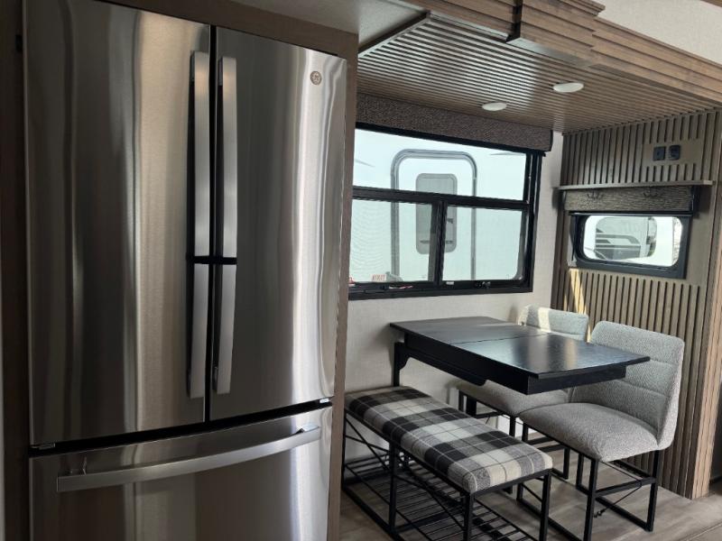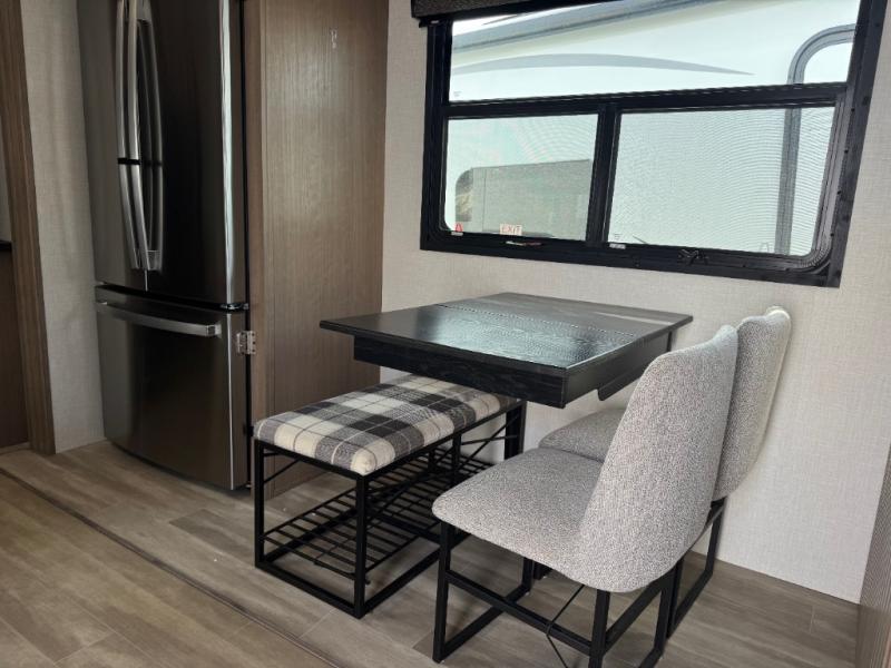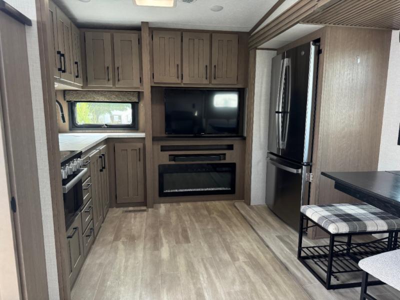 This lightweight fifth wheel is ready for all your excursions or full-time living! There is a front private bedroom with a queen bed, a slide out wardrobe, plus a closet with washer and dryer prep. The full bath includes a 36" x 30" shower with a skylight, a porcelain foot-flush toilet, and counter space to store your items. Head to the main living area where you'll find a legless table, two chairs, and a bench that will be the perfect place to dine at each day. There is also a hide-a-bed sofa for guests to sleep on, or you can choose the optional theater seating in place of the sofa. The entertainment center with a 43" Smart LED TV will provide something to do on those rainy camp days, but if the weather is nice, you may just find yourselves outdoors under the 20' power awning with LED lights. There is also an optional 40" fireplace inside to make your space more cozy. The chef of your group will love the extra counter space in the kitchen, plus a pantry, a closet for storage space, and a spacious 18 cu. ft. house refrigerator!